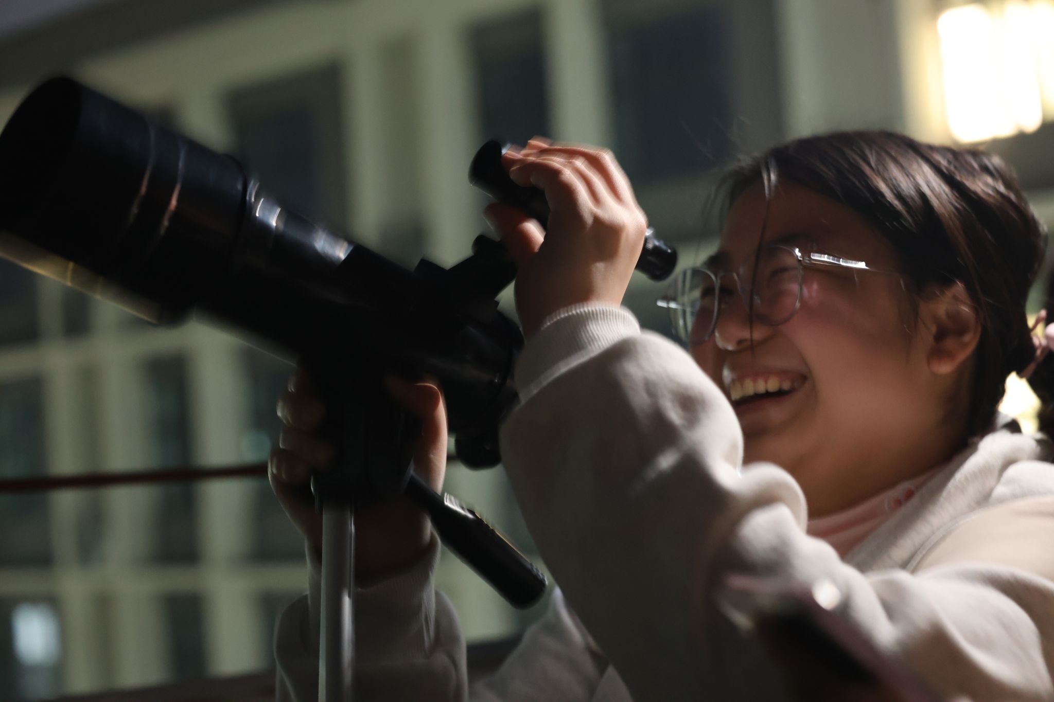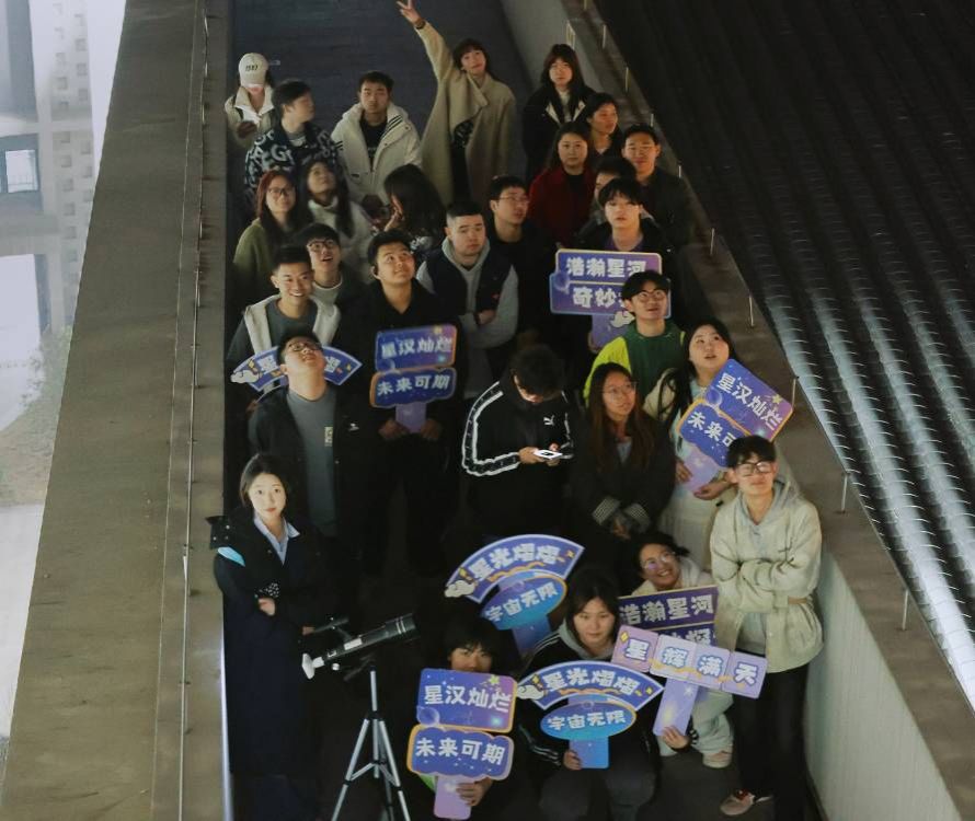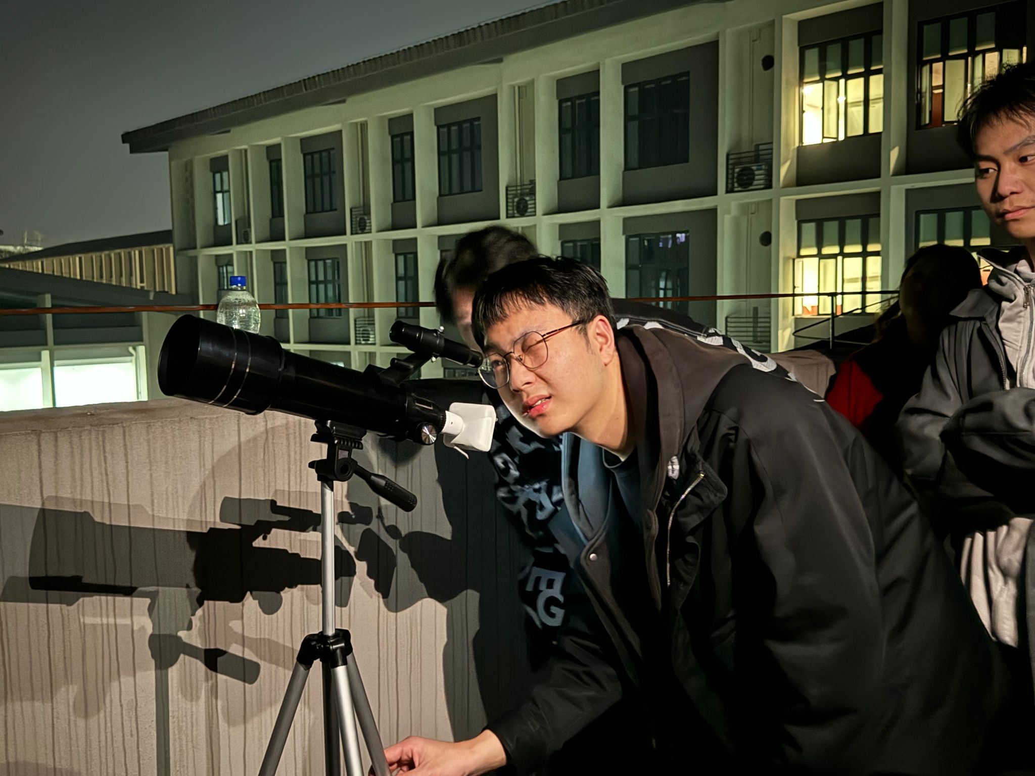 在广袤的夜空下,大家围成一圈,分享各自的观测心得与星空幻想,畅谈着对未知宇宙的向往。“天文观测从来不只是科学。”古剑书院的一位同学抬头憧憬:“我意识到自己与猎户座腰带共享同一批原子时,所有的不安与恐惧都会消融在星光的叙事里。”此刻的天台上,呼出的白雾与星光交融,仿佛无数渺小的生命正以短暂呼吸应答永恒的宇宙频率。