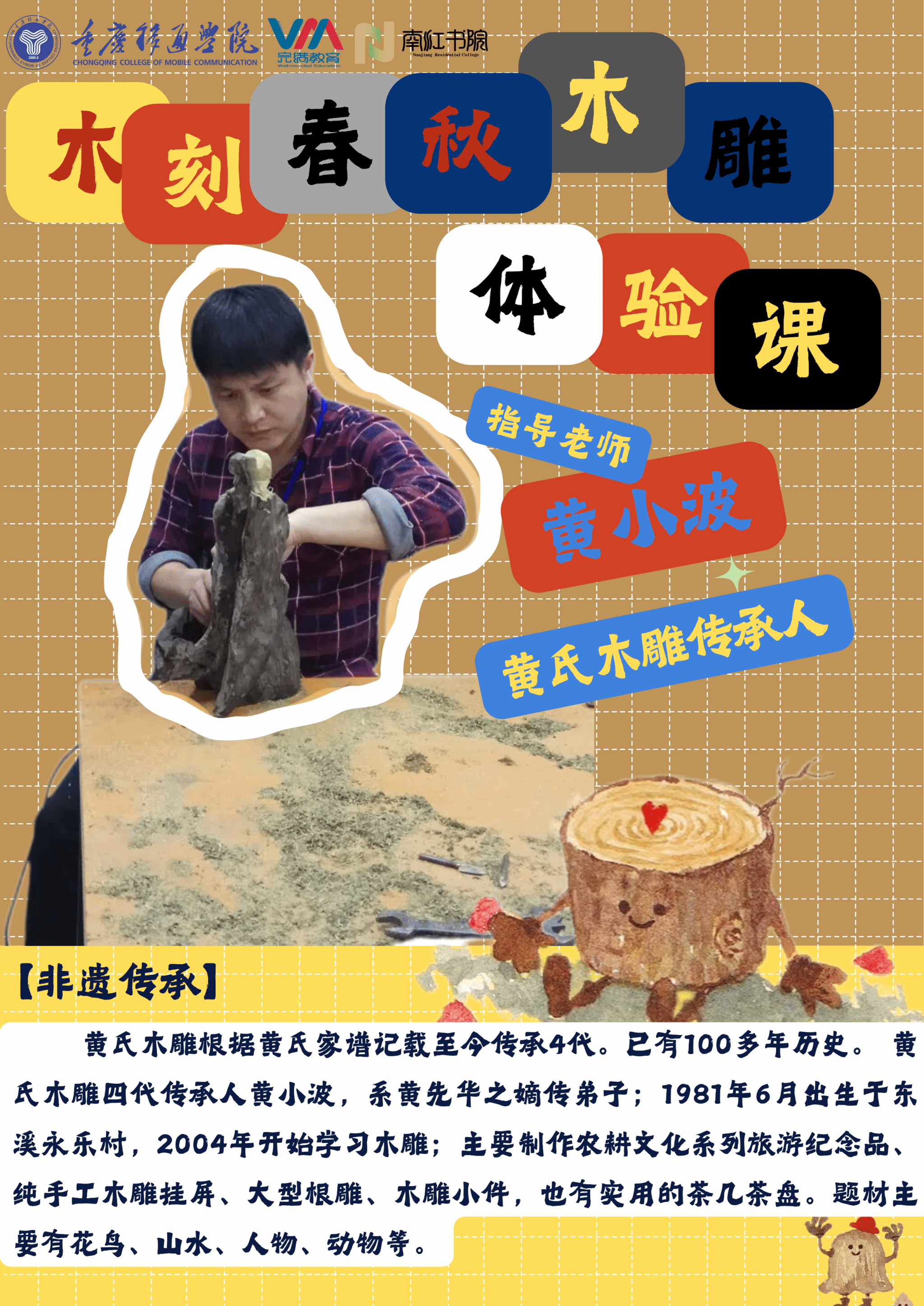 在此,南江有幸邀请到东溪黄氏木雕第四代传人--黄先华之嫡传弟子黄小波:“木雕这件事,就是先感性再理性再感性的过程”。课堂上,黄师傅将倾囊相授,带领大家走进木雕艺术的奇妙殿堂,领略这门古老技艺的独特魅力。