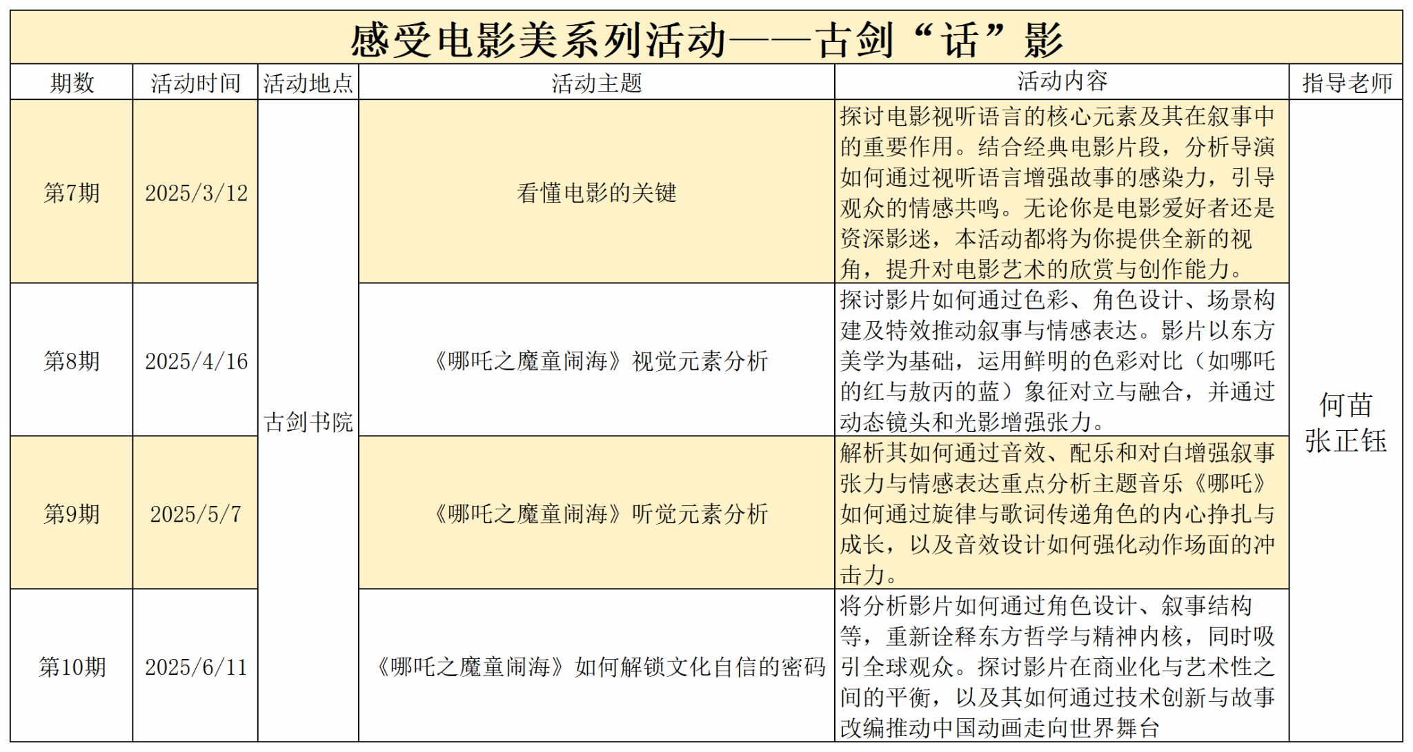 从领导力感受力出发,立足于捕捉、解析、表达的培养基点,结合美育素质教育,从电影美学的综合性方面针对热门电影逐帧展开解析,带领书院学子感受电影美。本学期课程计划通过一学期的时间,分别从影像美学、音乐与声音美学、文化与社会美学等方面逐帧剖析热门电影《哪吒》,感受电影美学。