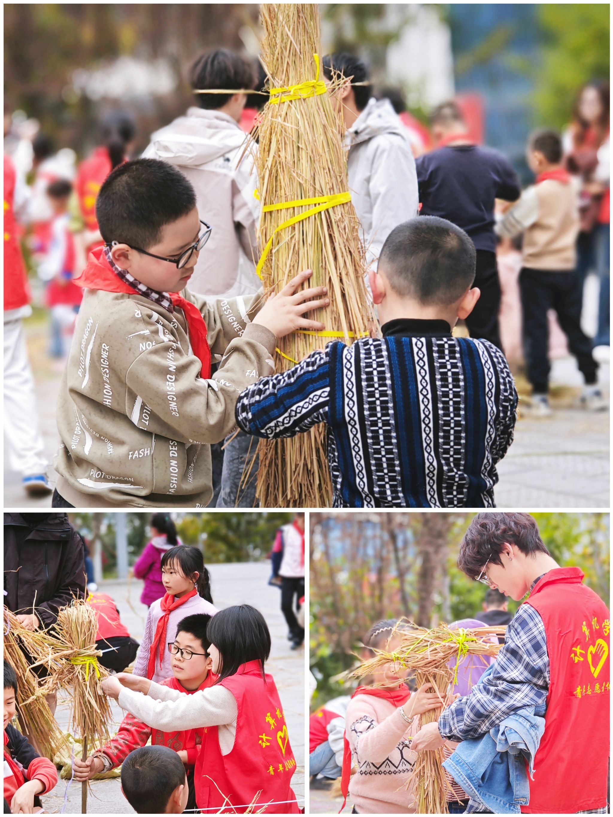 在田野上,稻草人被赋予了守护者的象征意义。志愿者们细致讲解如何挑选稻草、编织骨架并固定,孩子们兴致勃勃地参与其中,灵巧的小手穿梭于稻草之间,仿佛编织着美好的愿望。随着稻草人逐渐成形,孩子们为它们穿上衣物、戴上草帽,甚至用彩笔“画”上笑脸,让稻草人焕发生机。当稻草人挺立在田野上时,它们仿佛化身为土地的守护者,静静注视着这片充满希望的土壤。孩子们围绕在稻草人旁,用稚嫩的声音许下心愿:“希望它们保护好小苗,让它们快快长大!”这一刻,稻草人不仅是农田的卫士,更是孩子们对自然、劳动与未来的美好寄托。