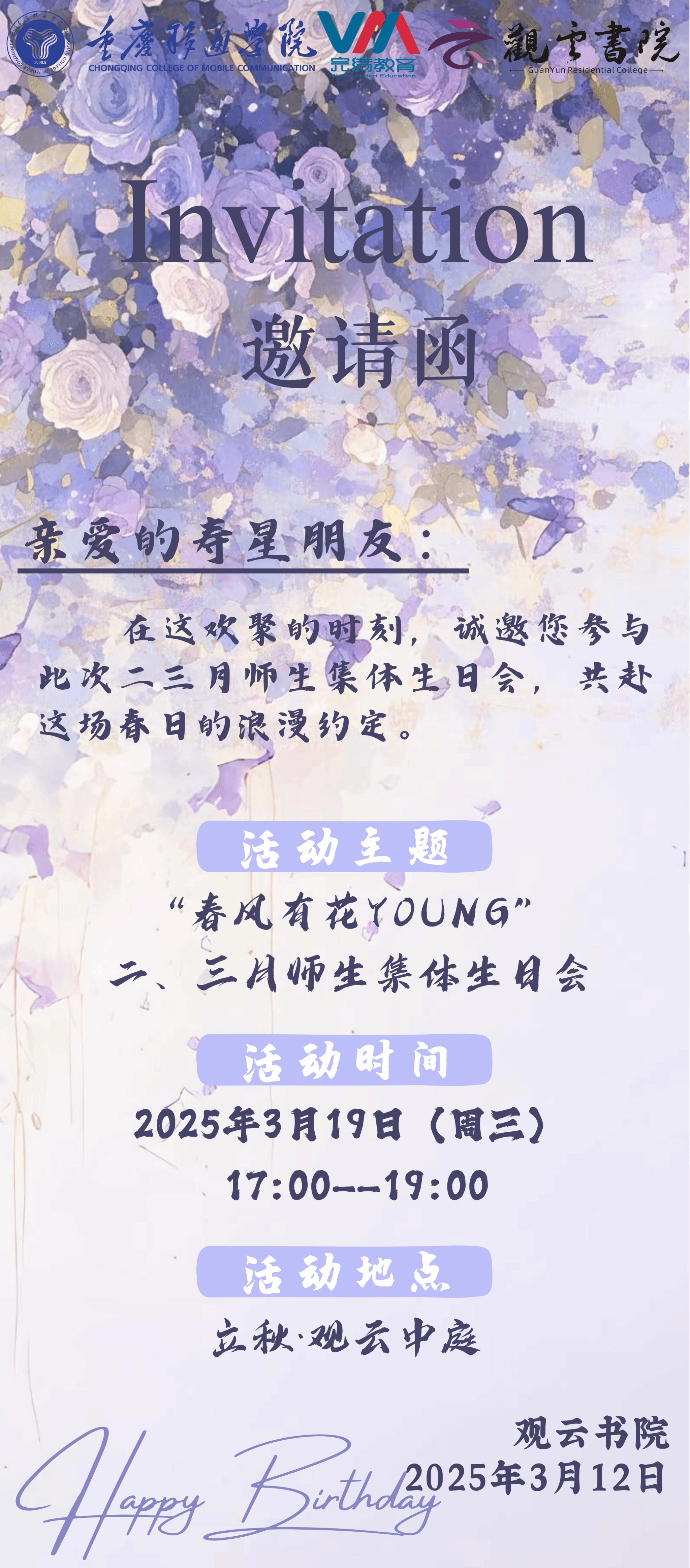 「春风有花YOUNG」由重庆移通学院工会委员会、重庆移通学院书院部主办,重庆移通学院观云书院承办的二三月师生集体生日会火热上线!蝴蝶许愿、青团手作、千份浪漫待签收~