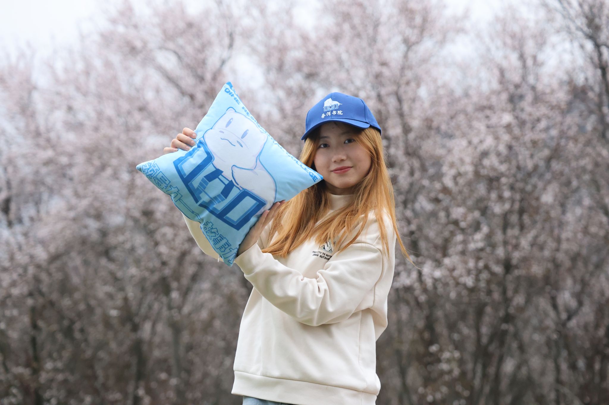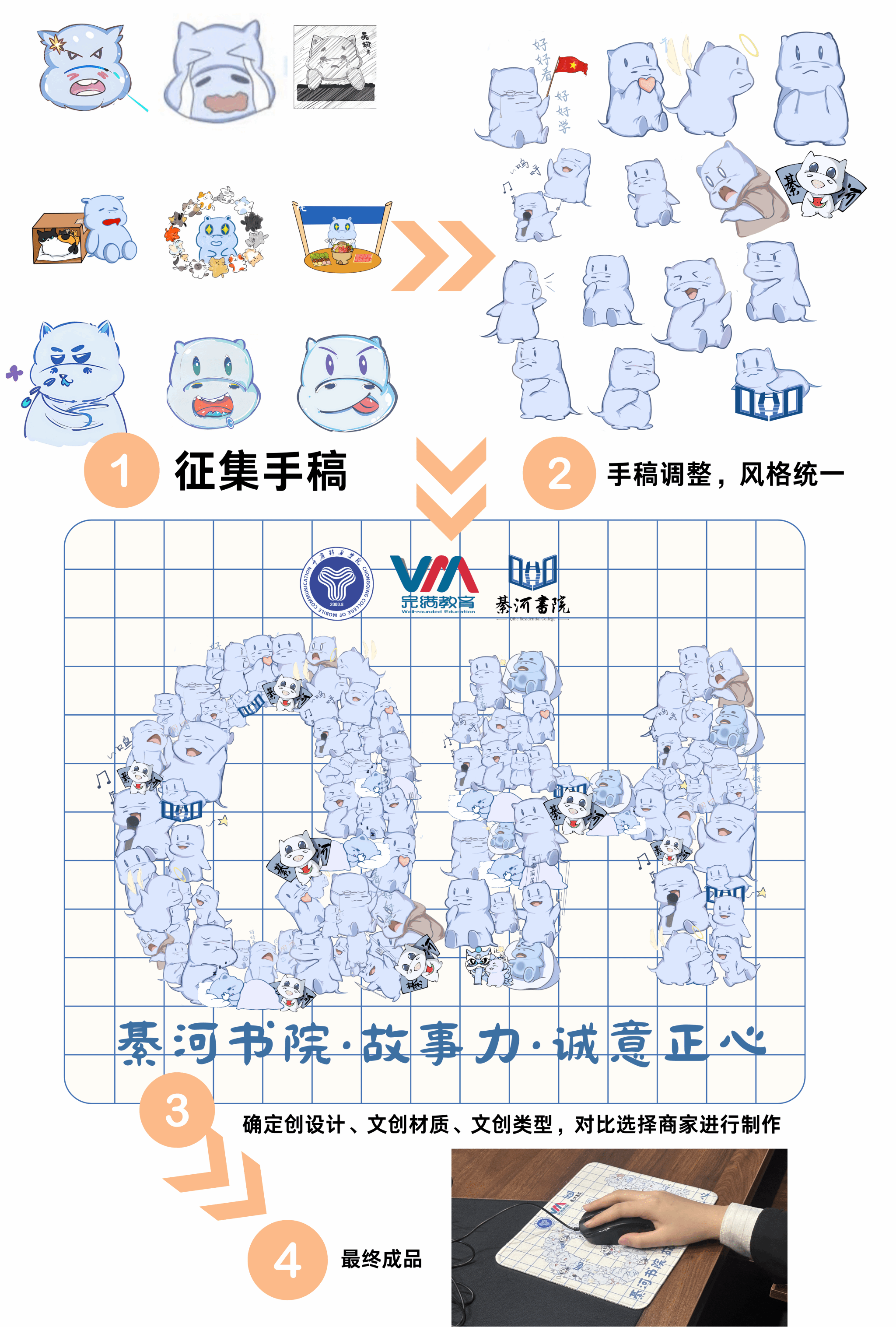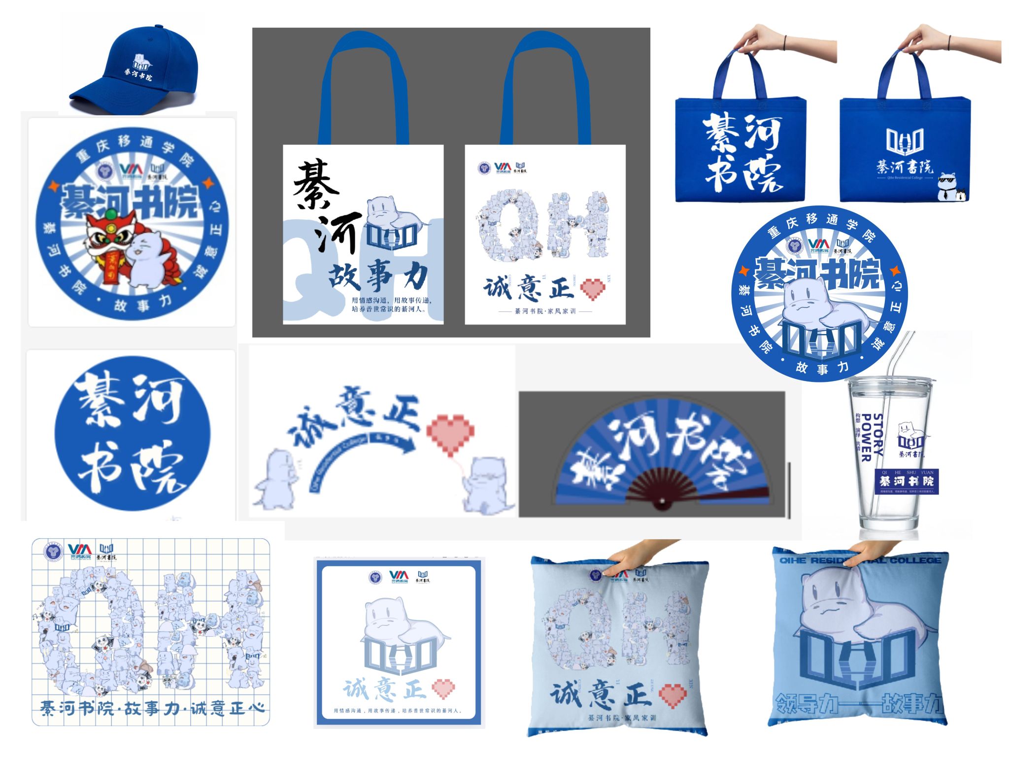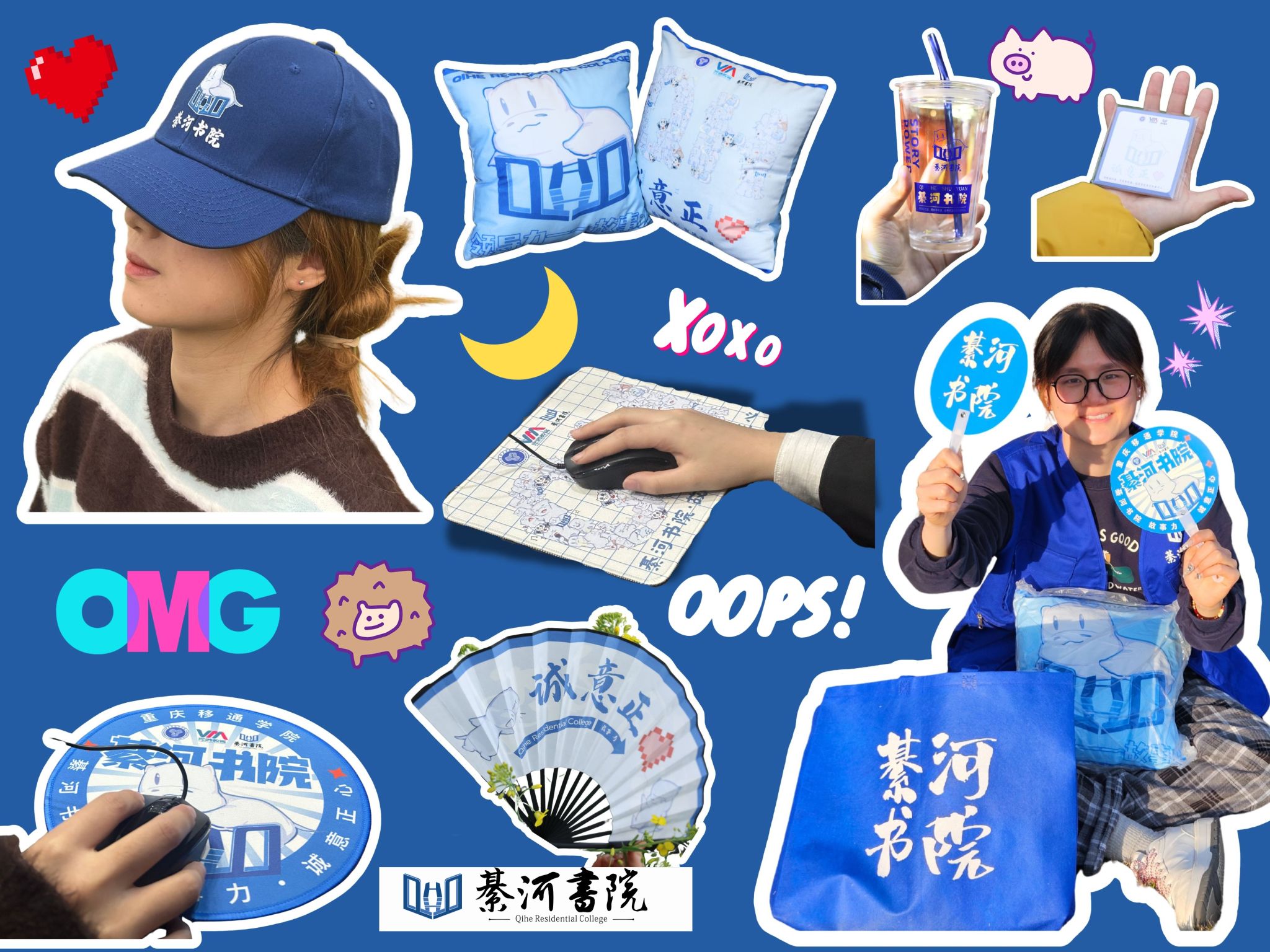 走进工坊,首先映入眼帘的是“綦河记忆”系列文创。以书院主色调藏蓝为基底,憨厚可爱的河马先生化身文化使者,在不同载体上演绎着独特的书院精神。整个系列采用蓝白简约风格,精心设计并制作了包括玻璃杯、帽子、折扇、圆扇、抱枕、鼠标垫、便签纸及便利贴等超过二十种作品。每一件作品都是同学们和老师们智慧与心血的结晶,经历了无数次对比与优化,才最终得以完美呈现。