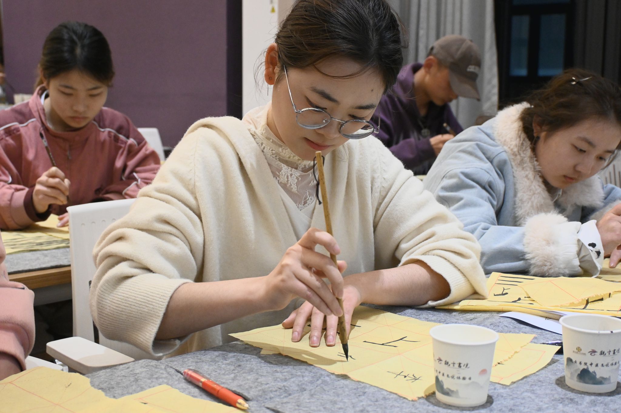 课程中,李楠琦老师将丰富的教学经验和独特的教学方法带入课堂,希望能让更多同学掌握书法要领,写出好的字。他认为,能取得这样的教学成果,源于版面设计、师生间的缘分、自身深厚功力以及独特才情等多方面因素。他还强调,长期坚持练习书法益处颇多,比如在制作面试简历时,一手漂亮的字能为大学生在就业竞争中加分。现场同学们跃跃欲试,认真聆听李老师的讲解。
