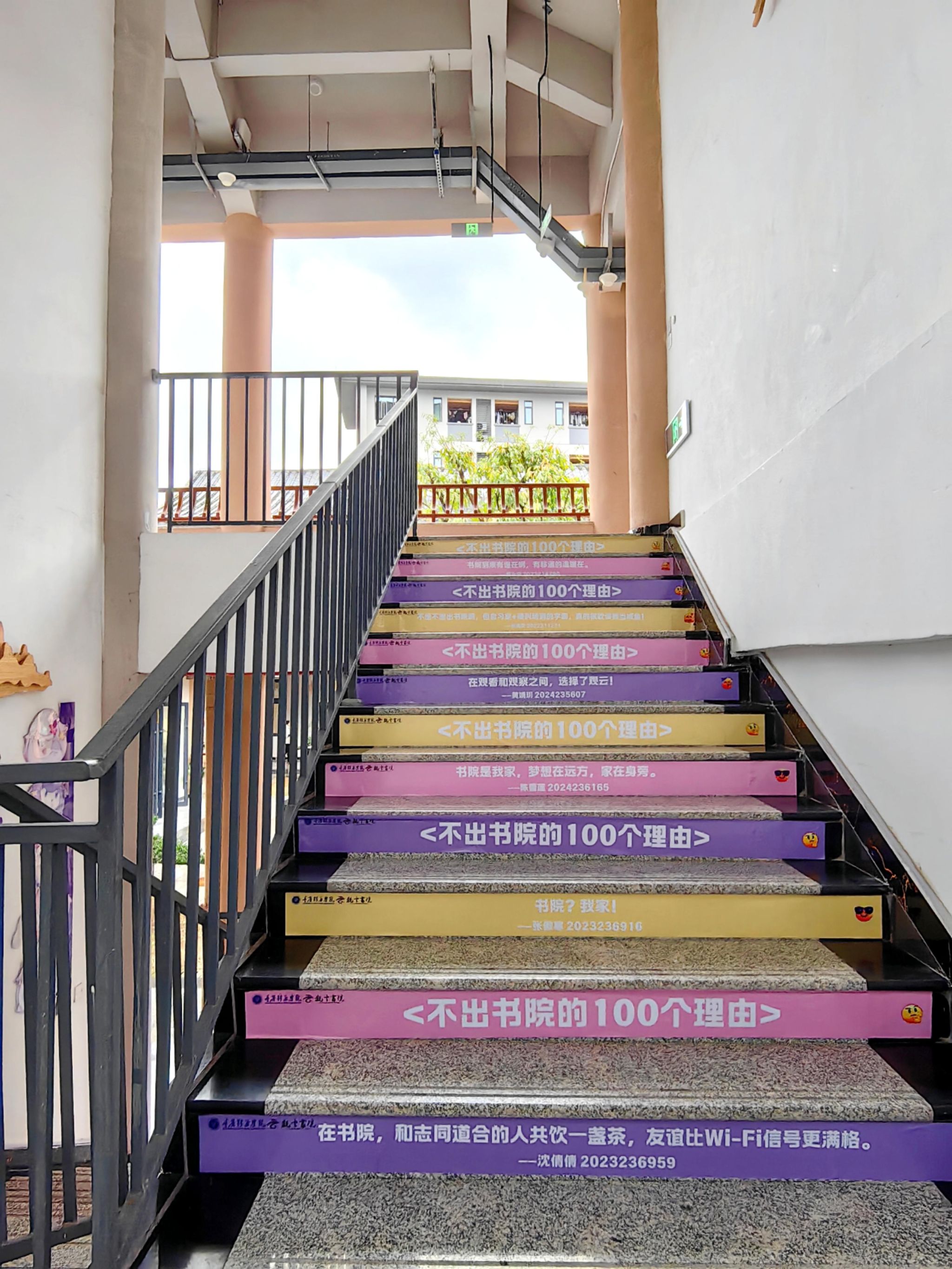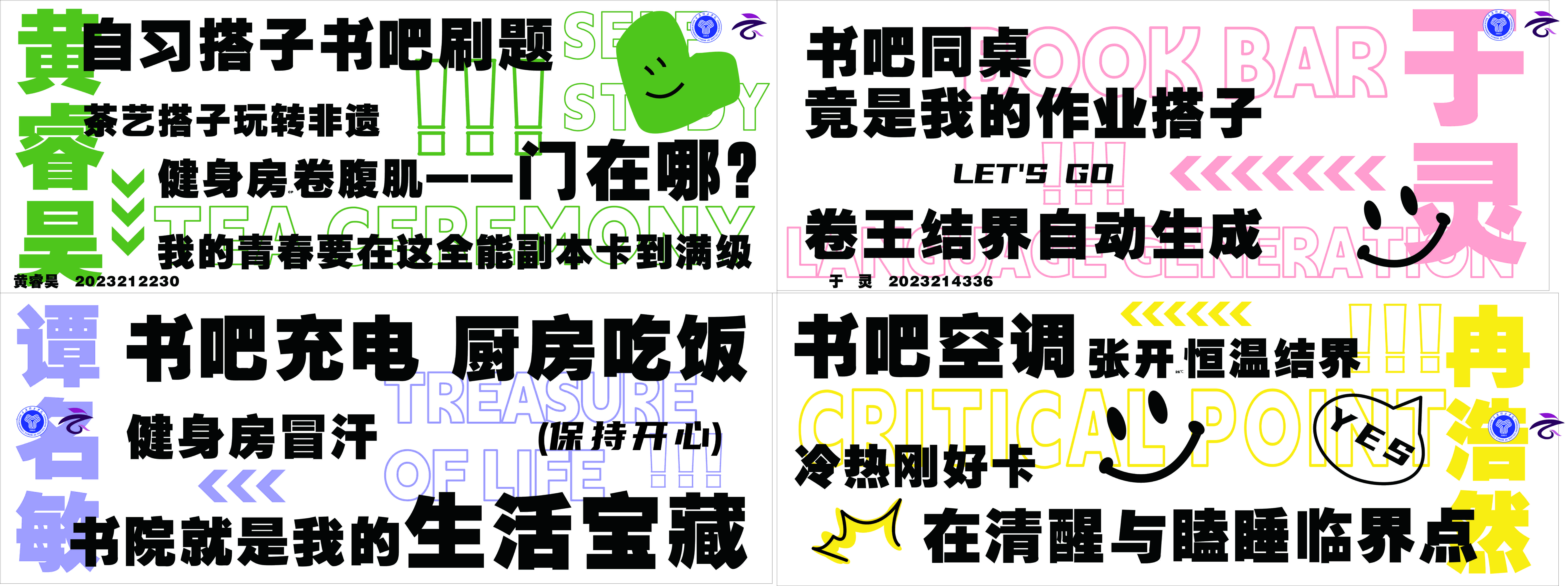 “这些句子就是我们生活的‘弹幕’啊!”目前,30余组入选文案已化身装饰,悄悄驻扎在观云书院各个角落。这些文案不是简单的标语,而是同学们独特的空间叙事。当茶香混着墨香成为自习日常,当健身房里的器械碰撞声与书吧里的资料翻页声交织成背景音,同学们正在用生活笔触重新定义书院生活的滋味。