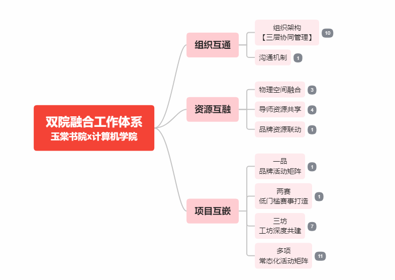 双院融合计划已推行数月,玉棠书院基于与计算机学院的合作也不断梳理工作体系,会上,双院就融合工作体系开展探讨。玉棠书院提出以“组织互通、资源互享、项目互嵌”为核心的合作模式,旨在打破边界,构建双院协同网络。周俊副院长提出了“一品两赛三坊N项”的构想。通过一个品牌理念、两项竞赛、三个项目工坊、N个特色项目,打造双院特色,满足学生多元化的需求。