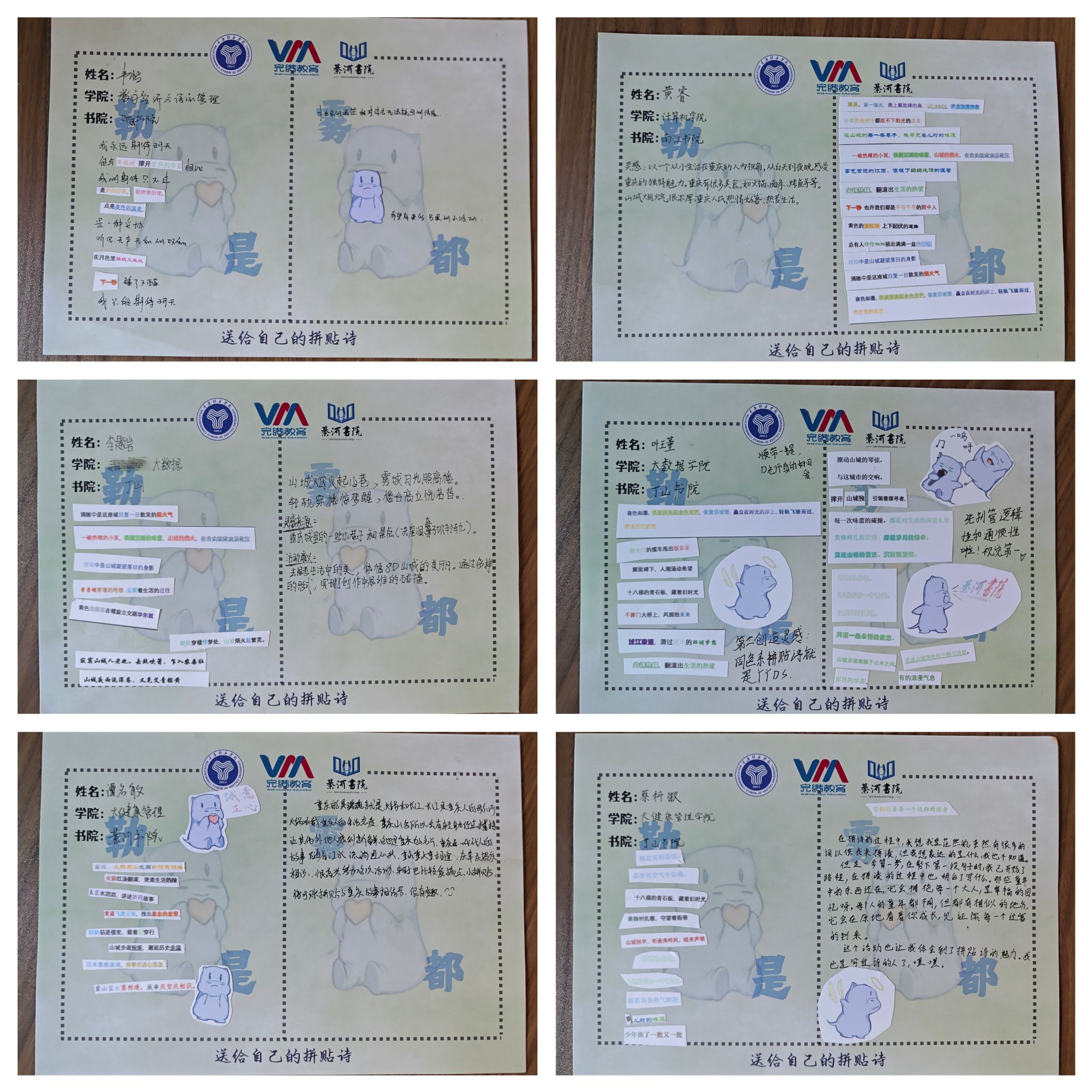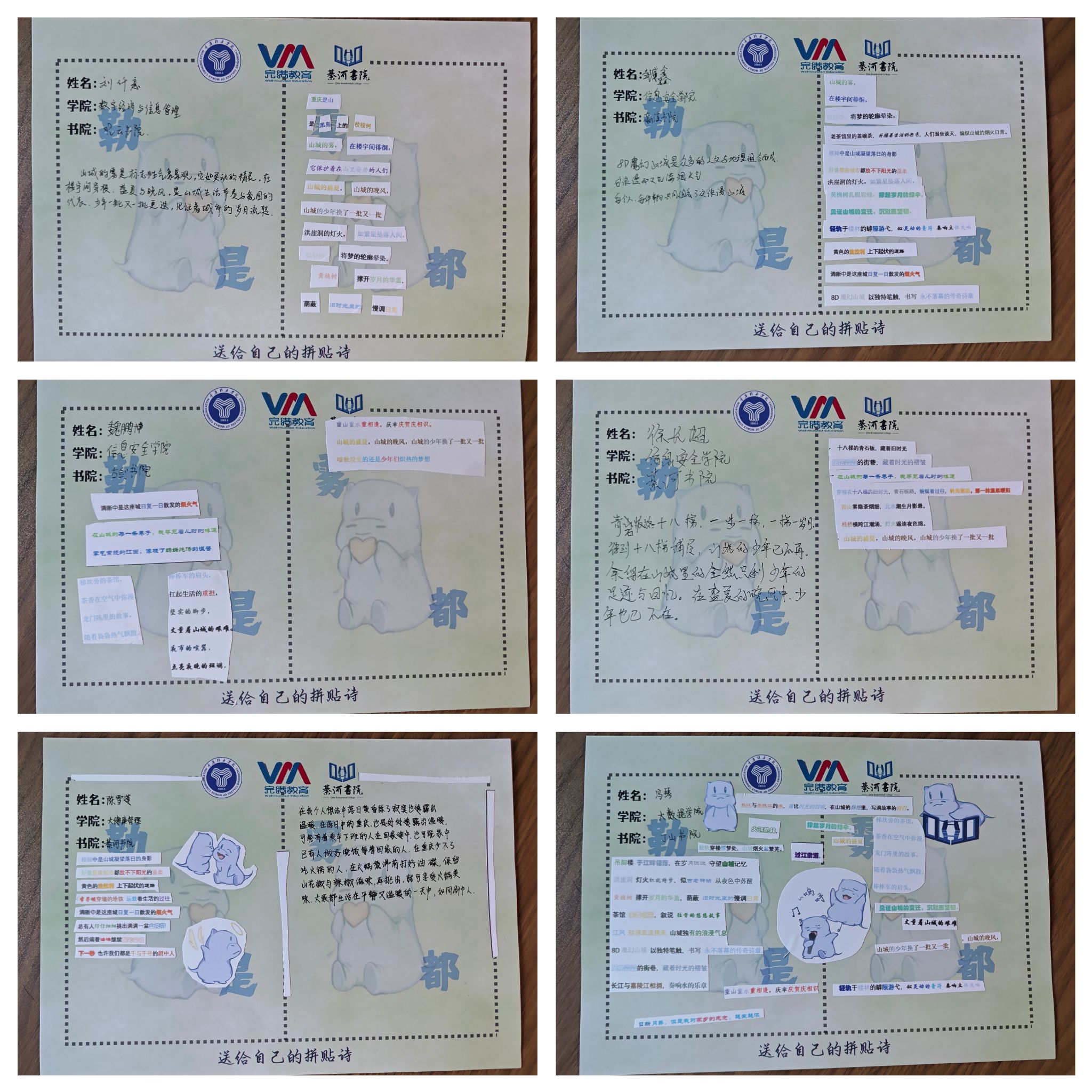 山与城的相拥、雾与都的缠绵、魔幻与日常的交织里,重庆用一城烟雨一楼台,一街烟火一世界编织着独特的记忆。此次活动在同学们的创作分享中圆满落幕,用拼贴的方式再现重庆记忆,用分享的方式传递重庆故事,綦河书院以“构想、共情”为核心,让文字有温度,让故事有载体,未来綦河书院也将继续选取更能触动同学们心灵思维的主题,用趣味创新的形式带领同学们感受社会与文化的魅力,于故事接收中内化再输出。