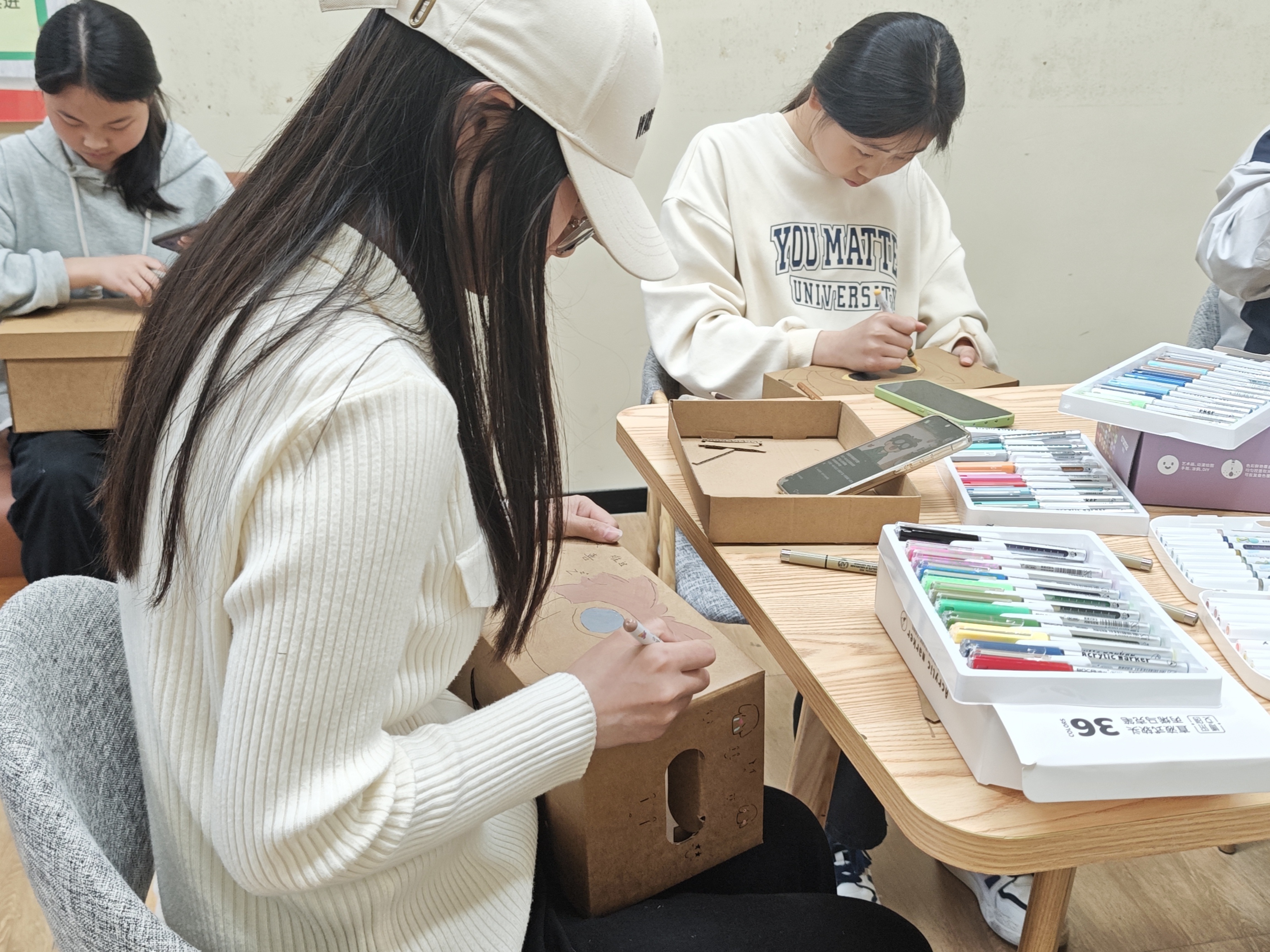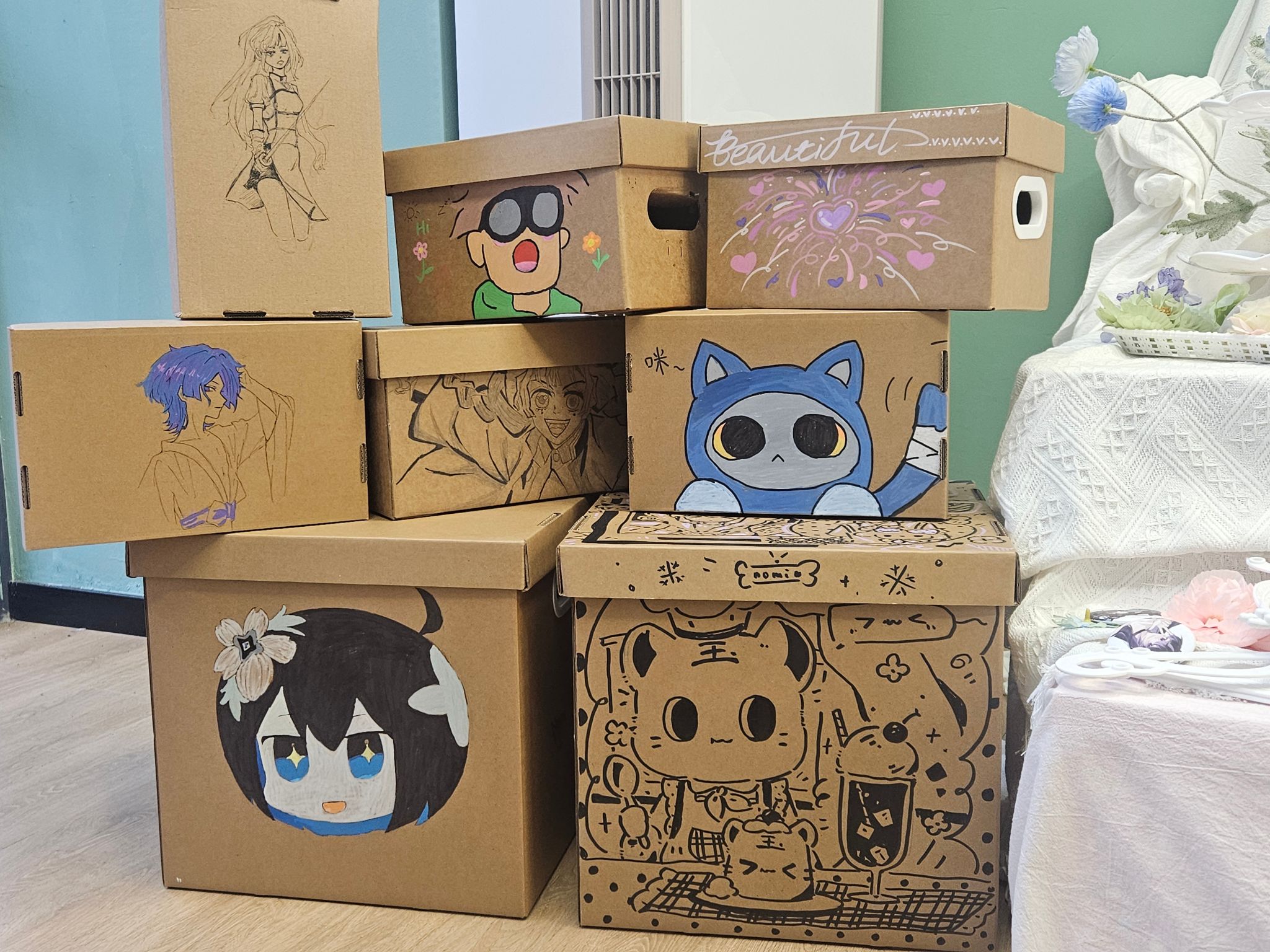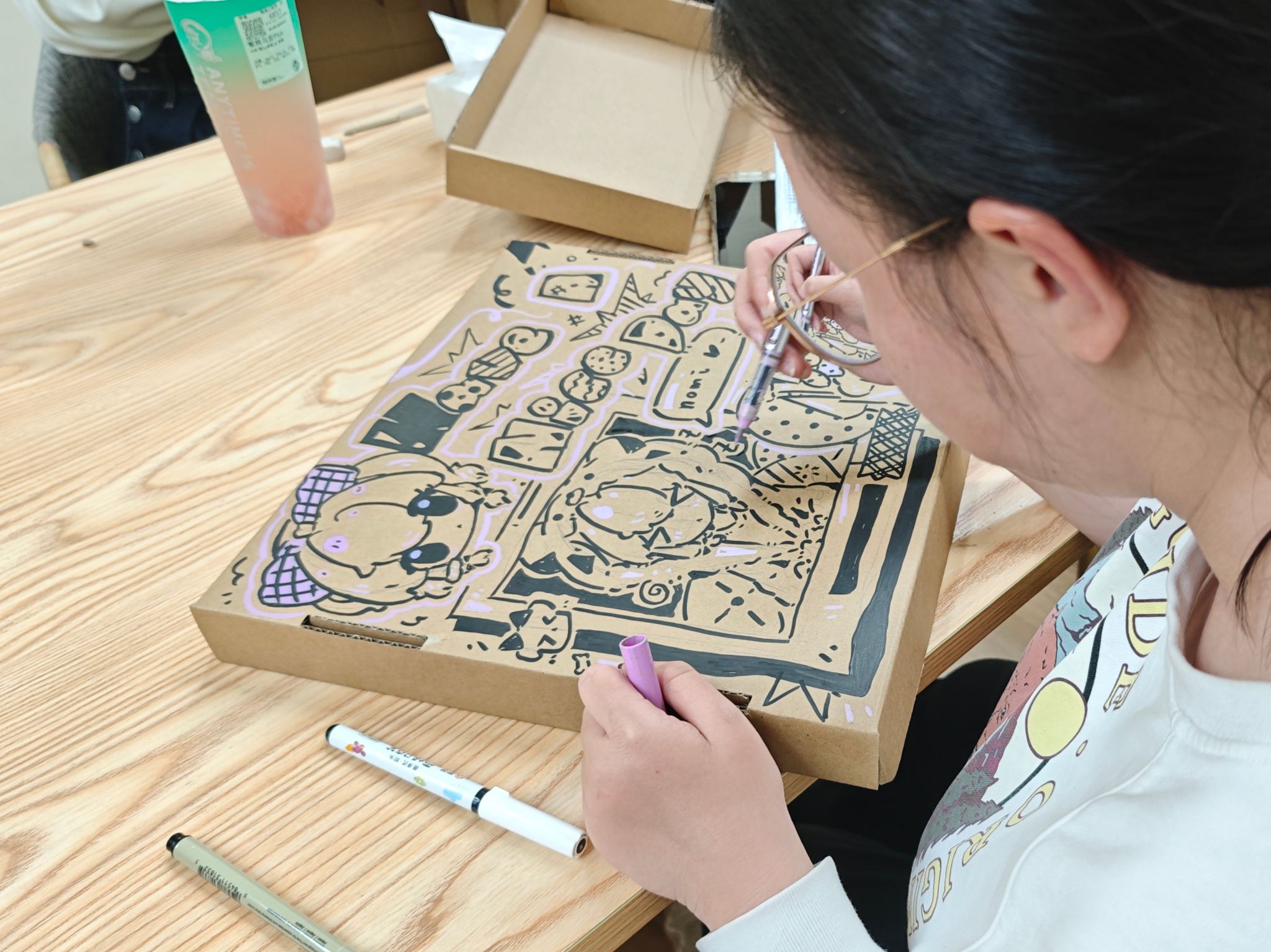 活动现场,同学们以个人或团队的形式投入创作。丙烯颜料、马克笔、喷漆等材料在纸盒上交织出多样的风格——有的作品以动漫角色为灵感,笔触细腻;有的结合社会热点,表达深刻思考;还有的采用抽象构图,用大胆的线条和色彩传递情感。