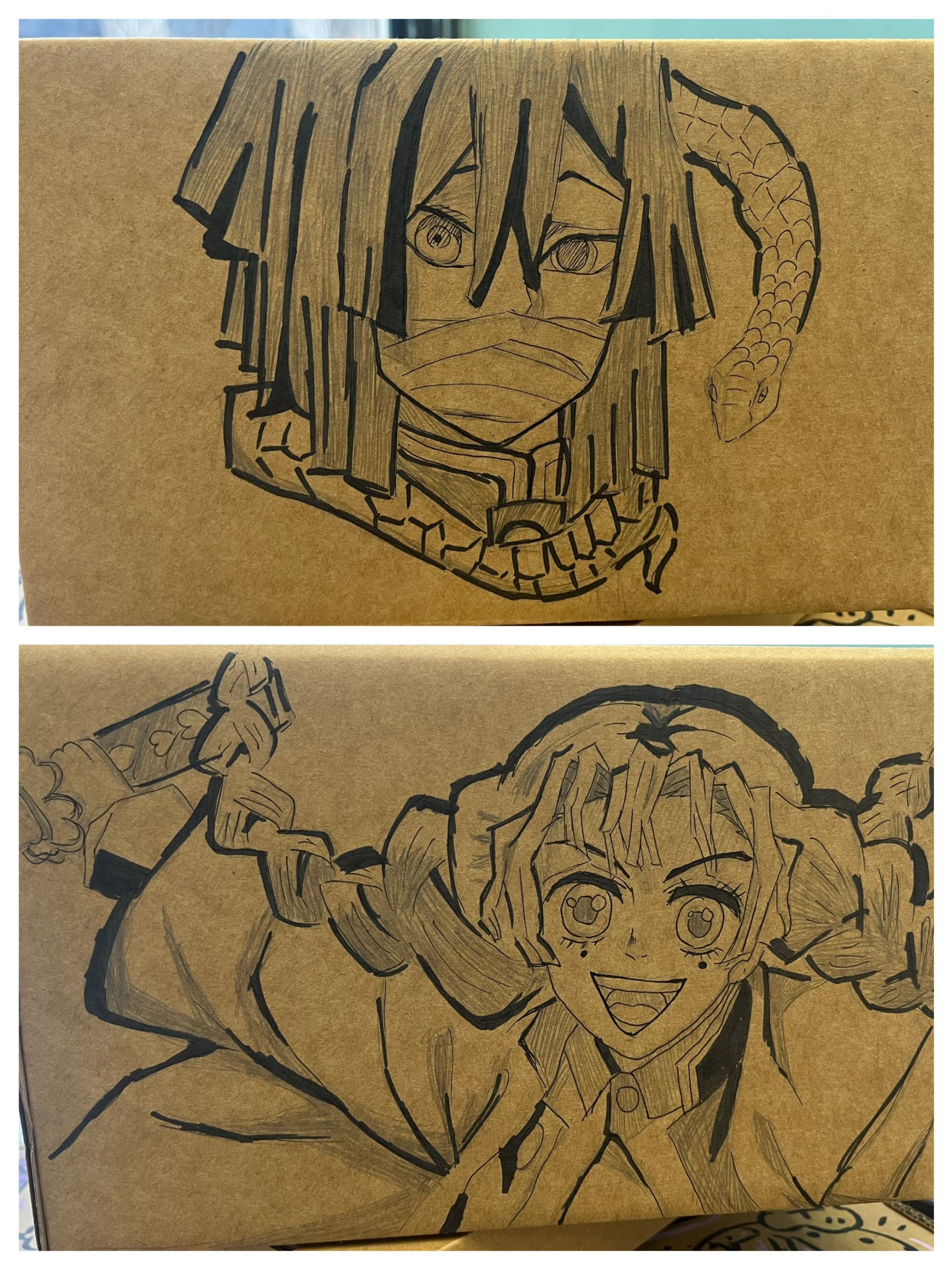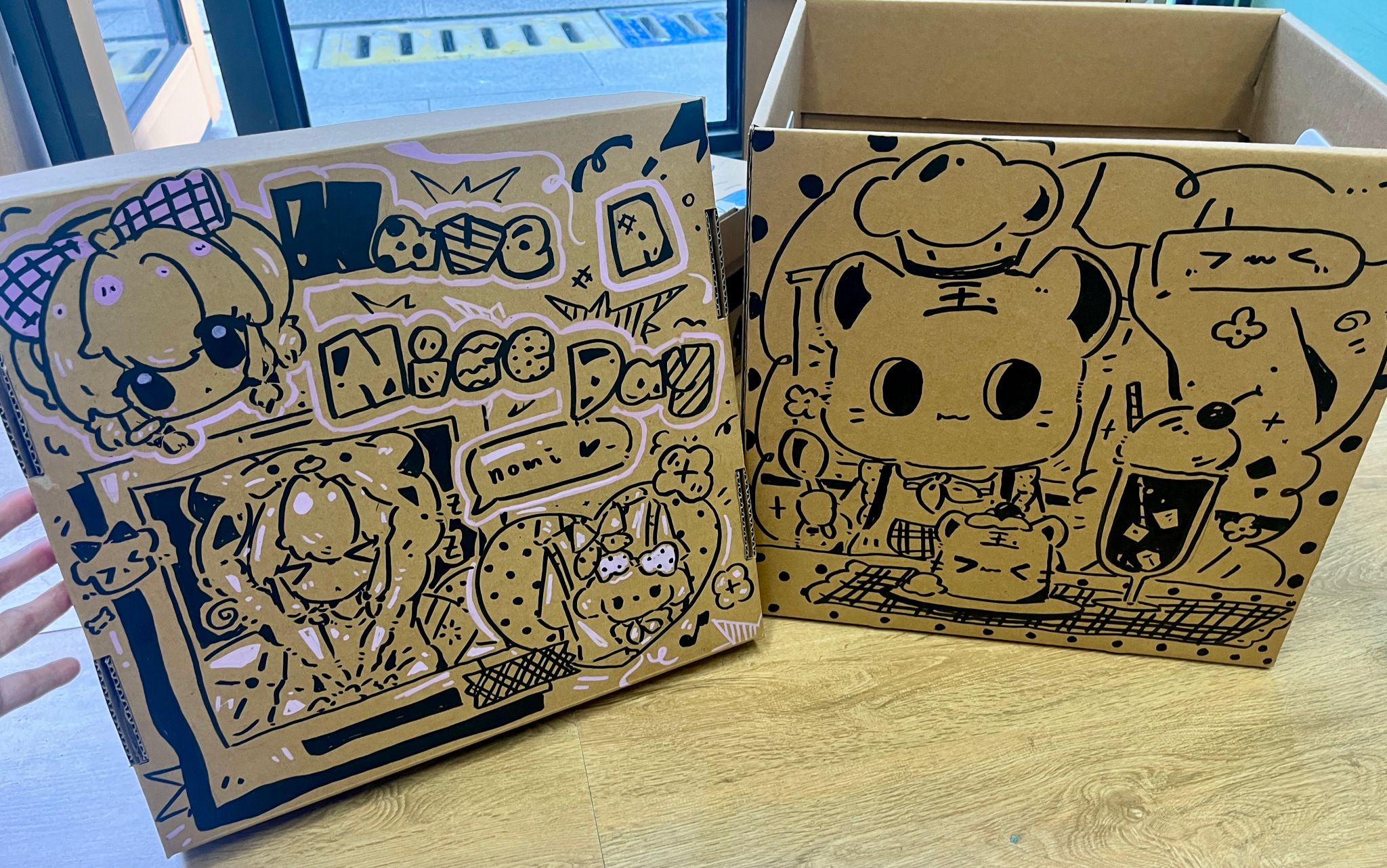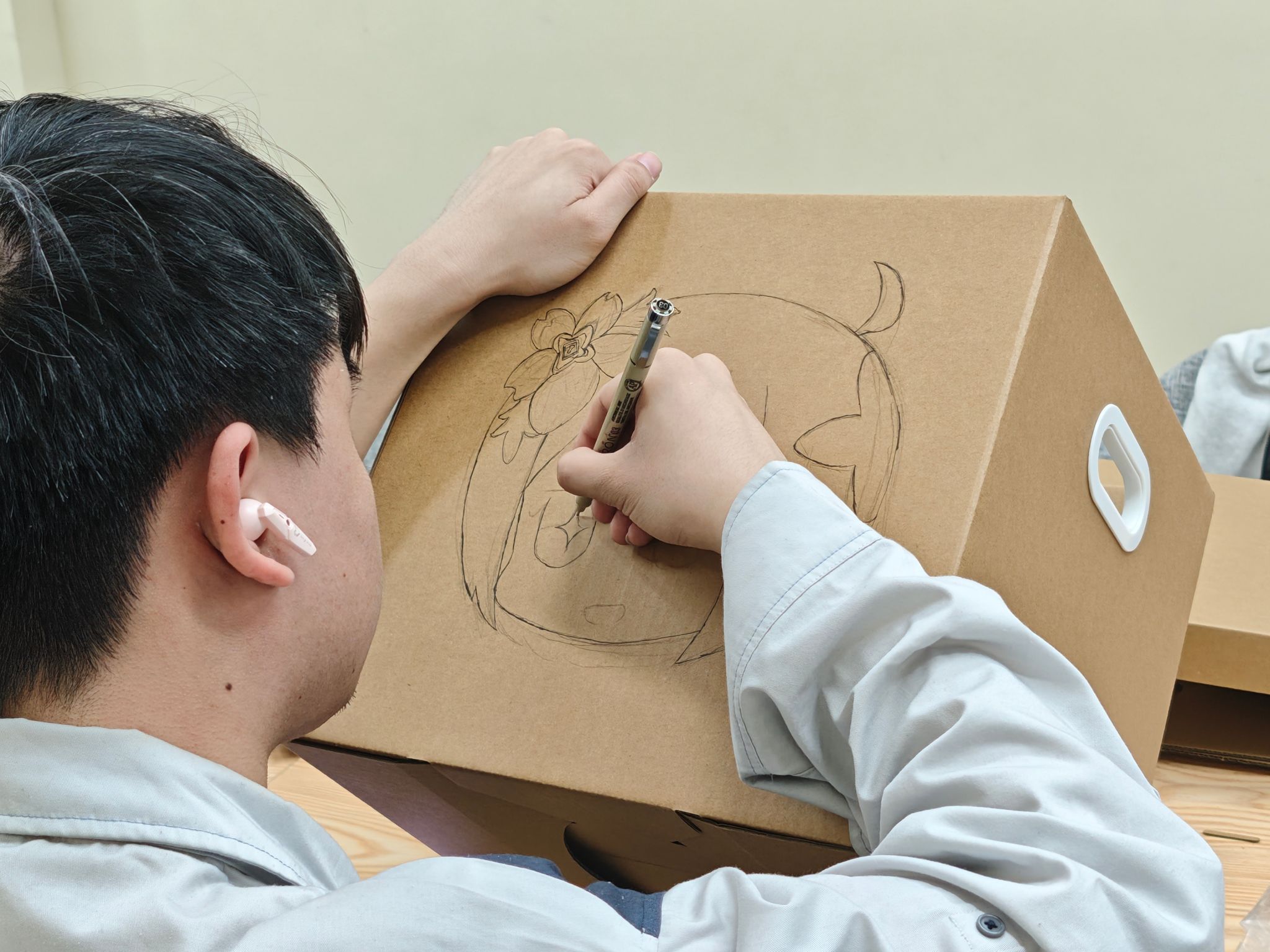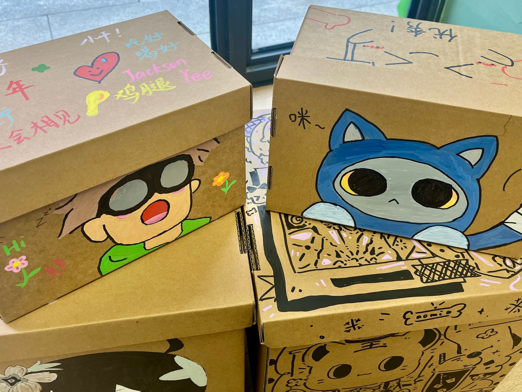 活动现场,同学们以个人或团队的形式投入创作。丙烯颜料、马克笔、喷漆等材料在纸盒上交织出多样的风格——有的作品以动漫角色为灵感,笔触细腻;有的结合社会热点,表达深刻思考;还有的采用抽象构图,用大胆的线条和色彩传递情感。