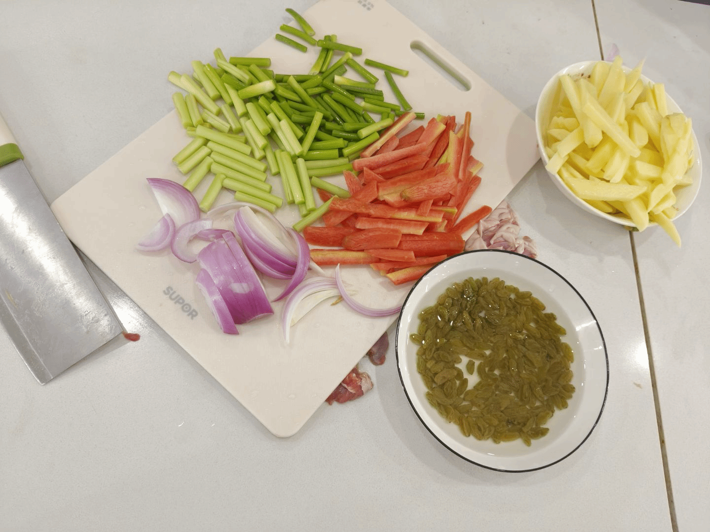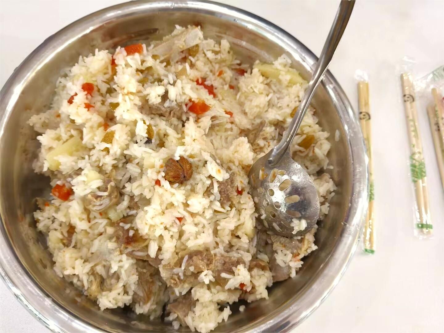 黄萝卜、蒜苔被切好放在案板上;旁边的羊肉块闪着油光,钝刀切割时滑开的纹理让切肉人眉头微皱,围观者指着肉块比划尺寸蒸锅升起的热气把眼镜片蒙成白雾。茶籽油在铁锅里烧出细密气泡,葱段扔进去的刹那,阵阵葱香扑鼻而来。翻炒羊肉的铲子翻起棕白糖色,米粒倒进肉汤时的扑簌声让满屋抽了抽鼻子。蒸锅揭盖瞬间,同学带着手套同时探进白雾,米粒裹着葡萄干的晶莹在指缝淌成金瀑布。有人试图握拳却漏出大半,黏稠的米胶把三两人的手套粘作一团。最底下铲起的焦黄锅巴被传着掰尝,眯眼咀嚼时嘴角翘起的弧度,比葡萄干还甜。