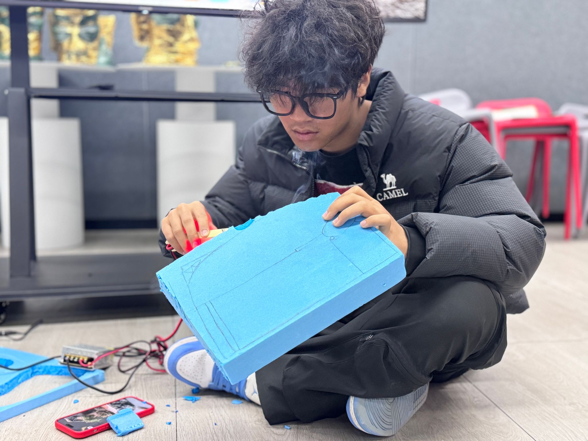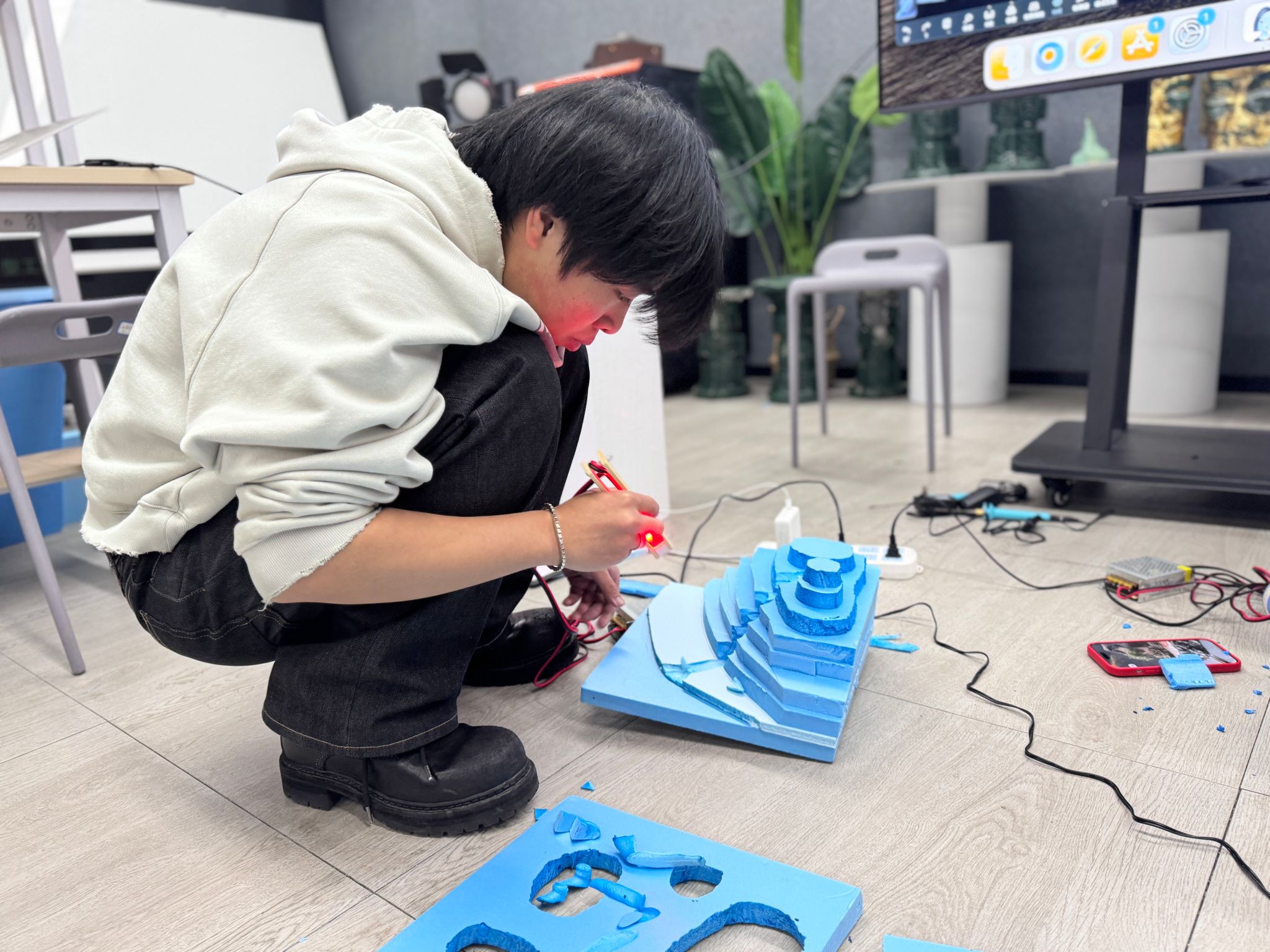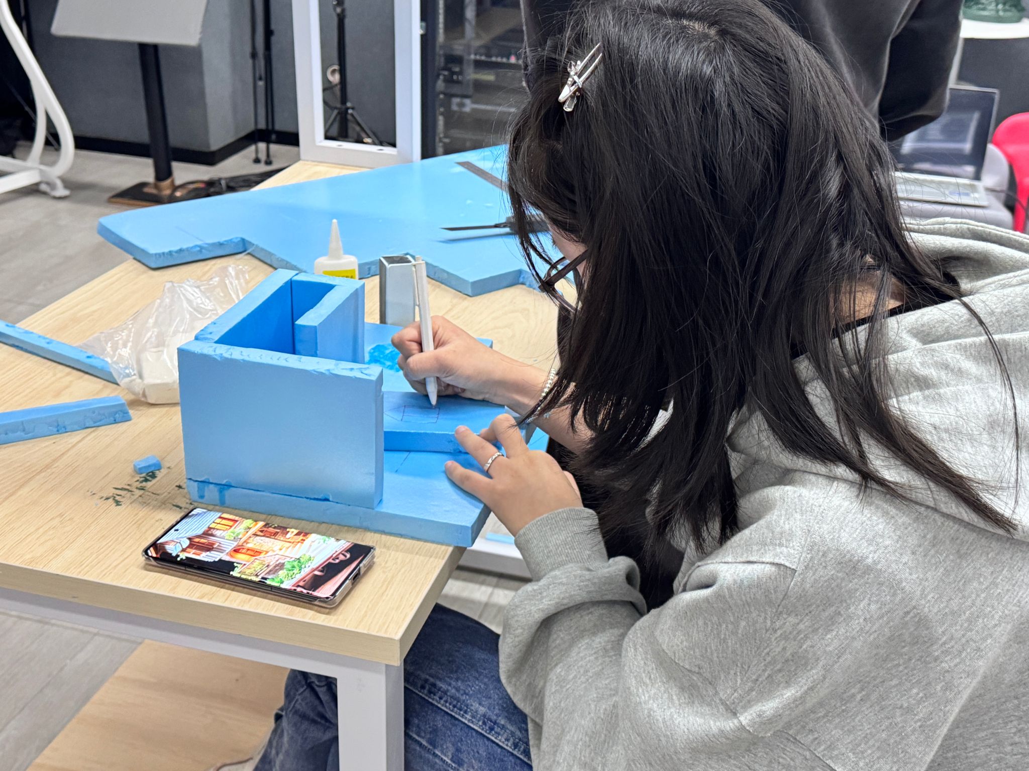 3月28日的实体创作课上,工坊变身为热火朝天的工作间。同学们以高密度板为主要材料,先将数字模型转化为精确图纸,再通过切割、打磨等工序逐步构建实体模型。面对材料拼接、结构稳定等技术难题,在谭老师指导和团队协作下,学员们一一攻克难关,在实践中提升专业技能。