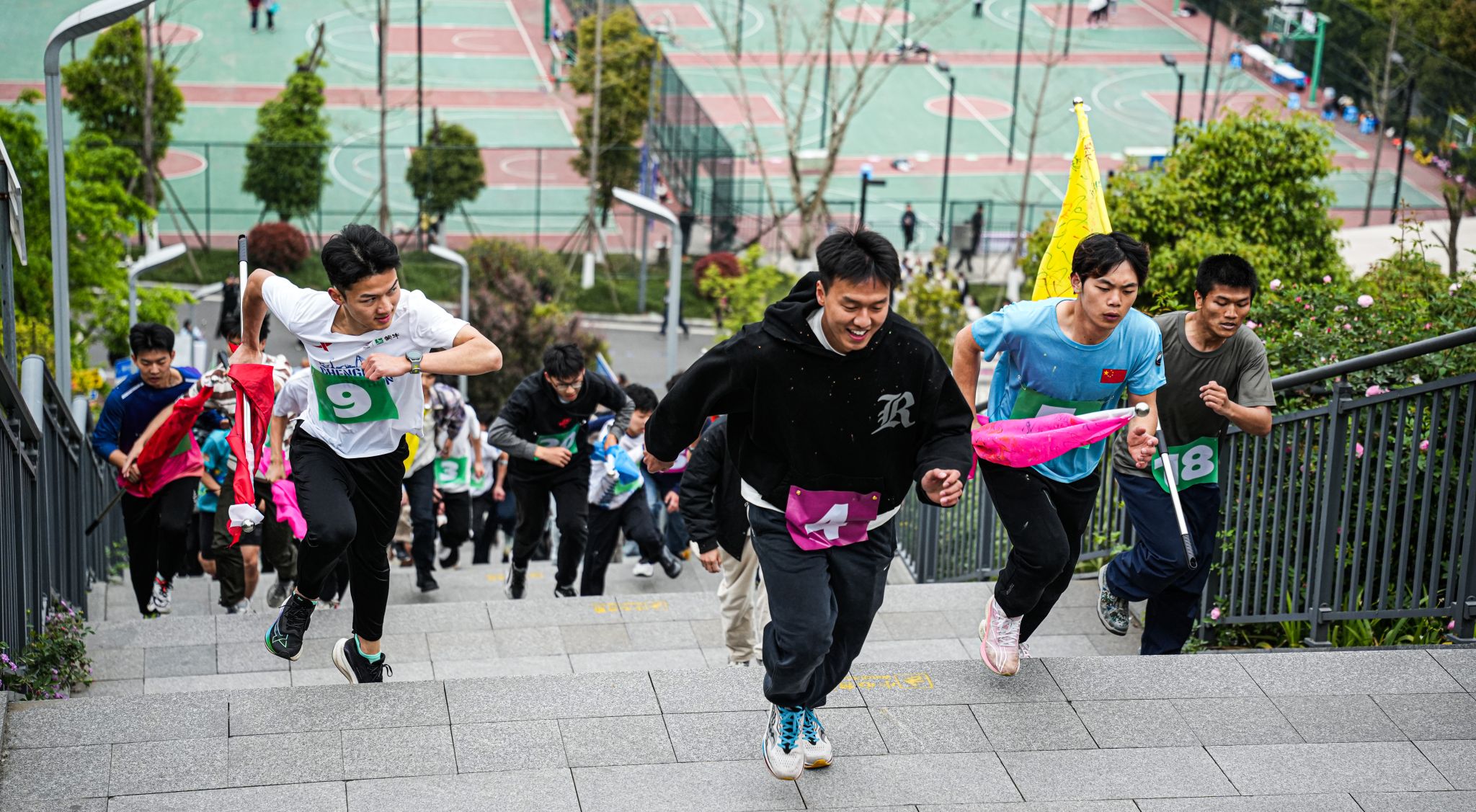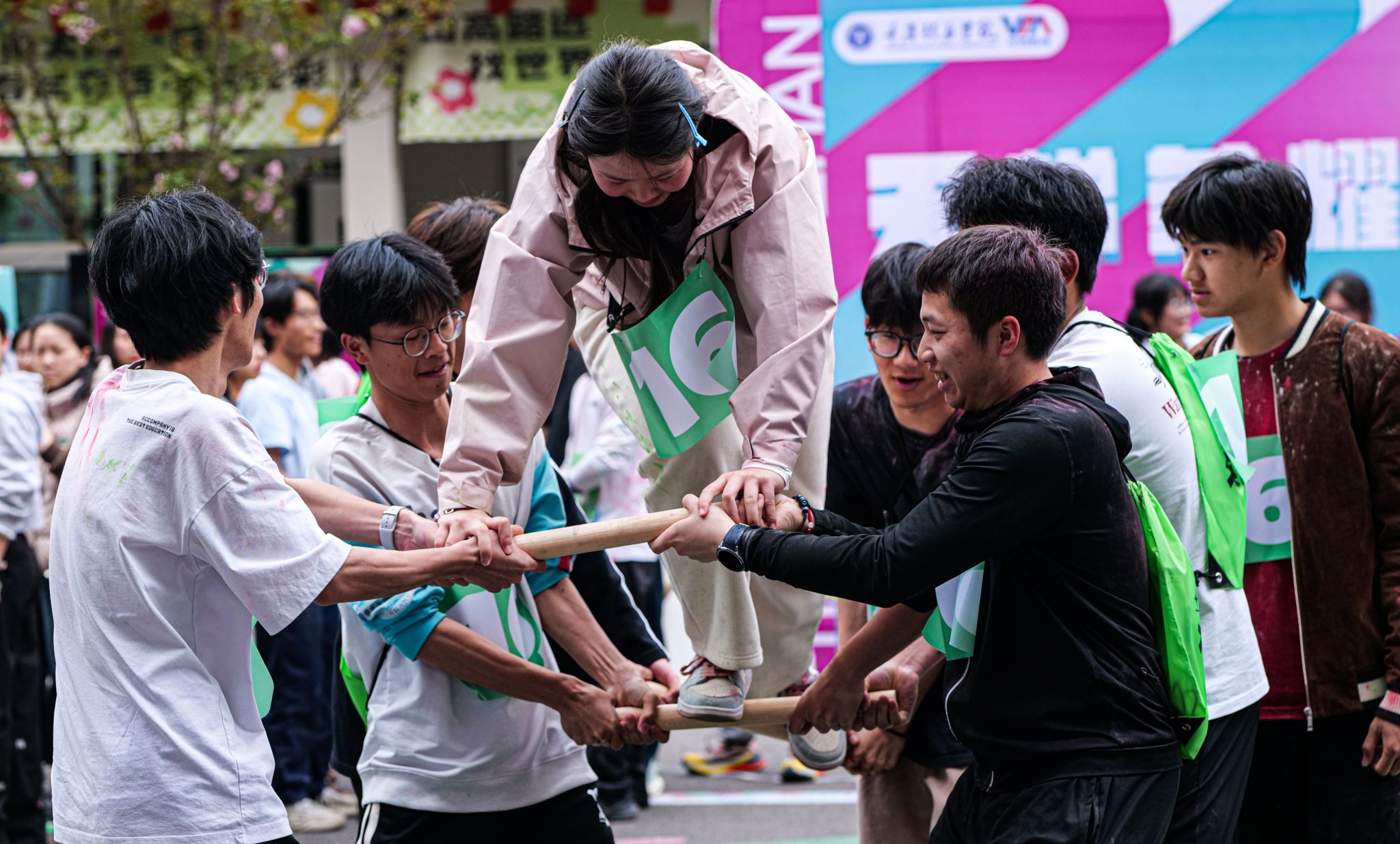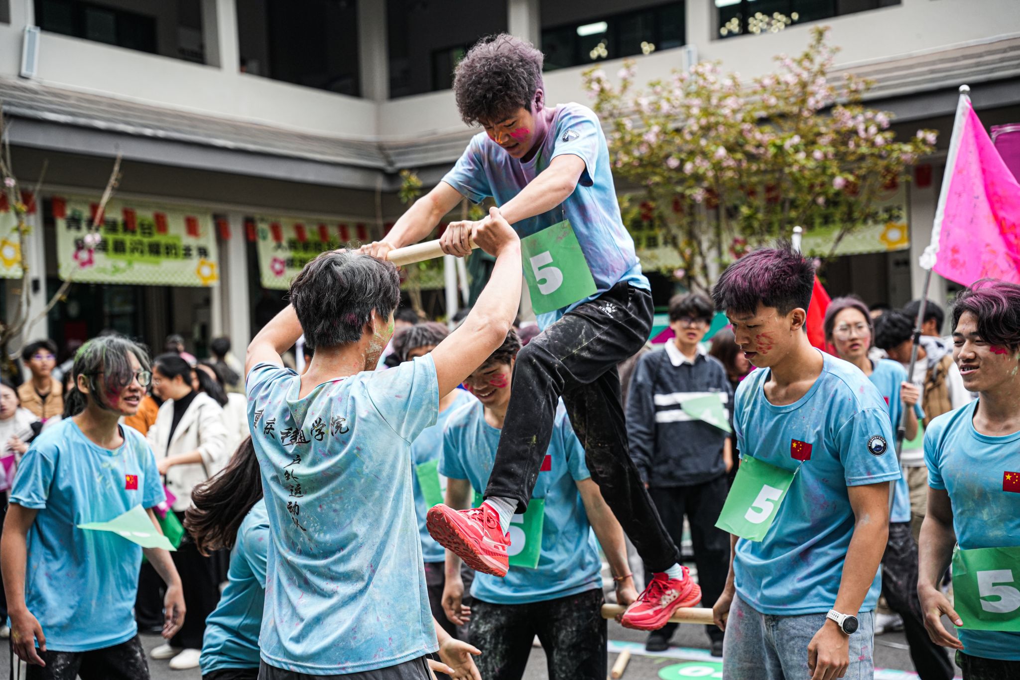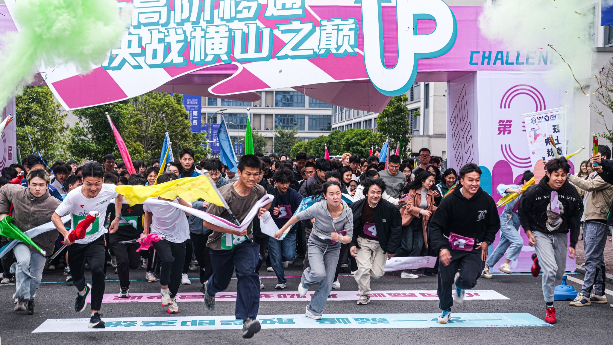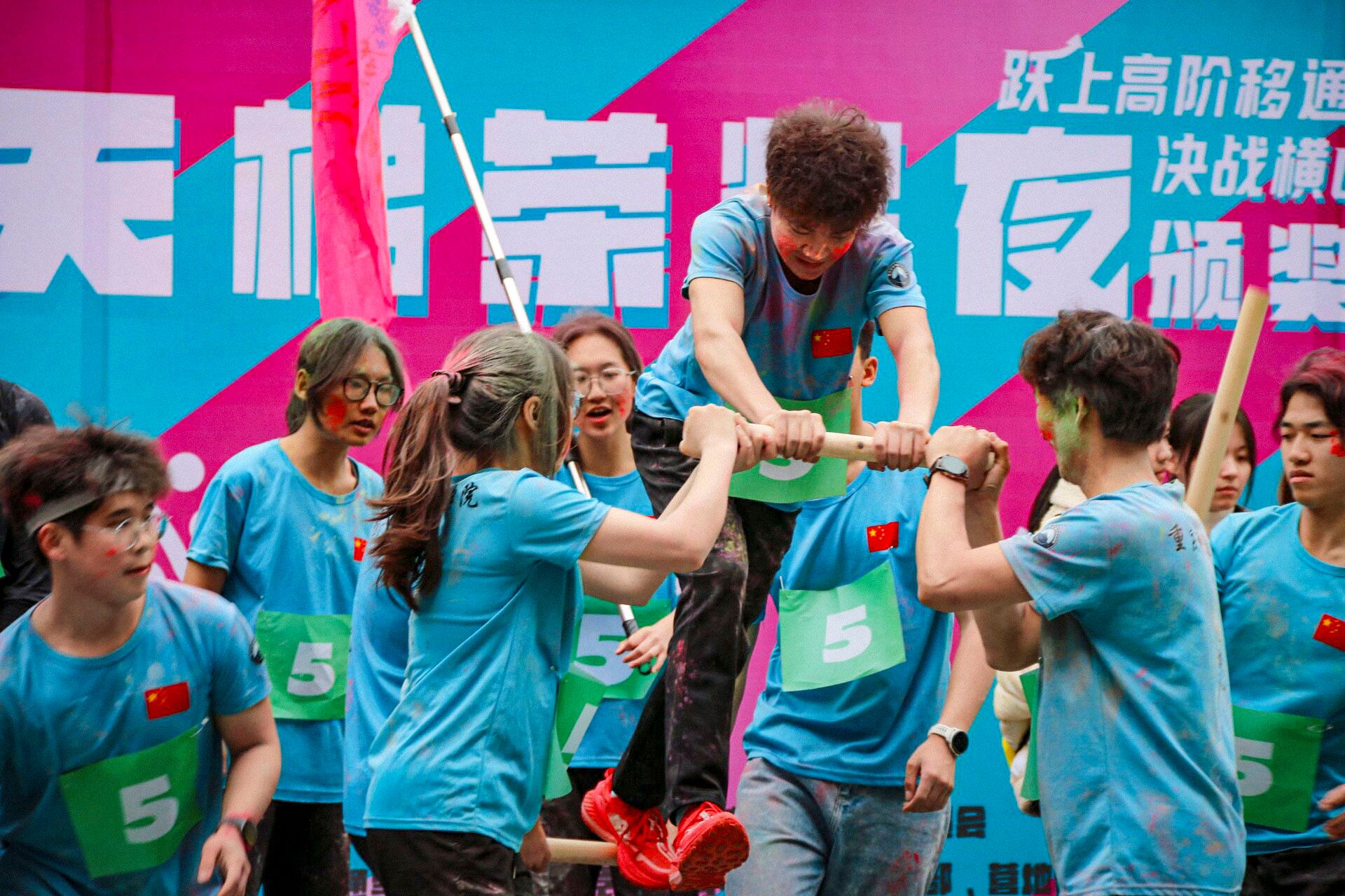 在全校师生的瞩目之下,本届赛事刷新书院竞技运动新热度!参与人数破新高,活动一经上线参与名额迅速抢空,较去年增长66.67%;在活动形式上,全面打破常规体育赛事框架,从去年"骑行追风"环湖耐力赛、"浆板逐浪"水上平衡挑战,到今年全新的"极限攀岩"垂直征服赛、"天梯竞速"高空耐力战,运动形式实现从平面到立体、从单一到复合的跨越式发展;在活力的“彩色跑道”上欢笑声、助攻声交织,选手们化身流动的调色盘,用奔跑的脚步描绘出绚丽的青春画卷,每位选手的“战服”上都形成独一无二的"色彩DNA"。