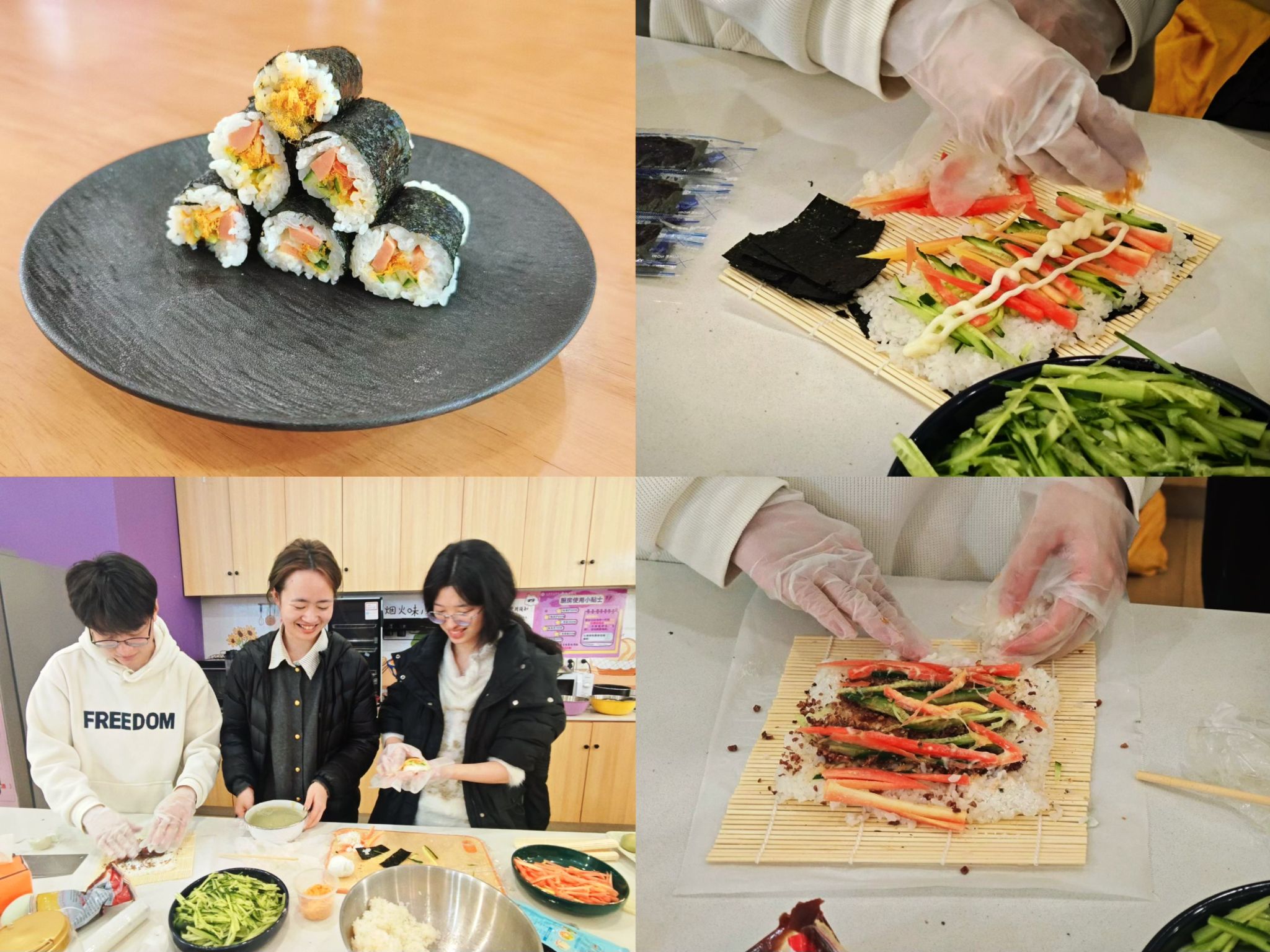 除了制作青团之外,同学们还制作了紫菜饭团和抹茶麻薯。同学们小心翼翼地将米饭铺在海苔上,一层一层地铺上配料,动作娴熟又专注;而另一边,同学们将糯米团揉得软糯,裹上抹茶粉,一个个圆滚滚的麻薯便呈现眼前。当做好的紫菜饭团、麻薯摆上桌面,看着亲手制作的美食,同学们脸上洋溢着满足的笑容,而这份春日里共同创作的美好记忆,也随着美食的诞生深深印刻在大家心间 。
