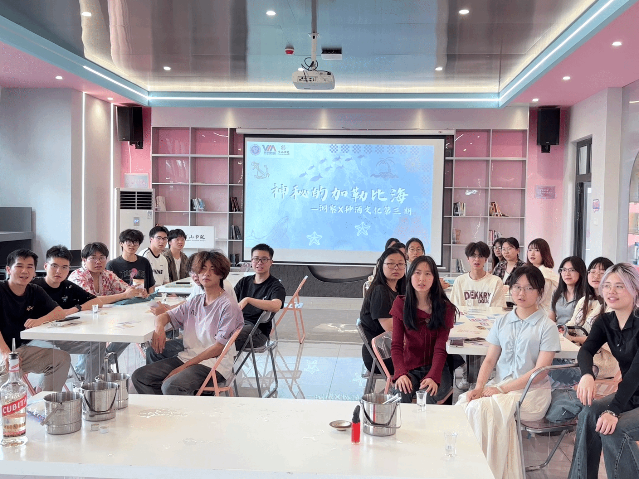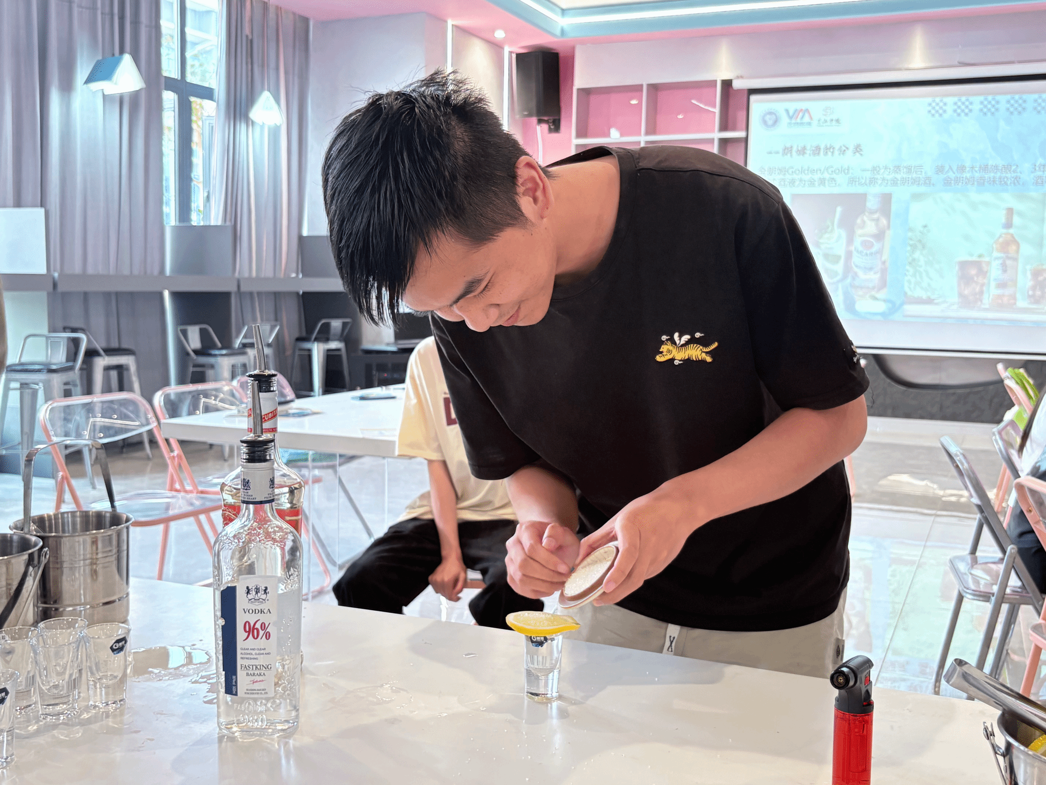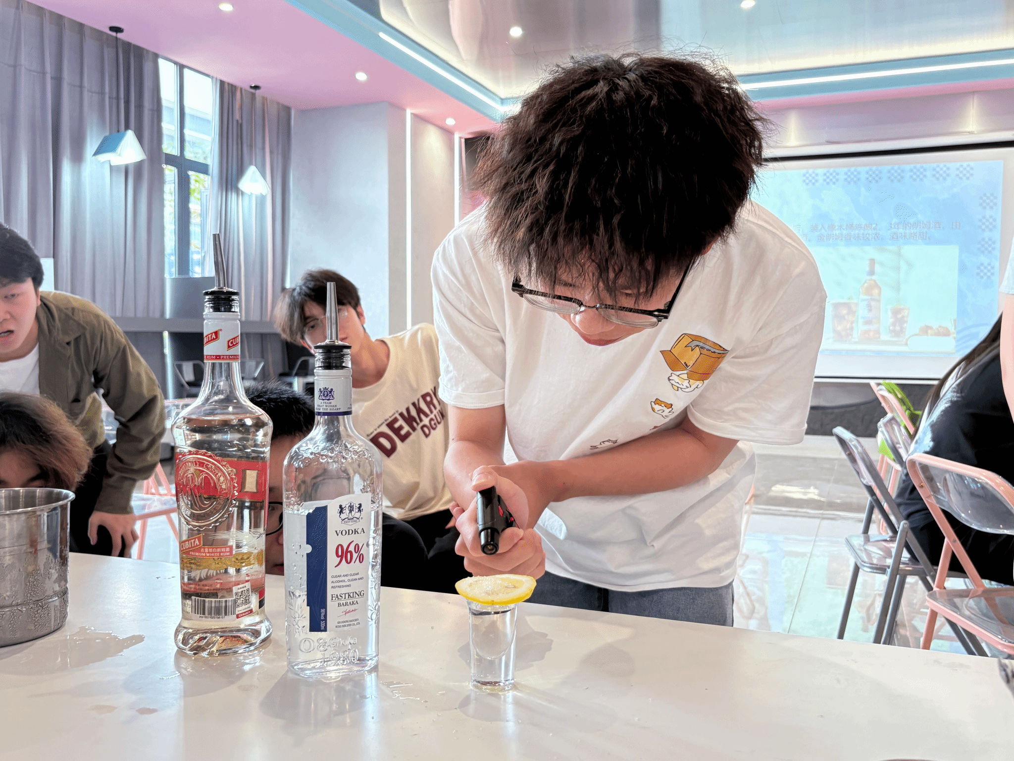 在领略了加勒比海的独特风情与神秘魅力后,主持人带领大家将目光聚焦到朗姆酒本身。朗姆酒的酿造,始于大自然的馈赠。甘蔗汁的清甜纯粹,蜂蜜的香甜醇厚,成为了朗姆酒风味的基石。几番对朗姆酒介绍之后,就由丁山书院学生发展导师袁海杰老师带着同学们深入了解朗姆酒。袁老师谈到:“品酒先闻闻味道,再让酒在口中滚一滚。”随后袁老师又让同学们在shot杯口放上柠檬片和适量白糖,再滴上几滴朗姆酒,“点燃它,但要注意安全”,火焰的刺激和柠檬的清香唤醒心灵。浅尝一口,柠檬汁的酸涩在舌尖散开,朗姆酒的醇厚暖意在口腔中蔓延,酸甜交织,层次丰富。古剑书院的张同学先“1:1复原”了袁老师的示例,品尝后又觉得酒精味道过重,便与一同参加的朋友大胆尝试,在杯中加入了纯净水。纯净水的清甜中和了酒精的烈性,入口顺滑又富有激情,像是在讲述着加勒比海的热情与自由。