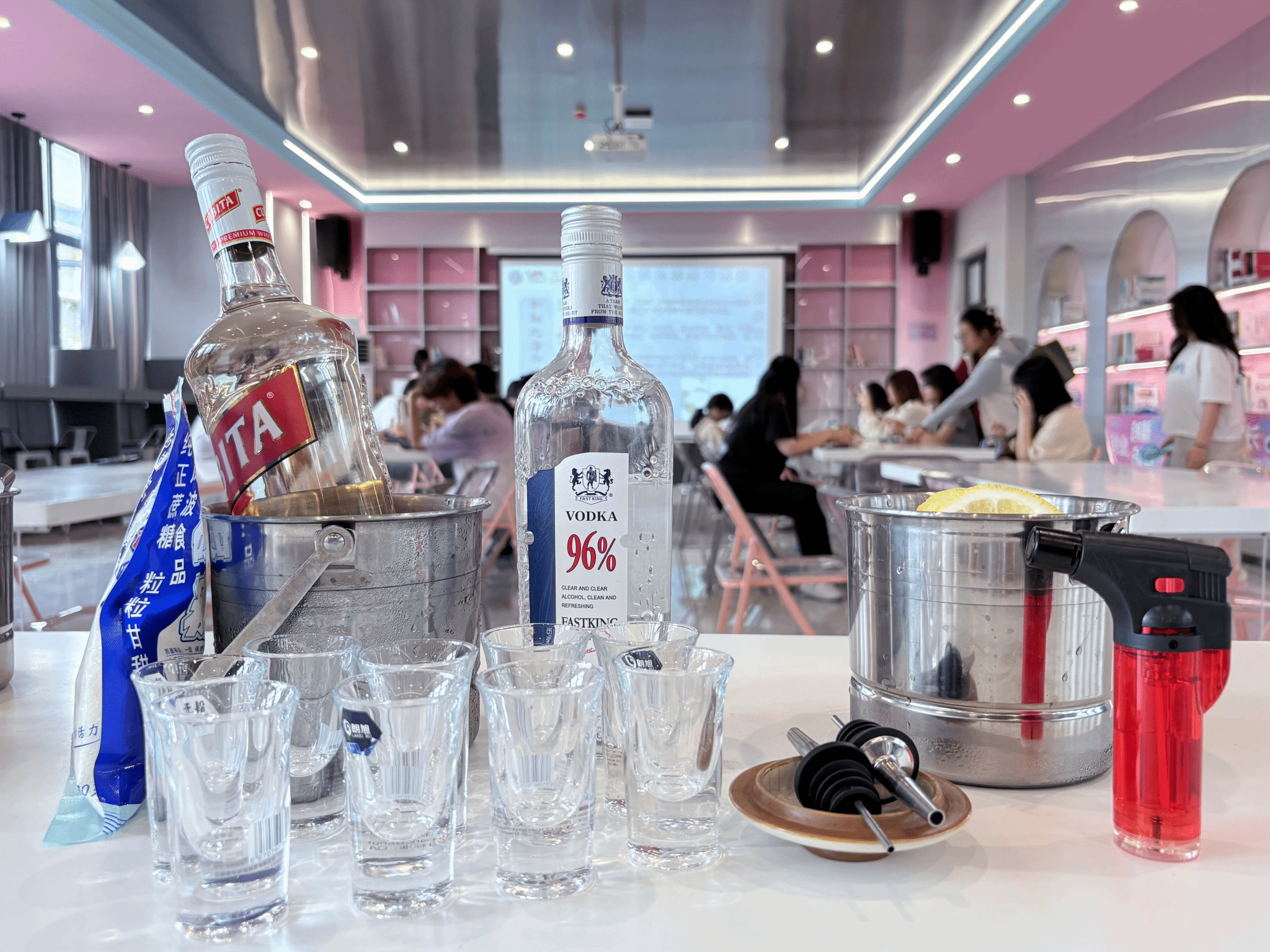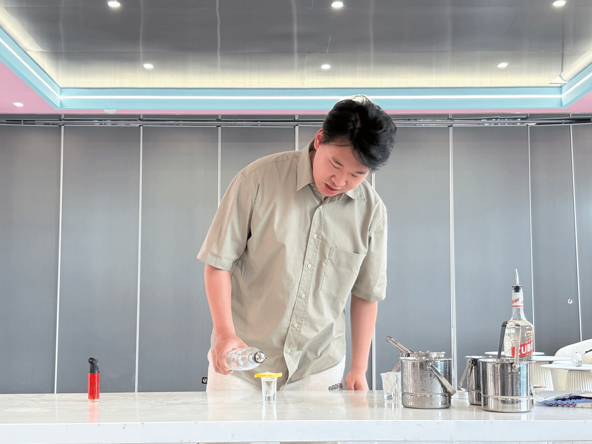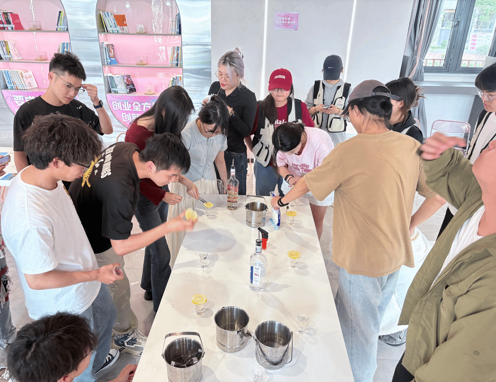 在领略了加勒比海的独特风情与神秘魅力后,主持人带领大家将目光聚焦到朗姆酒本身。朗姆酒的酿造,始于大自然的馈赠。甘蔗汁的清甜纯粹,蜂蜜的香甜醇厚,成为了朗姆酒风味的基石。几番对朗姆酒介绍之后,就由丁山书院学生发展导师袁海杰老师带着同学们深入了解朗姆酒。袁老师谈到:“品酒先闻闻味道,再让酒在口中滚一滚。”随后袁老师又让同学们在shot杯口放上柠檬片和适量白糖,再滴上几滴朗姆酒,“点燃它,但要注意安全”,火焰的刺激和柠檬的清香唤醒心灵。浅尝一口,柠檬汁的酸涩在舌尖散开,朗姆酒的醇厚暖意在口腔中蔓延,酸甜交织,层次丰富。古剑书院的张同学先“1:1复原”了袁老师的示例,品尝后又觉得酒精味道过重,便与一同参加的朋友大胆尝试,在杯中加入了纯净水。纯净水的清甜中和了酒精的烈性,入口顺滑又富有激情,像是在讲述着加勒比海的热情与自由。