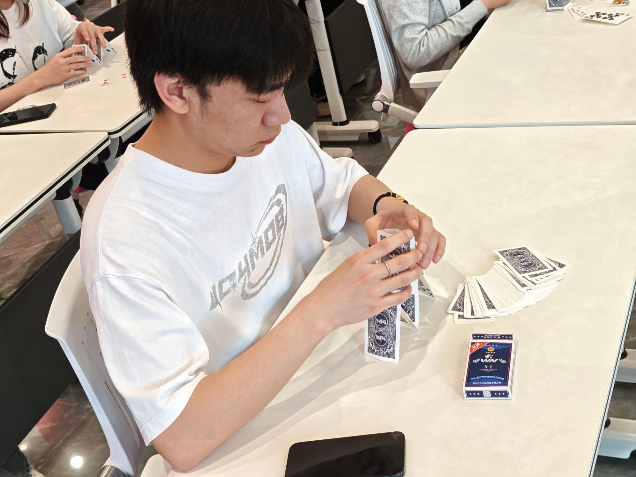 同学们以个人的形式用纸牌搭建结构,探索力学原理与工程设计。同学们利用普通纸牌挑战搭建“高塔”。从基础结构设计到力学平衡探索,参与者们不断尝试优化方案。有的同学通过三角形稳定原理实现“摩天大楼”,有的则利用交错层叠法打造出螺旋造型,并通过测试调整方案以提高稳定性。主持人现场讲解相关科学原理,并引导参与者总结实践中的问题与改进策略。