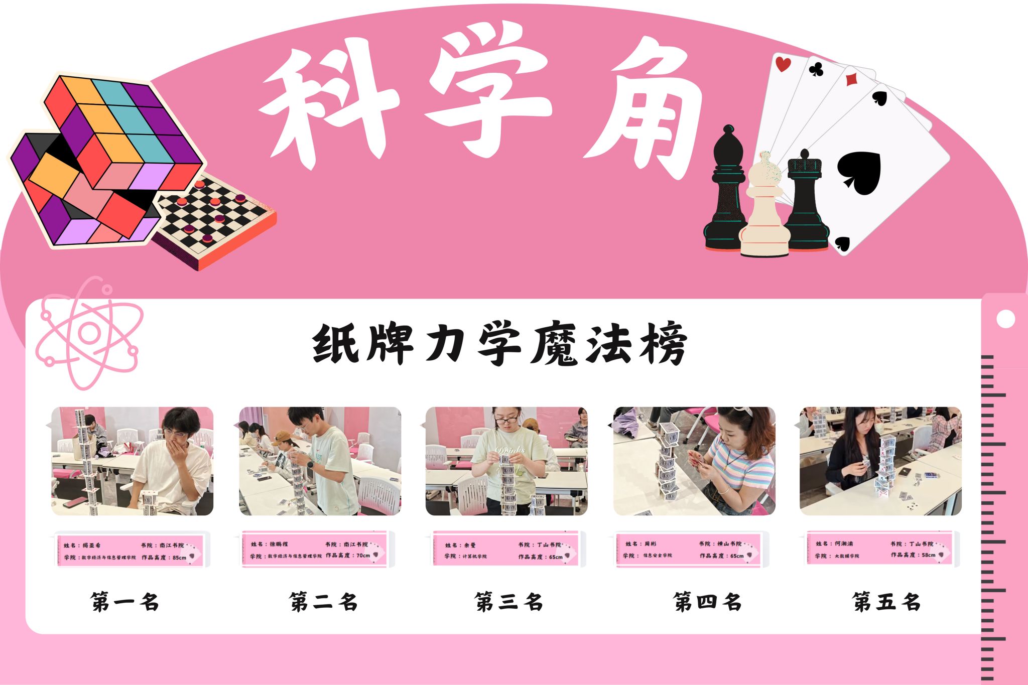 首期活动通过"科学性+娱乐性+互动性"的深度融合,为书院文化建设注入新活力。本次科学实验室还特别设置了“纸牌力学魔法榜”,选取搭建高度最高的前五名“登榜”。作为本期“登榜”的一员,来自横山书院/信息安全学院的周彬同学在榜单公布后欣喜地讲到:“这次活动能够荣获前五名,感到非常意外也非常开心。第一次这样搭纸牌感觉特别有趣,我不自觉地就变得非常专注,希望以后可以参与更多类似活动。”