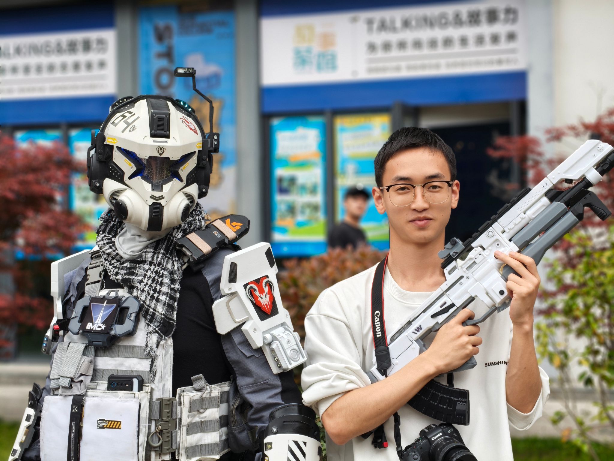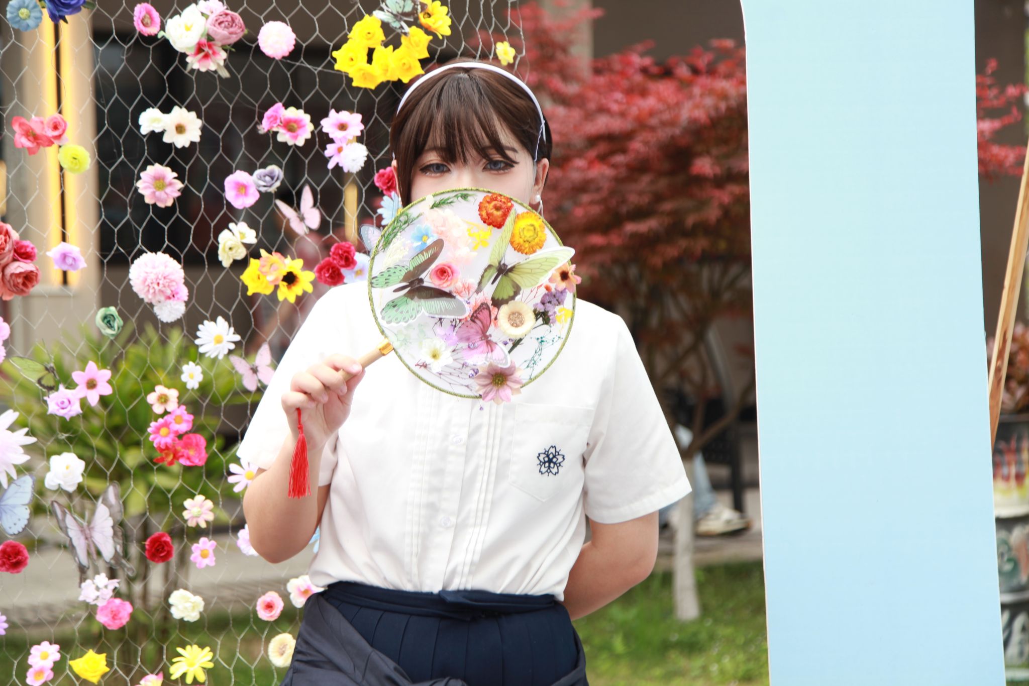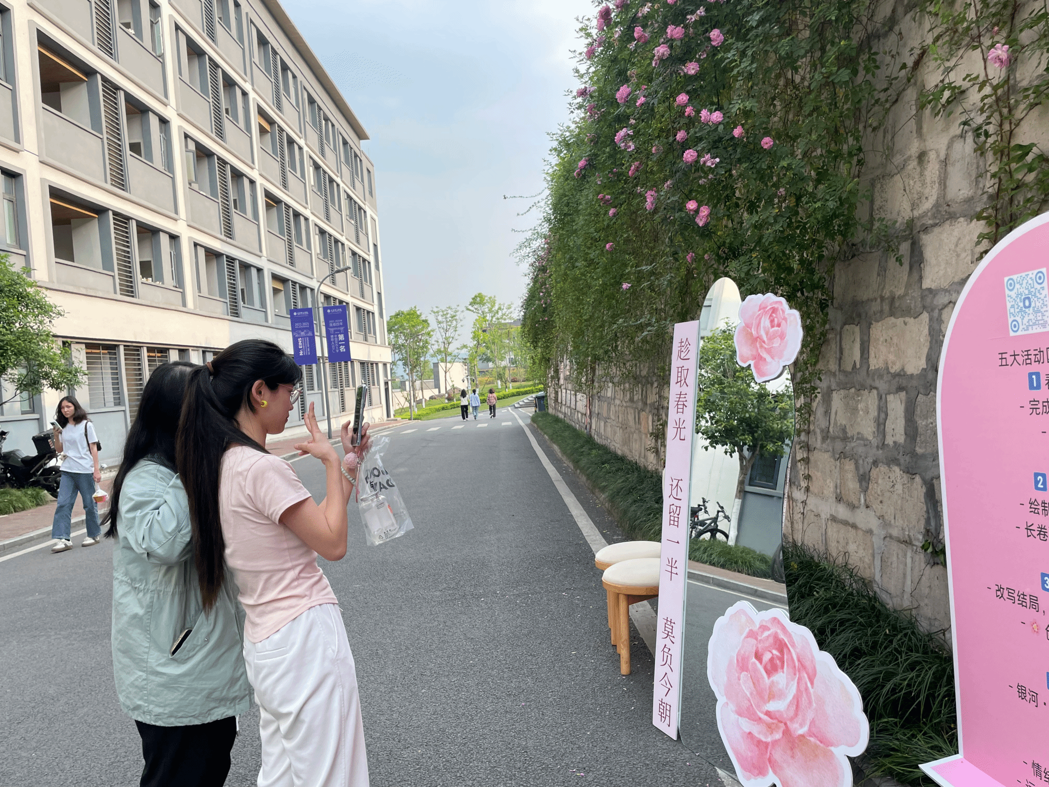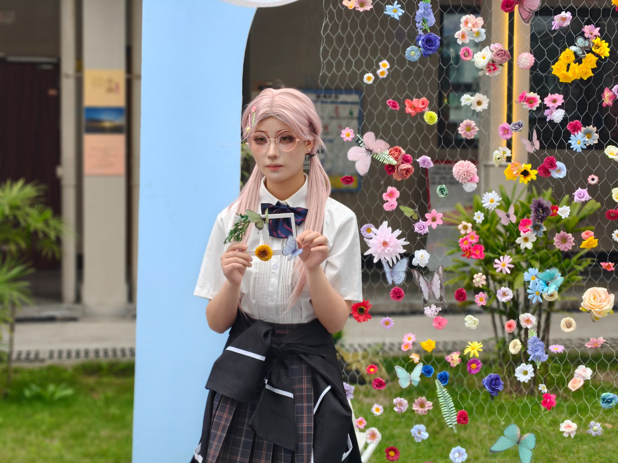中庭架起的春日画框,把海棠的粉、新叶的绿、天空的蓝构成了最美的背景。二号楼下的“粉绿色瀑布”花墙下,cosplay爱好者们穿着精美的服装,在开满盛花的花墙下轻抬衣袖,或与闺蜜在主题背景板前比耶定格笑容。DIY区则提供了干花与贴纸等材料,让大家亲手拼贴专属的春日记忆,带走的不仅是手作,更是与春天的独家合影。