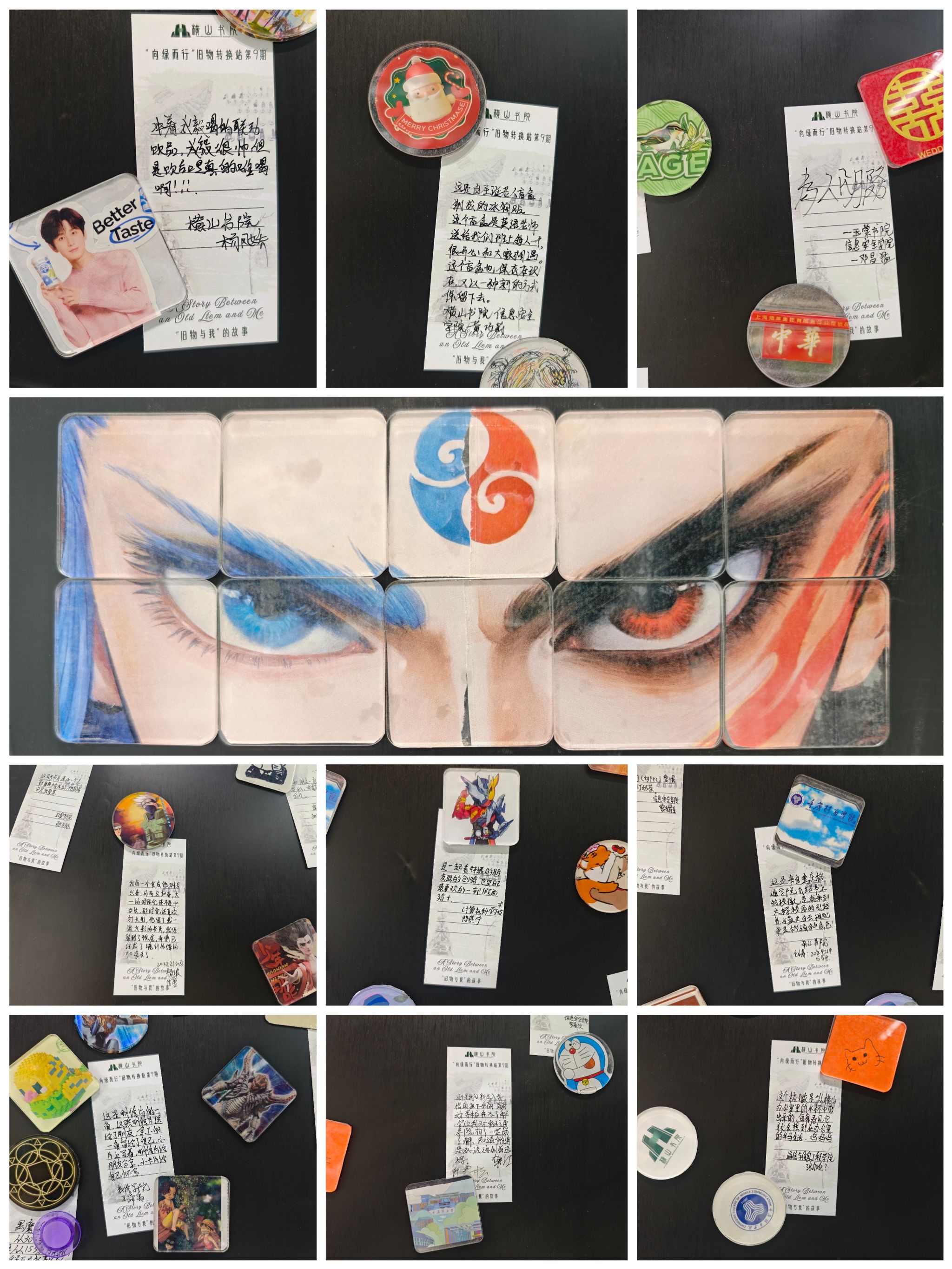 在书院精心打造的“环保艺术角”,100件由旧机票、咖啡袋、奶茶杯等废弃物改造的创意冰箱贴,配合可循环使用的磁吸装置呈现,直观演绎“变废为宝”的环保实践,色彩斑斓的冰箱贴与手写故事卡构成一道独特的风景线,为环保艺术角新增了一抹独特的故事与情感,吸引着往来学子驻足流连。以强烈的视觉语言诠释着“零废弃生活”的无限可能,当废弃材料在创意中焕发新生,当个人故事通过作品引发共鸣,这场关于可持续生活的对话便完成了最终闭环。