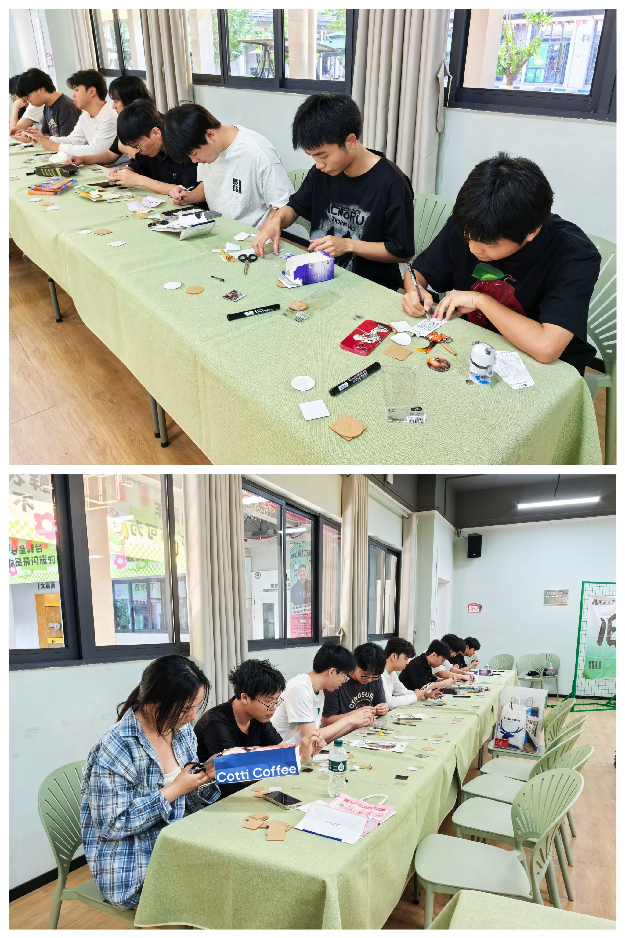 用透明的亚克力板化身承载记忆的创意画布!把旧衣物、废纸盒等材料裁剪成形,通过双面胶和磁铁固定在透明亚克力板上,改造成个性十足的冰箱贴。与普通手工活动不同,这次每个作品都附带专属“身份证”,就是参与者们亲手书写的故事卡片。“这个钥匙扣是我爷爷留下的”“这片布料来自高中校服”活动现场,2024级古剑书院、信息安全学院的沈叡同学边写卡片边介绍。相较于传统的环保宣传,这种“物品+故事”的形式更易引发情感共鸣,正如活动发起人邓嘉亮所说的:“亲手把旧物变成有故事的艺术品,这样的环保实践比说教更打动人。”