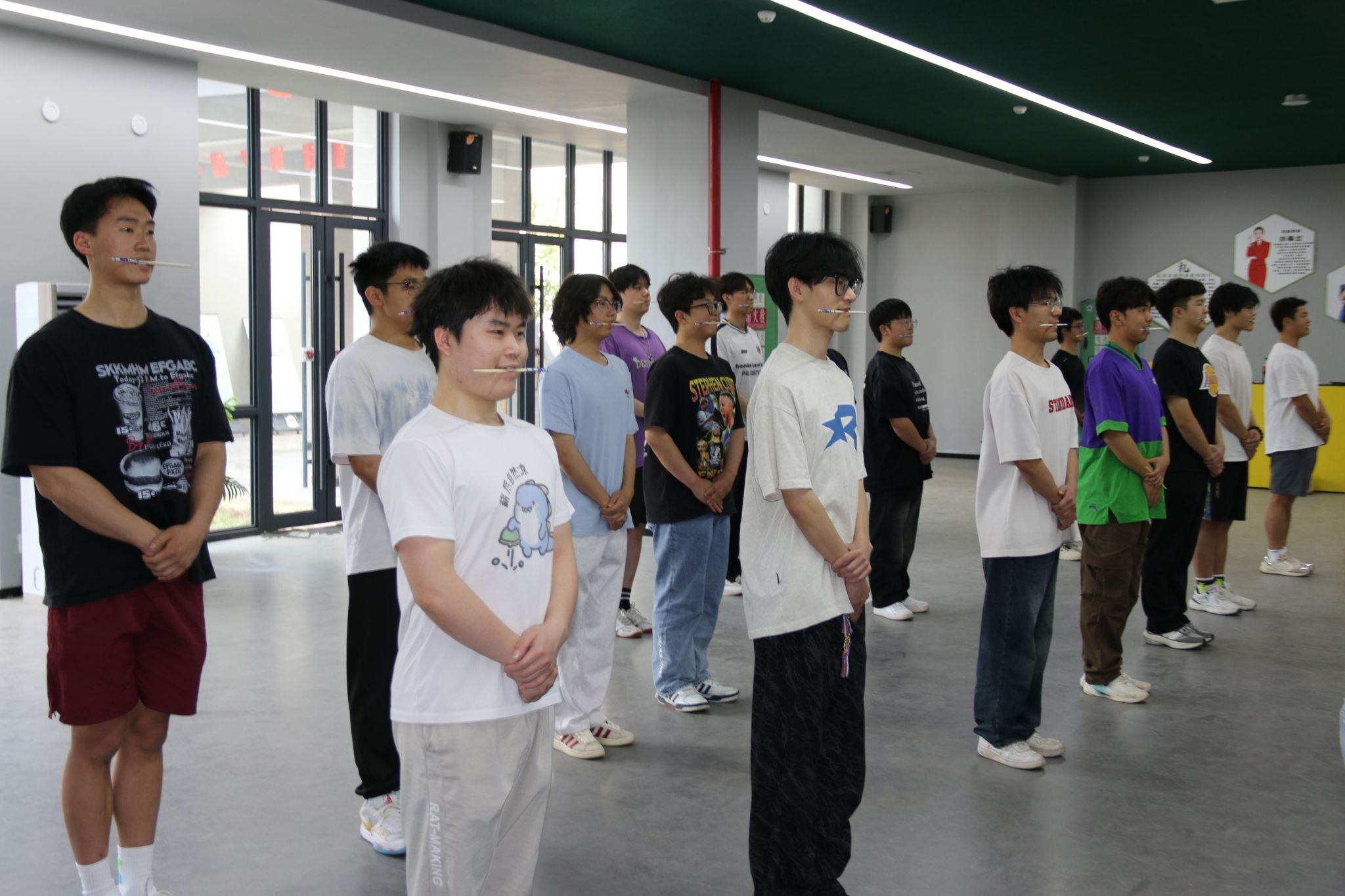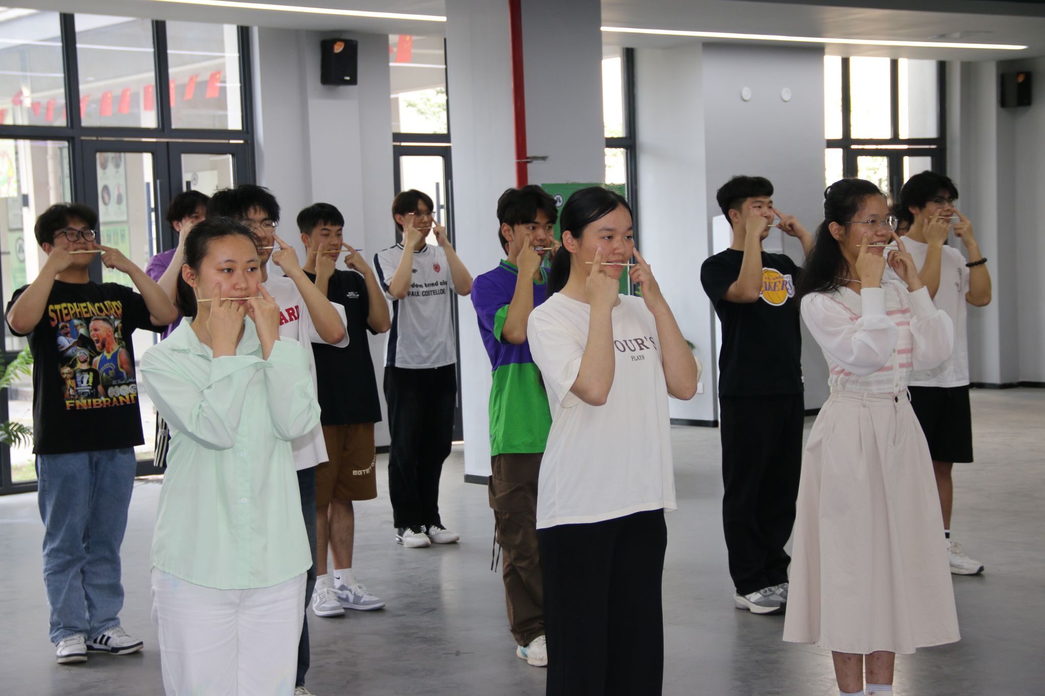 微笑是最容易给别人传递友善、亲切和尊重感的非语言沟通方式。老师让同学们面对镜子,放松面部肌肉,用牙齿轻轻咬住木筷,调整嘴角上扬角度,使嘴角两端与瞳孔垂线基本对齐,形成标准“八颗牙微笑”,帮助肌肉形成记忆。然后再双手食指与中指并拢,指尖轻抵嘴角两侧,向上提拉至苹果肌微微隆起,感受脸颊肌肉的收缩力度,强化微笑时的肌肉联动。同学们在练习中感受到面部肌肉的微微酸胀,汗水悄然顺着脸颊滑落,却仍坚持调整嘴角弧度,力求让每一寸肌肉精准贴合“八颗牙微笑”的标准。