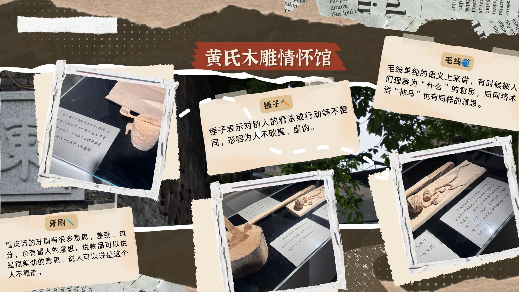 “雕刻刻的是情怀,不一定非要刻出什么特别的作品”,参观途中黄老师讲道。馆内,一组组别出心裁的“情怀”作品静静陈列,“牙刷、毛线、锤子……”这些看似普通的物件,在重庆方言里却别有深意。重庆方言中,“牙刷”意表差劲、过分、雷人;“毛线”蕴含否定、怀疑;“锤子”传达不相信、不屑等别样解读。这不仅是艺术形式的创新,更勾起人们心底对家乡话的亲切记忆,彰显着浓浓的巴渝情怀。艺术源于生活的烟火气息,唯有用心感知生活,才能在平凡事物中发现独特的美学价值。