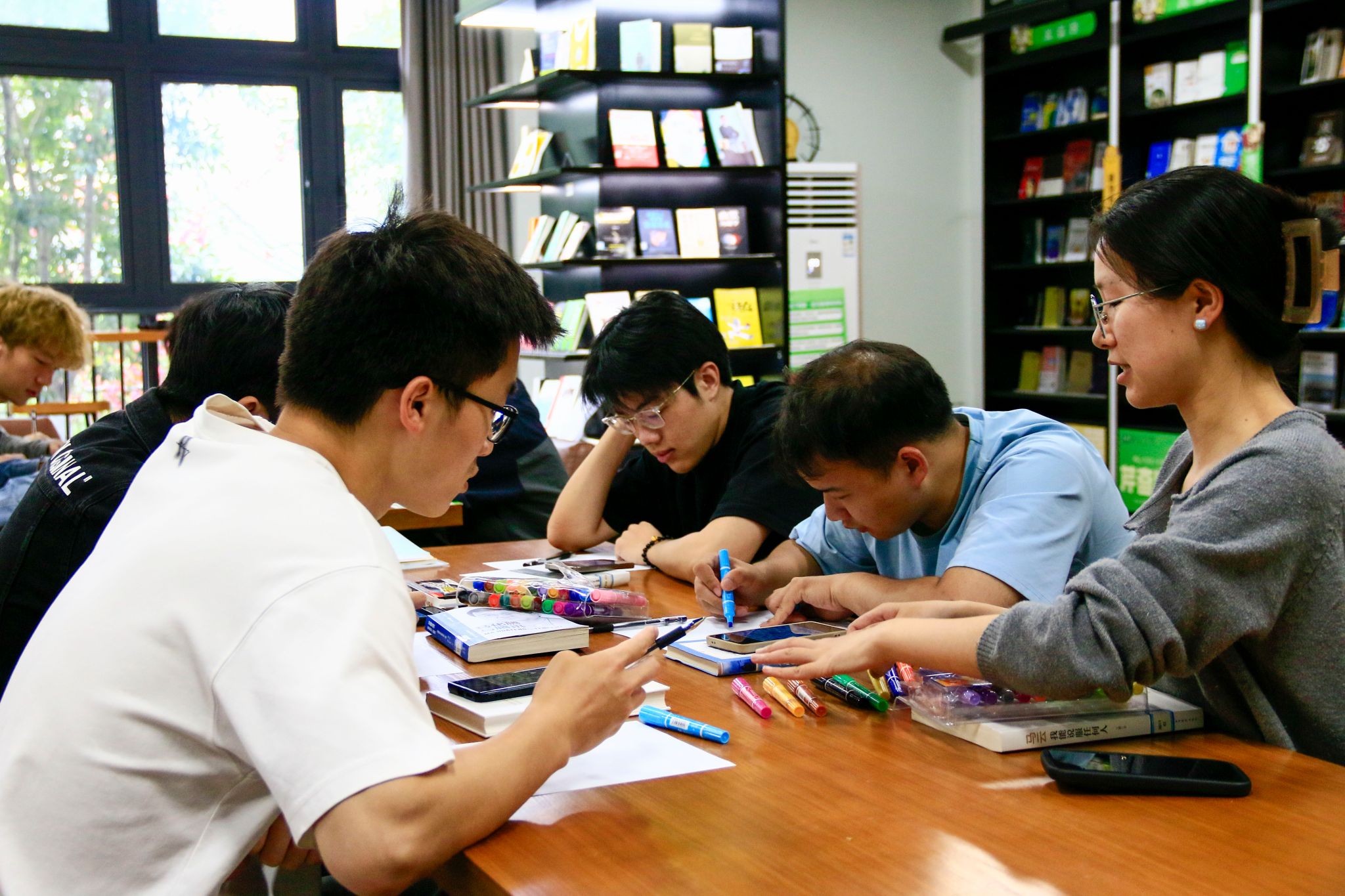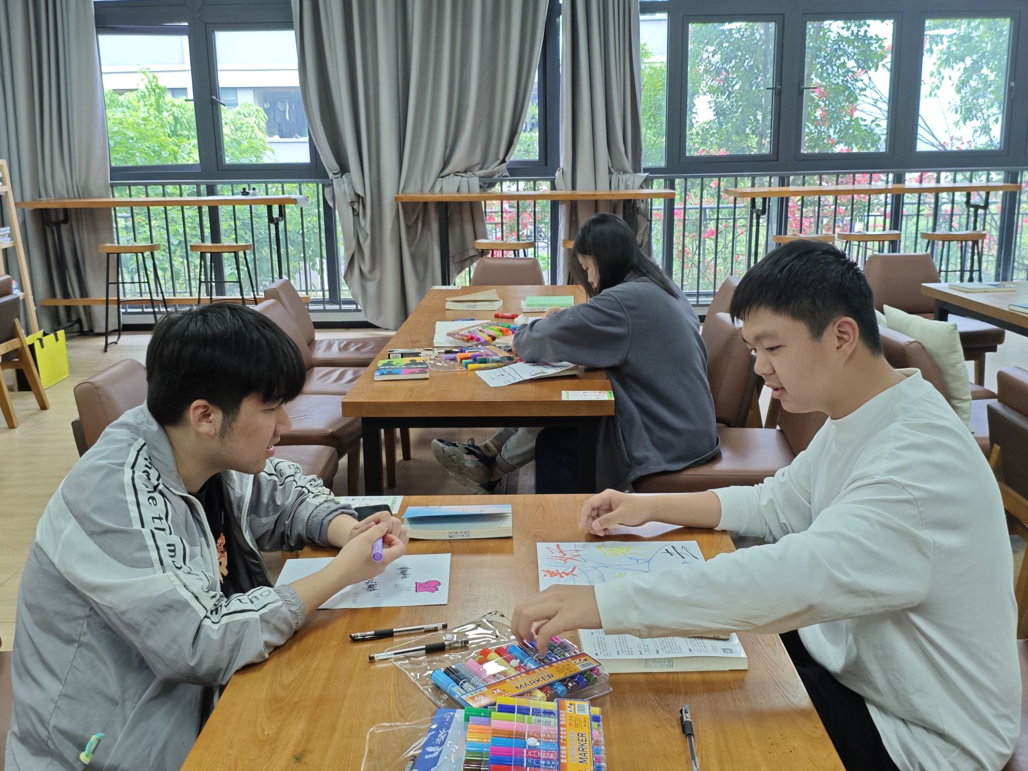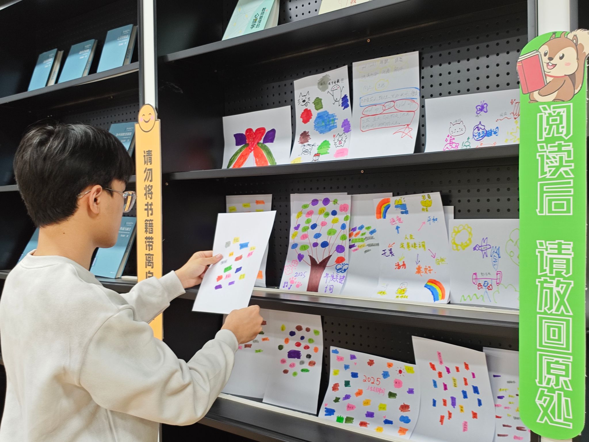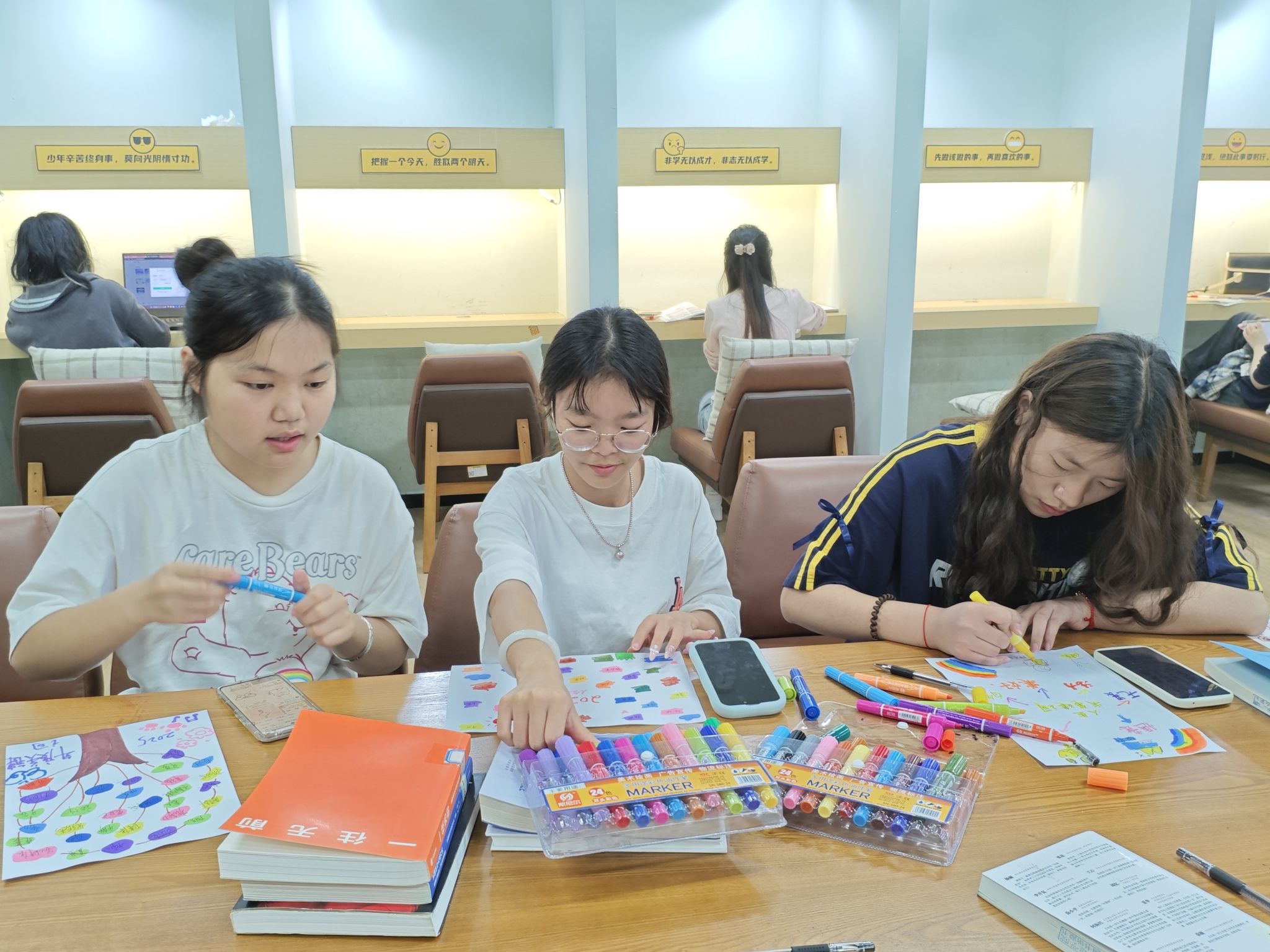 在深度阅读的余韵中,自习室的空气开始流动起来——不是声响的躁动,而是一种思维解冻的细碎声响。同学们在书香的浸润下,进一步拓宽自我成长路径,用创意和色彩绘打开自己的“人生拼图”。同学们结合自身认知特点和成长需求,回顾自己的经历、兴趣爱好以及未来梦想等,在纸上书写自己的“人生关键词”。马克笔划过纸面的沙沙声里,藏着这个时代特有的认知密码,那些被社会定义为“无用”的兴趣、“不切实际”的梦想,在色彩碰撞间被赋予了新生命,它们也正悄然串联成同学们的完整成长轨迹。