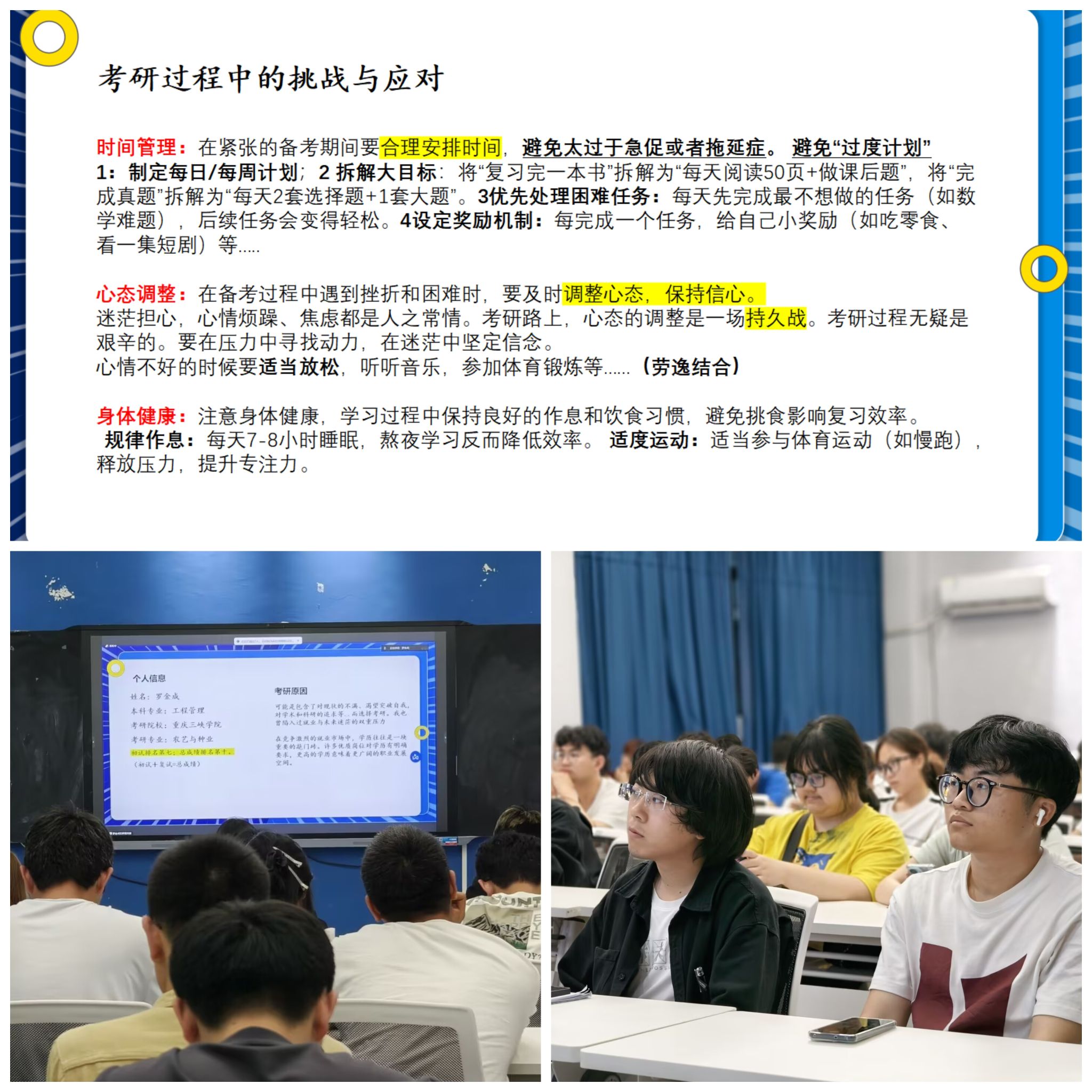 本次分享会通过“朋辈引领+师者赋能”的双轨模式,切实回应了学生升学需求,彰显了书院与学院协同育人的实效。未来,两院将继续深化合作,为同学们成长搭建多元平台,助力更多同学在“研途”中乘风破浪、筑梦未来。