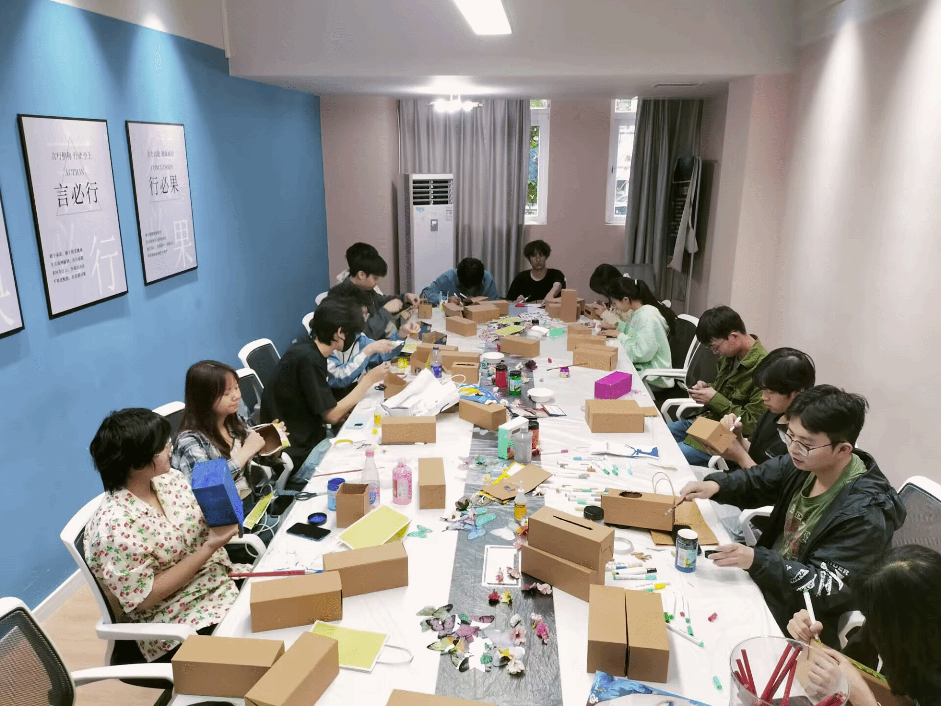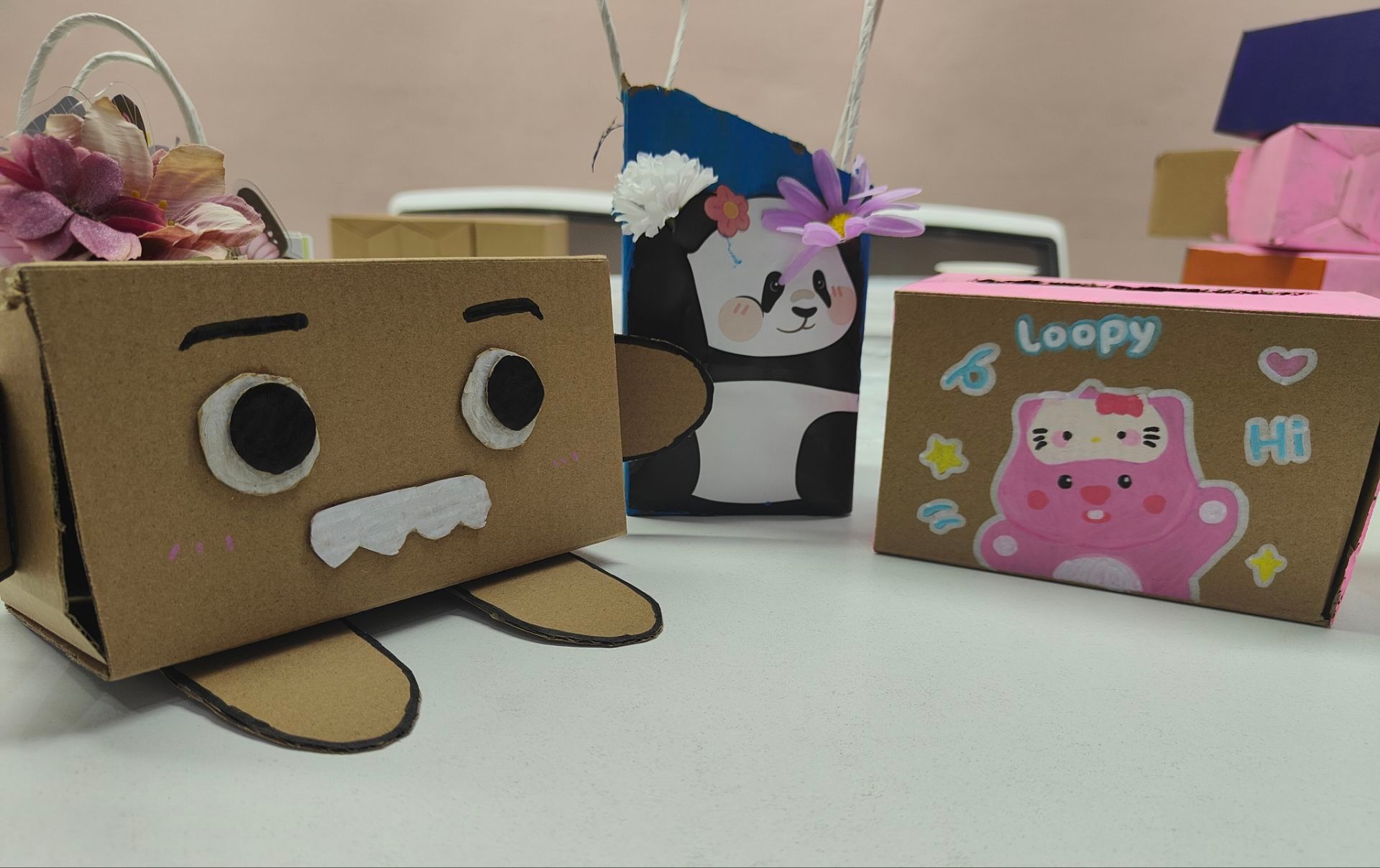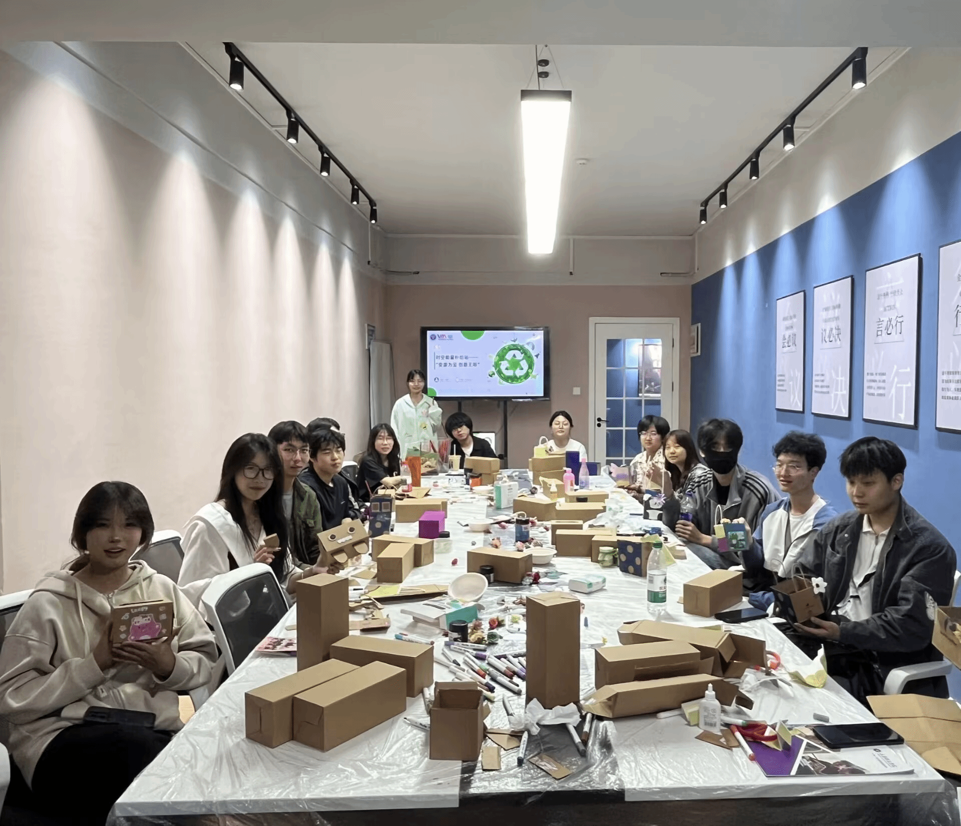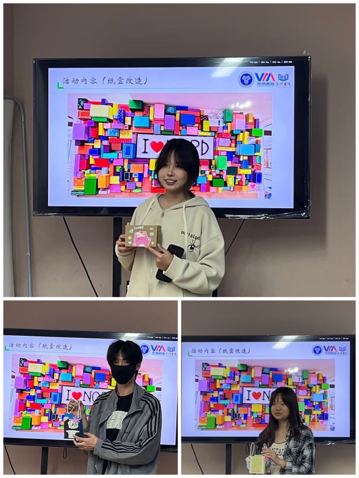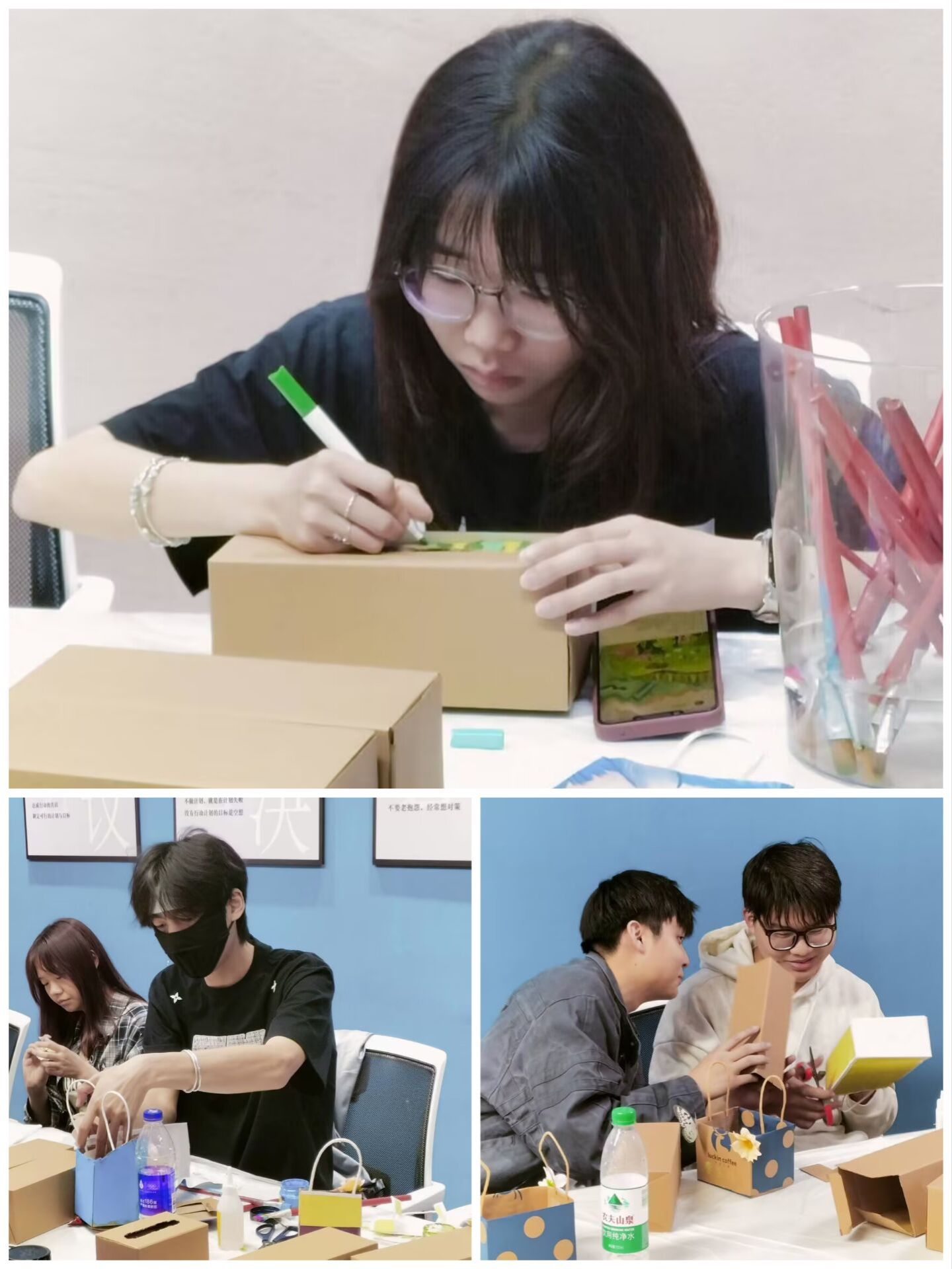 活动开场,主持人为大家介绍了此次活动的目的与意义,随后同学们便开启了属于自己的创作之旅。大家围绕饮品打包纸袋和杯子包装盒展开改造。有人将饮品打包纸袋裁剪、折叠,制作成造型各异的文具收纳盒、首饰收纳盒,有人则在纸袋表面绘制精美图案、贴上照片,讲述旅行纪念品、童年玩具背后的动人故事。