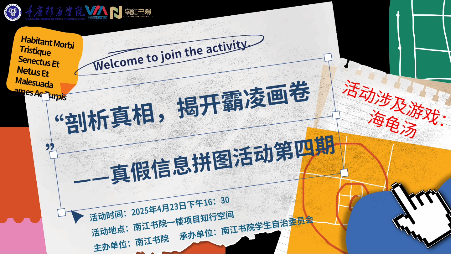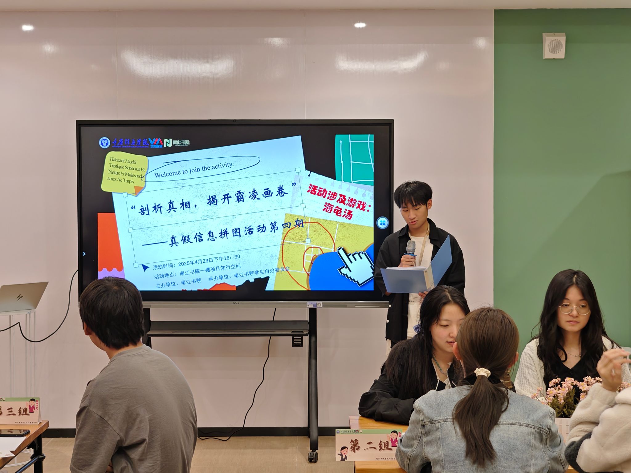 当今校园霸凌问题已引起社会广泛重视,它对受害者的身心健康构成严重威胁,同时也影响着霸凌者的健康成长与正确价值观的形成,为加强学子们对校园霸凌的认知教育,增强明辨权益保护意识的能力,南江书院于4月23日在南江书院一楼项目知行空间,开展以“剖析真相,揭露‘霸凌画卷’”——真假信息拼图活动。