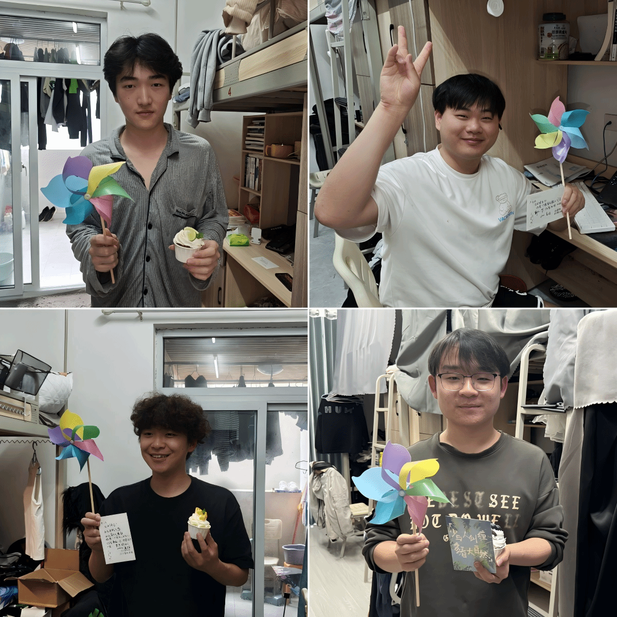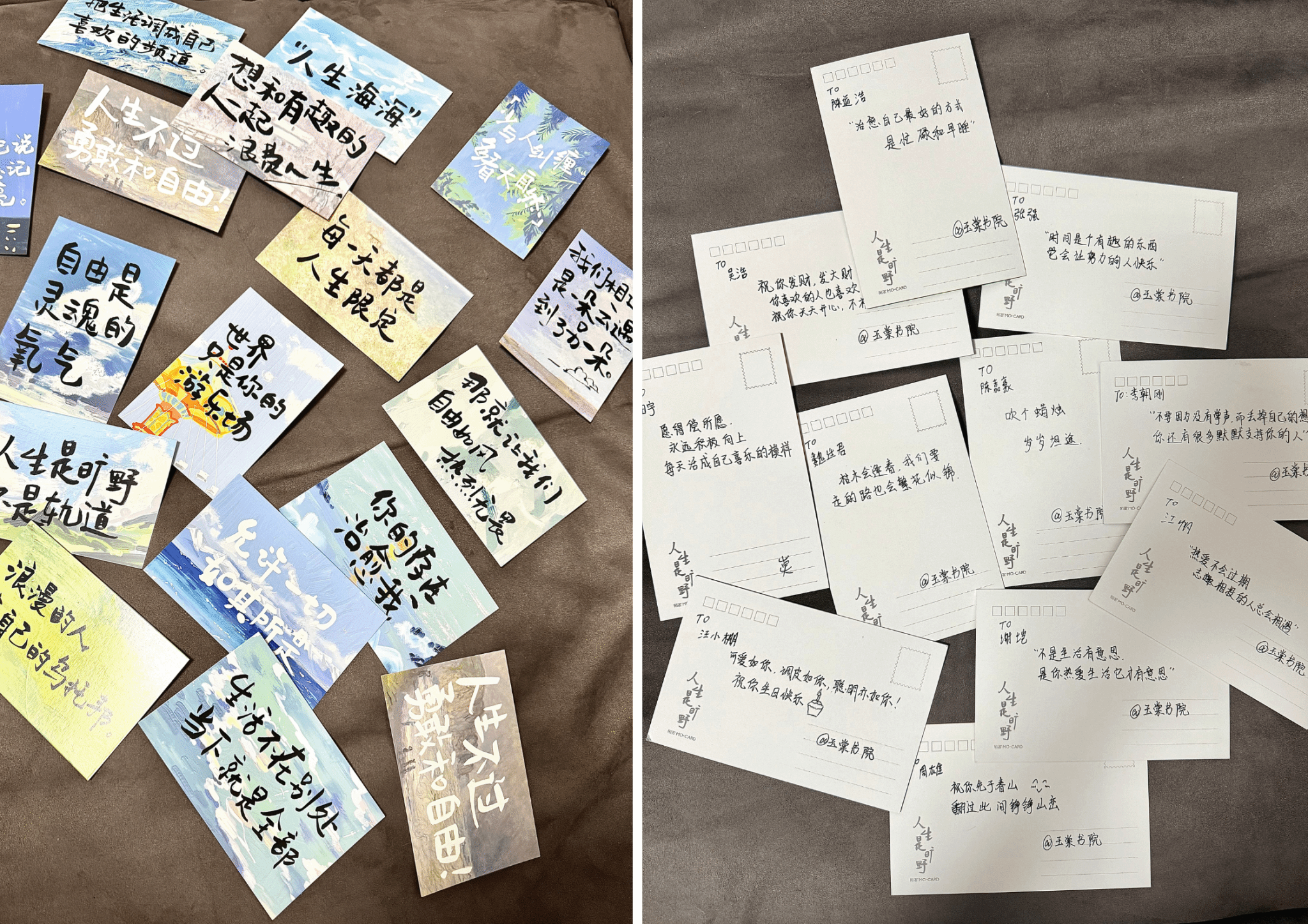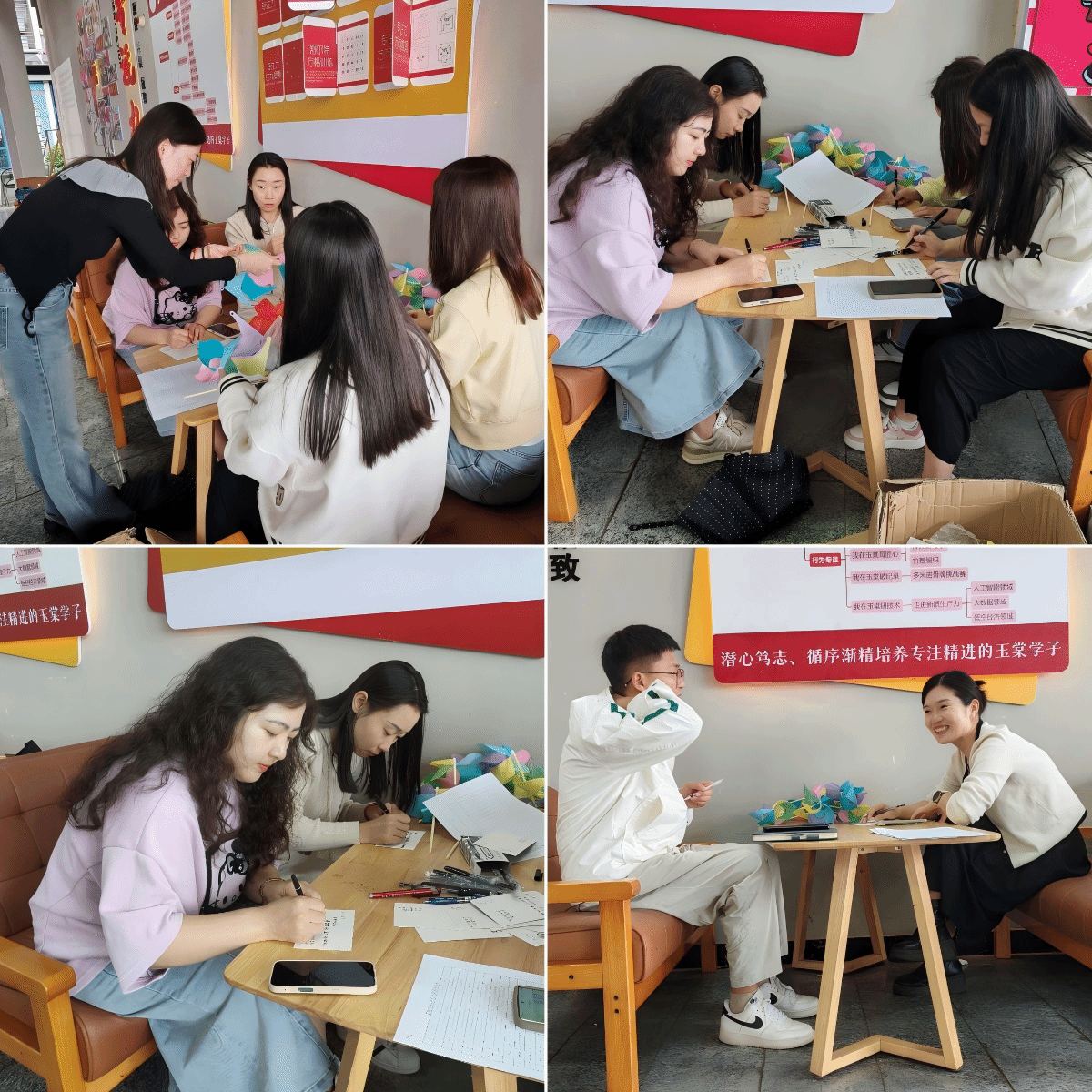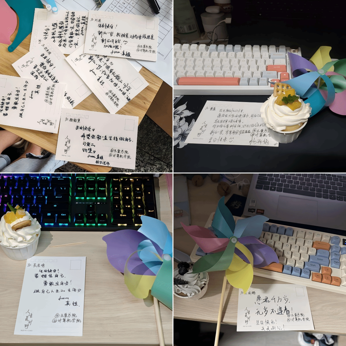 4月29日的玉棠书院中庭,玉棠书院发展导师和计算机学院辅导员、异科导师们正动手为寿星制作专属祝福风车以及生日贺卡,每片风叶都该承载着不同的祝福维度。“年轻气盛、朝气蓬勃”、“你要勇敢的做自己”、“相信自己,勇敢且自由”、“新的一岁,你要加油!”老师们在手绘明信片上精心书写生日寄语。每一笔都承载着对同学们的深切祝福。