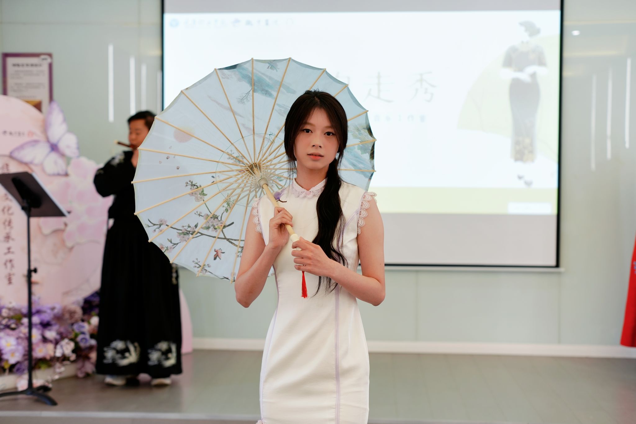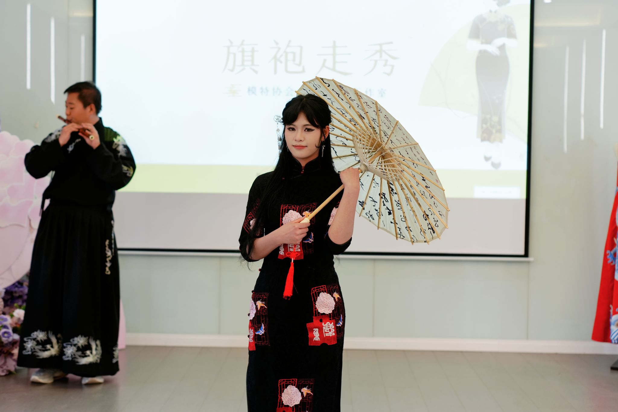 笛声起,同学们身着精心挑选的传统旗袍登台亮相。她们步履轻盈,仪态端庄,在古典与现代的交融中展现旗袍的典雅之美。一袭旗袍,一支竹笛,画面和谐优雅,举手投足之间,尽显东方雅韵。