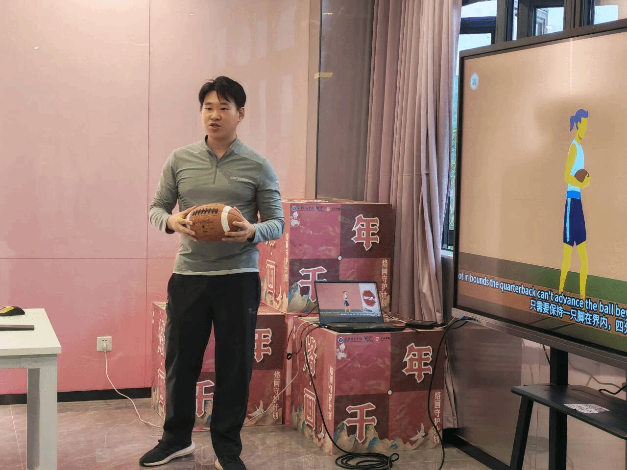 在竞技体育的张炜哲老师加入游戏后,正常球赛的难度也上升到了一个新水平。双方队伍在指导老师的带领下,进行了新的一轮比拼。橄榄球运动的魅力,在于其精妙的战术布置和精准的战术执行。场上的两支队伍围绕在两位老师身边,进行着紧张的战术布置。对于不同位置的队员,有着不同的战术安排,身强体壮的同学被安排在靠近边线的位置,作为深远地区的外接手,身形灵活的同学在四分卫旁边,担任着跑球得分的重要进攻手,以及对团队得分起到重要作用的掩护手同学。在两只队伍的紧密安排下,上演着一轮又一轮精彩的交锋。