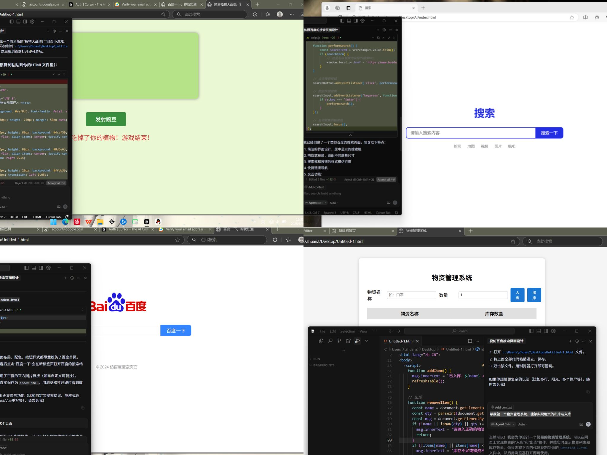 植物大战僵尸游戏:通过对Cursor输入指令、游戏规则以及想要达到的效果,Cursor自动生成僵尸与豌豆射手,点击“发射”按钮即可发射豌豆;