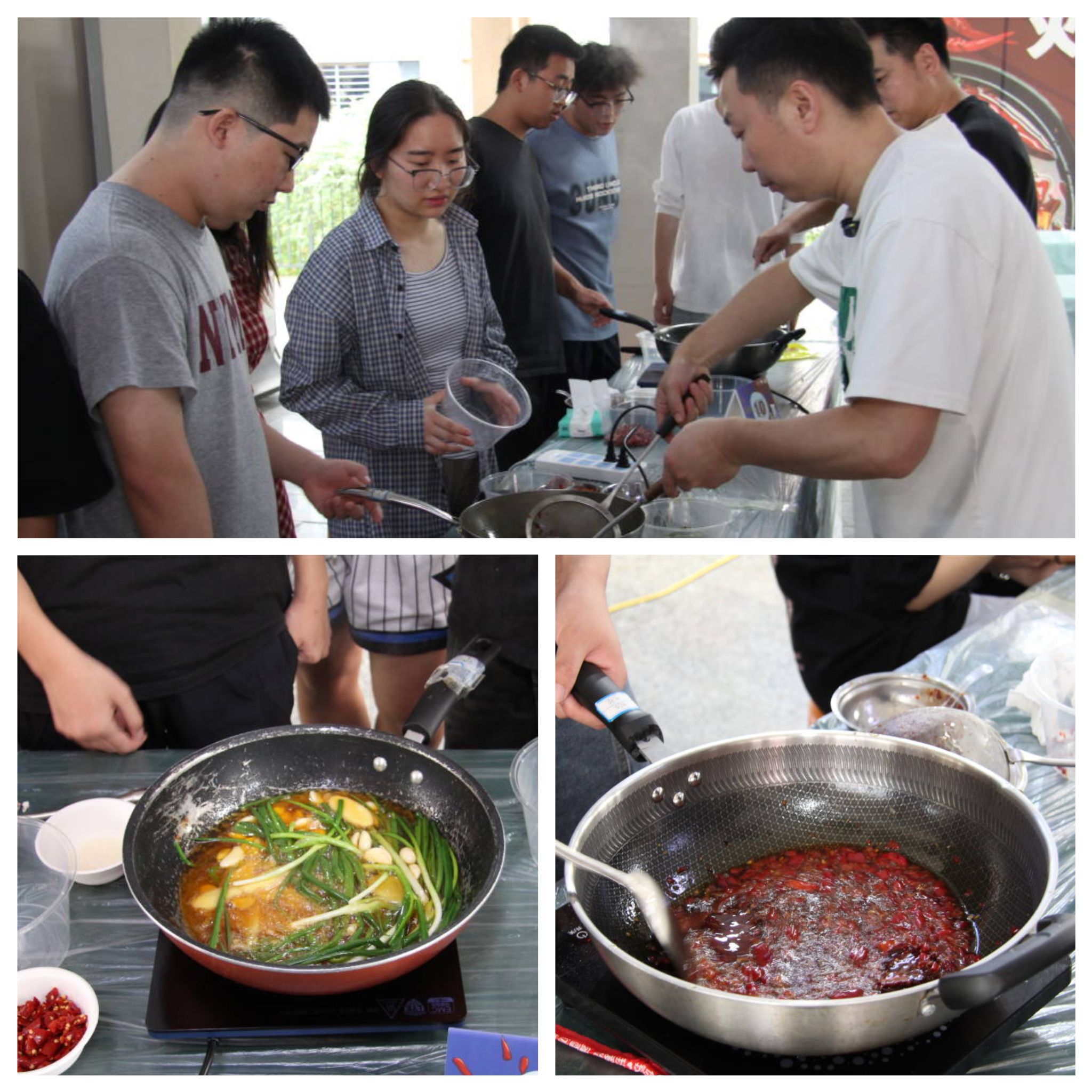 在唐老板讲解过后,便迎来同学们都十分期待的炒火锅底料环节。来自李言欢火锅·生鲜啤酒铺的徐师傅一边行云流水地将佐料投入锅中,一边为同学们讲解方法,随着油温升高,佐料在锅内翻滚,醇厚香气迅速弥漫,勾得众人垂涎。同学们同时跟着师傅的讲解制作火锅底料,小组内分工协作,辣椒的辛辣、花椒的麻香与牛油醇厚交织,浓郁香味充盈书院。一小时后,色泽红亮的火锅底料新鲜出炉。看着自己制作而成的火锅底料,同学们满是自豪与欢喜。