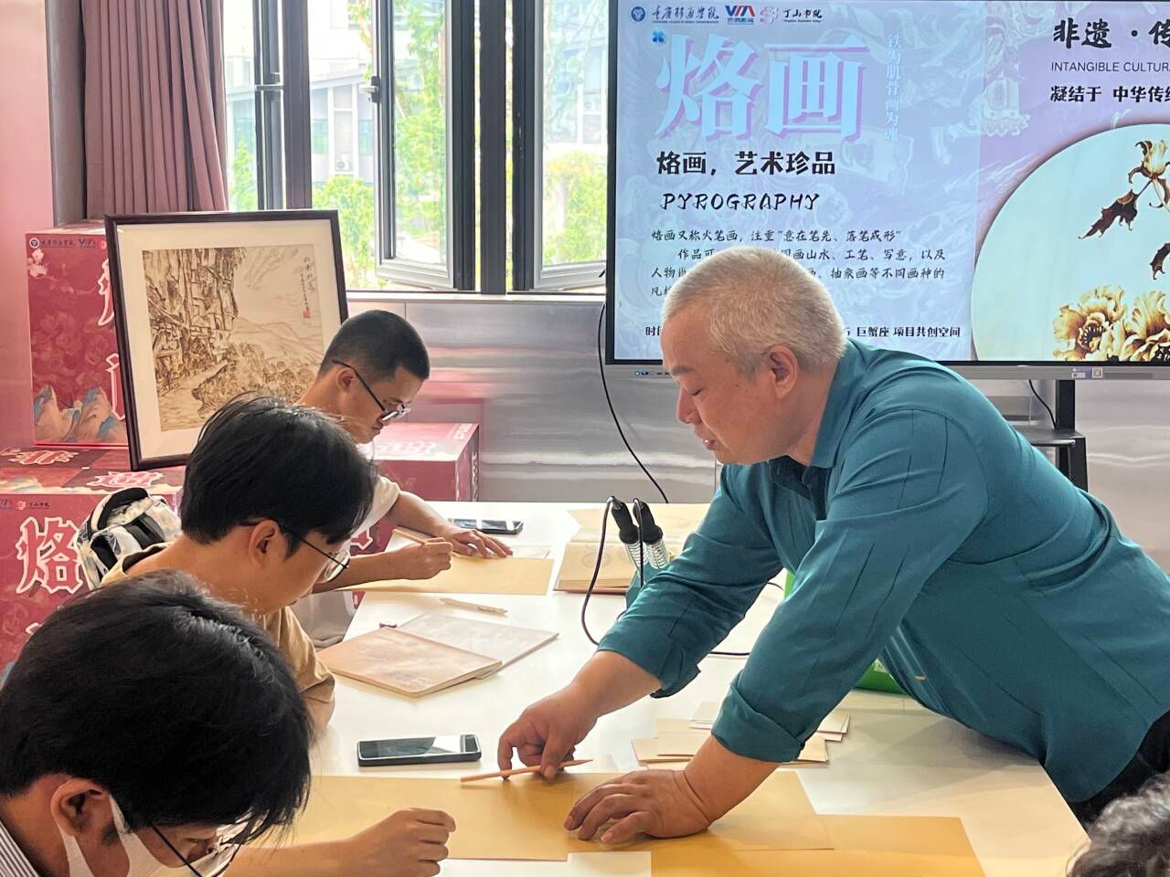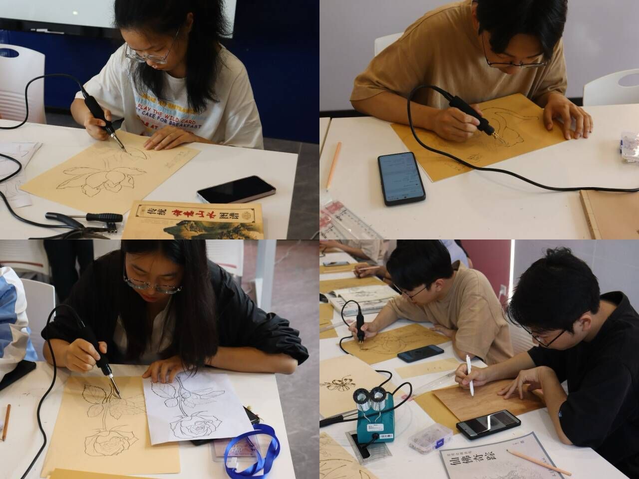 王云会长通过生动的讲解,带领同学们深入了解烙画的魅力。他展示了多种烙画工具和材料,详细介绍了烙画的制作流程,包括温度控制,运笔技巧,同时着重学习了烙画中的晕染手法。在王云会长的指导下,同学们复习了第一期学习的烙画技术,并带来了许多烙画相关资料供同学们品鉴和学习。