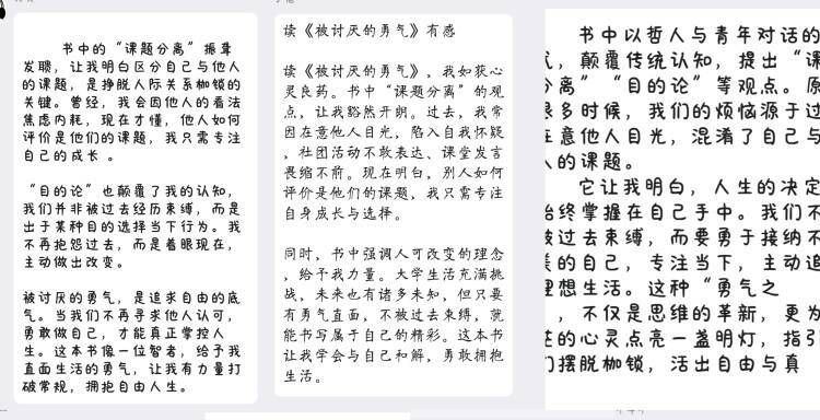活动尾声,参与者们积极分享心得。有人感慨道:“以前总觉得自己的生活被他人的评价和期待填满,看了《被讨厌的勇气》,才明白人生的决定权始终在自己手中。”还有学生表示:“‘课题分离’让我意识到,过去在人际交往中过多干涉他人课题,也让自己背负了不该有的压力,往后要学会专注自身成长。”这些分享不仅是对书籍内容的深刻领悟,更是大家迈向心理自由的有力见证。