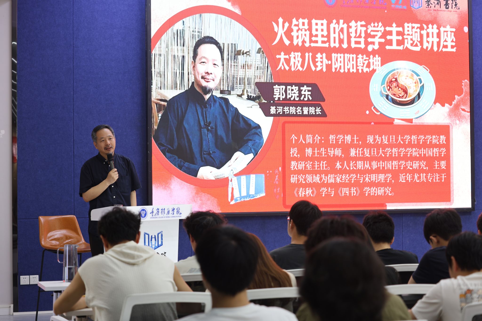 5月18日,校园文化火锅节百人火锅宴盛大开启。在这场将重庆传统饮食文化与书院文化深度融合的盛宴前夕,重庆移通学院綦河书院名誉院长、复旦大学博士生导师郭晓东教授携书院师生踏上了一场火锅文化之旅,在观涛·多功能报告厅开展主题讲座,共同探讨《火锅里的哲学》,将火锅中的鸳鸯锅与太极八卦相结合,领略传统文化与美食碰撞所产生出来的哲学。
