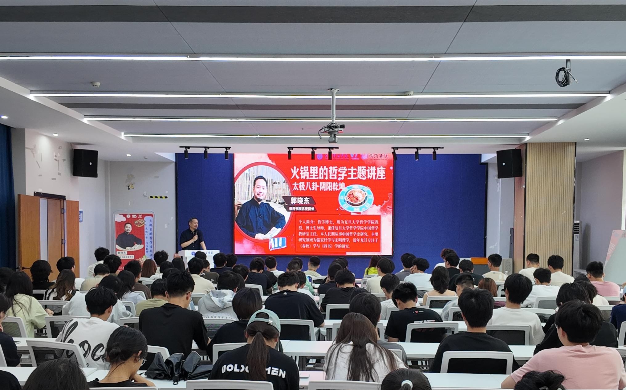 火锅者,阴阳相济之器也。一口铜锅,半白半红,恰似太极两仪。锅中食材,各具卦象。5月18日下午,綦河书院名誉院长郭晓东教授以周易八卦为切入口,结合中国哲学文化中的太极乾坤,为我校师生带来一场有关火锅里的哲学主题讲座,他以鸳鸯锅为喻,生动阐释“太极生两仪”的智慧,清汤为阴,红汤为阳,阴阳二气在沸水中交融激荡,演化出万千滋味。