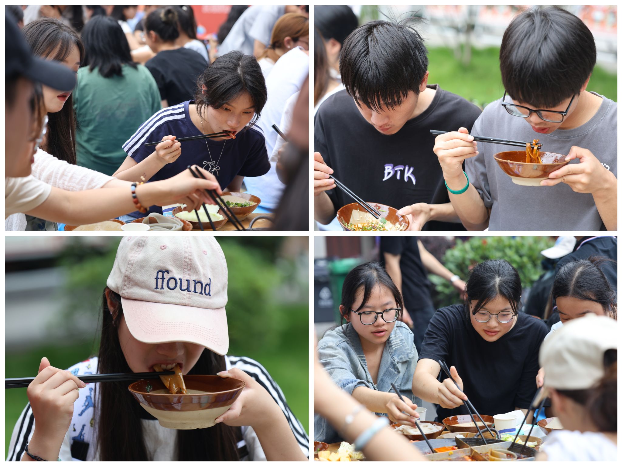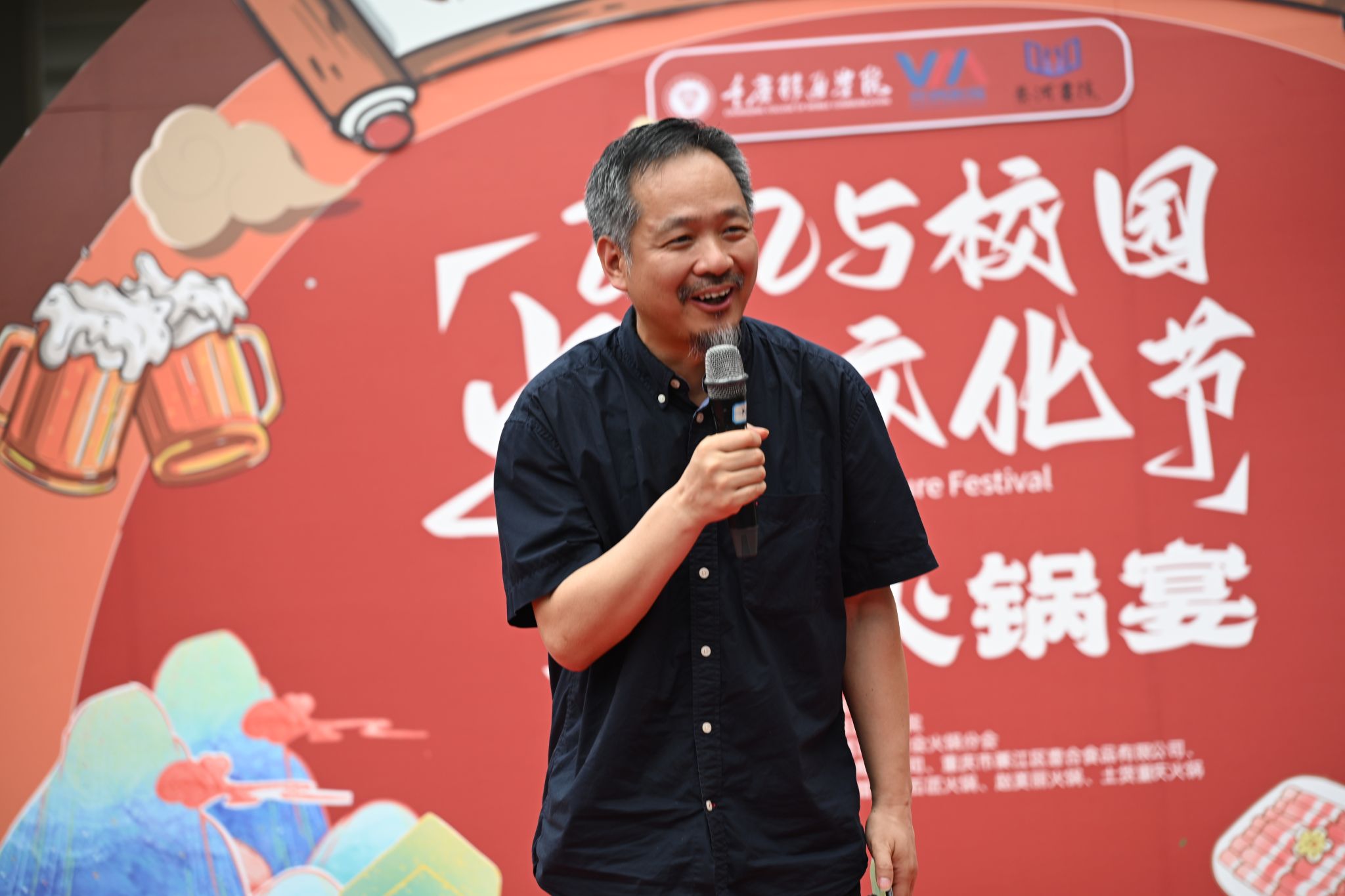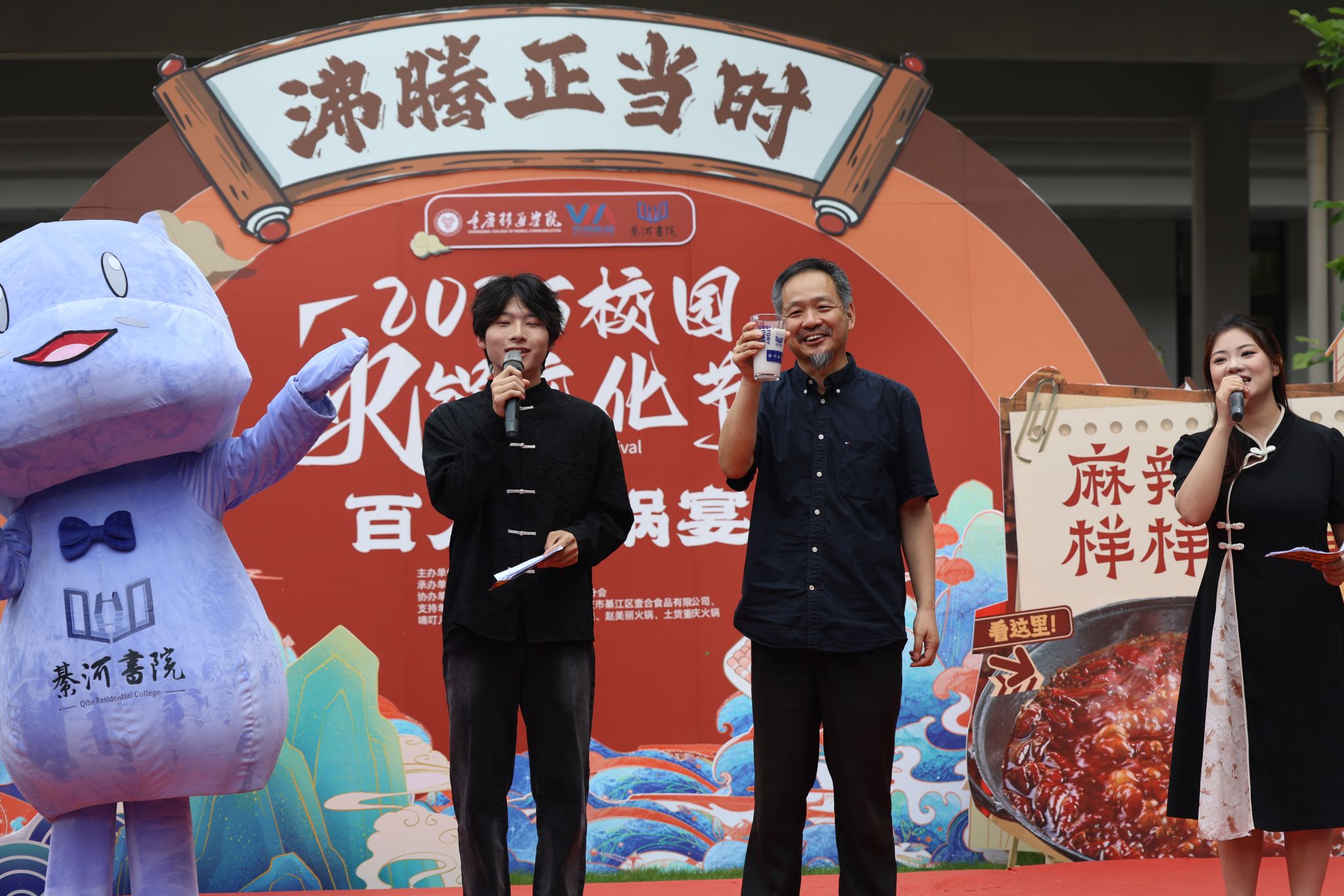 夏日的骄阳让青春之光愈发热烈,綦河书院名誉院长郭晓东教授也现场为移通师生送上了深深的祝福,郭院长从中国哲学的角度讲述火锅文化的历史魅力,结合八卦“变易”思想,解析火锅食材的多样性与人生选择的多元性。随后,郭院长与现场师生共同举杯庆祝这相聚的欢乐时光。火锅沸腾,红油翻涌飘香,三百余名师生举杯笑谈,热气裹着欢闹,筷影纷飞抢食,在举箸涮煮间既品舌尖热辣滋味,更悟文化调和之道,共同见证了一场“从舌尖到心间”的文化共振。