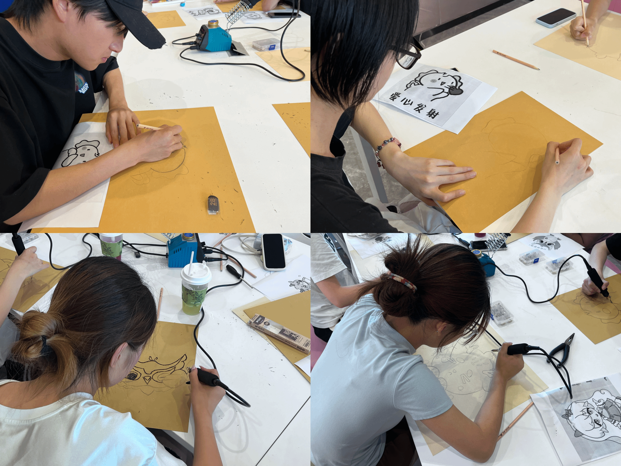 知以驭行,行以固知。在亲自创作的过程中,同学们耐心地用铅笔绘制草稿,相互交流创意,随着时间的推移,各个书院的IP形象映入眼帘。你可以忠实还原IP的经典形象,让烙痕成为书院精神的“立体印章”;亦可展开想象的翅膀,为萌宠添上诗意细节——或是让lumi追逐月光于山水烙纹的褶皱里,或是让侠客仗剑而行于山水烙纹间,或是让云仔“坐看云起”于木纹的云卷云舒中。也可以尝试技法创新,以点烙之法模拟星空璀璨,以线烙之笔勾勒衣袂风流,让传统技艺在现代创意中迸发新生。