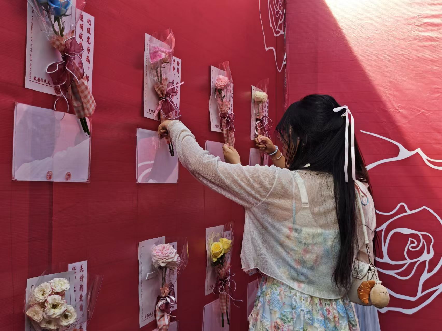 暮色中轻盈跃动的音符,裹挟着未言说的心事,化作一场蓄谋已久的浪漫旋律。参与者们提前将心仪曲目写进点歌卡,让每一首歌曲都成为情感的密钥。勇敢的“告白者”们拿起话筒,用歌声编织属于众人的浪漫回忆。台上奏响的旋律与台下静待的玫瑰谱成浪漫的复调。