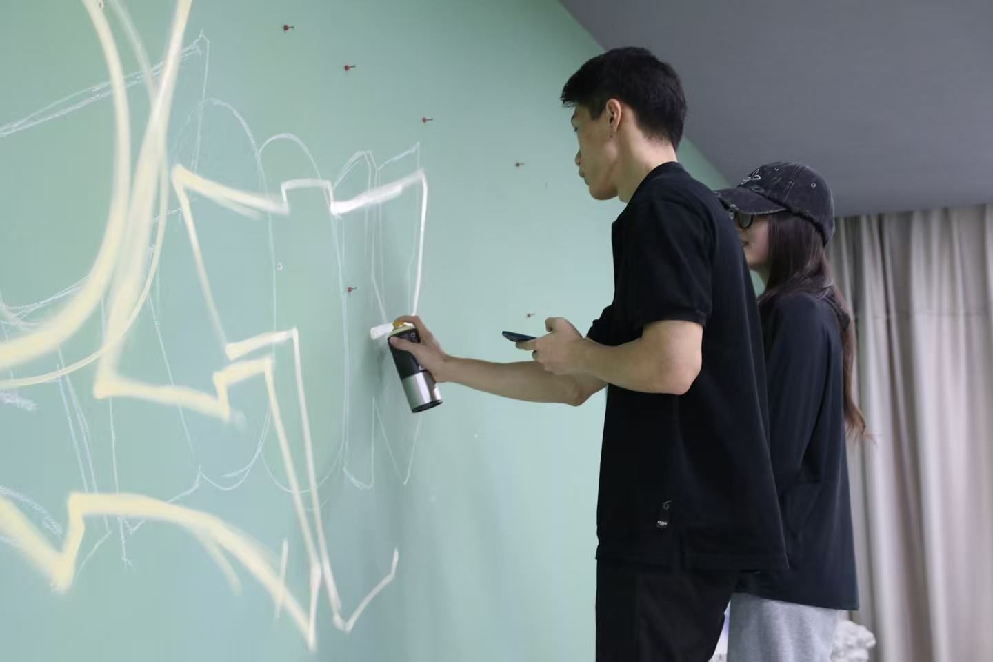 “老师,我们有个超棒的设计方案!”Splatoon涂鸦工作室的同学们带着精心准备的改造方案,主动敲开了书院办公室的大门。这场关于书院空间优化的“创意讨论会”瞬间点燃了师生们的热情。讨论过程中,同学们充分展现了主人翁精神。他们不仅深入挖掘书院“绿色”主色调所象征的生机与希望,更巧妙融入涂鸦工作室标志性的“splatoon”元素。一个个创意在激烈讨论中碰撞:如何平衡书院文化底蕴与青春活力?色彩搭配如何体现书院特色?经过数轮头脑风暴,最终敲定了以喷漆绘制为主的墙面设计方案。