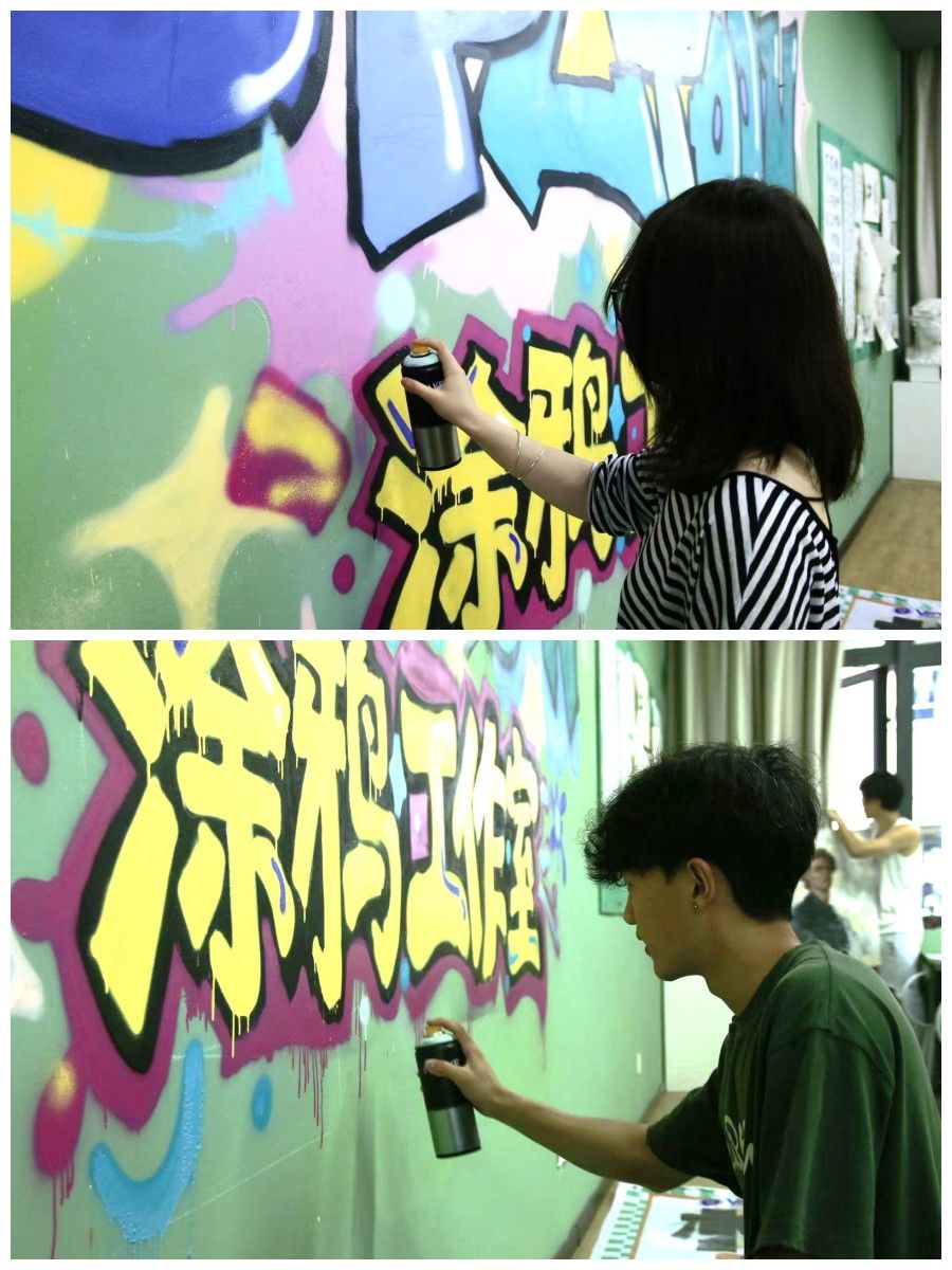 同学们发挥自己的专业特长,在诗画工坊里开启了一场超带感的“空间变形记”!创作过程中,每位同学都全情投入:有的专注勾勒线条轮廓,有的精心调配色彩比例,还有的负责整体构图把控。他们手中的画笔仿佛被赋予了魔力,线条在他们手中也仿佛有了生命,色彩碰撞出惊艳的视觉火花,独特的涂鸦符号像青春密码般在墙面肆意生长,原本“素颜”的墙面瞬间变身街头艺术展。在这40㎡的创意空间里,同学们尽情挥洒艺术才华,用色彩与线条为书院注入全新的活力。