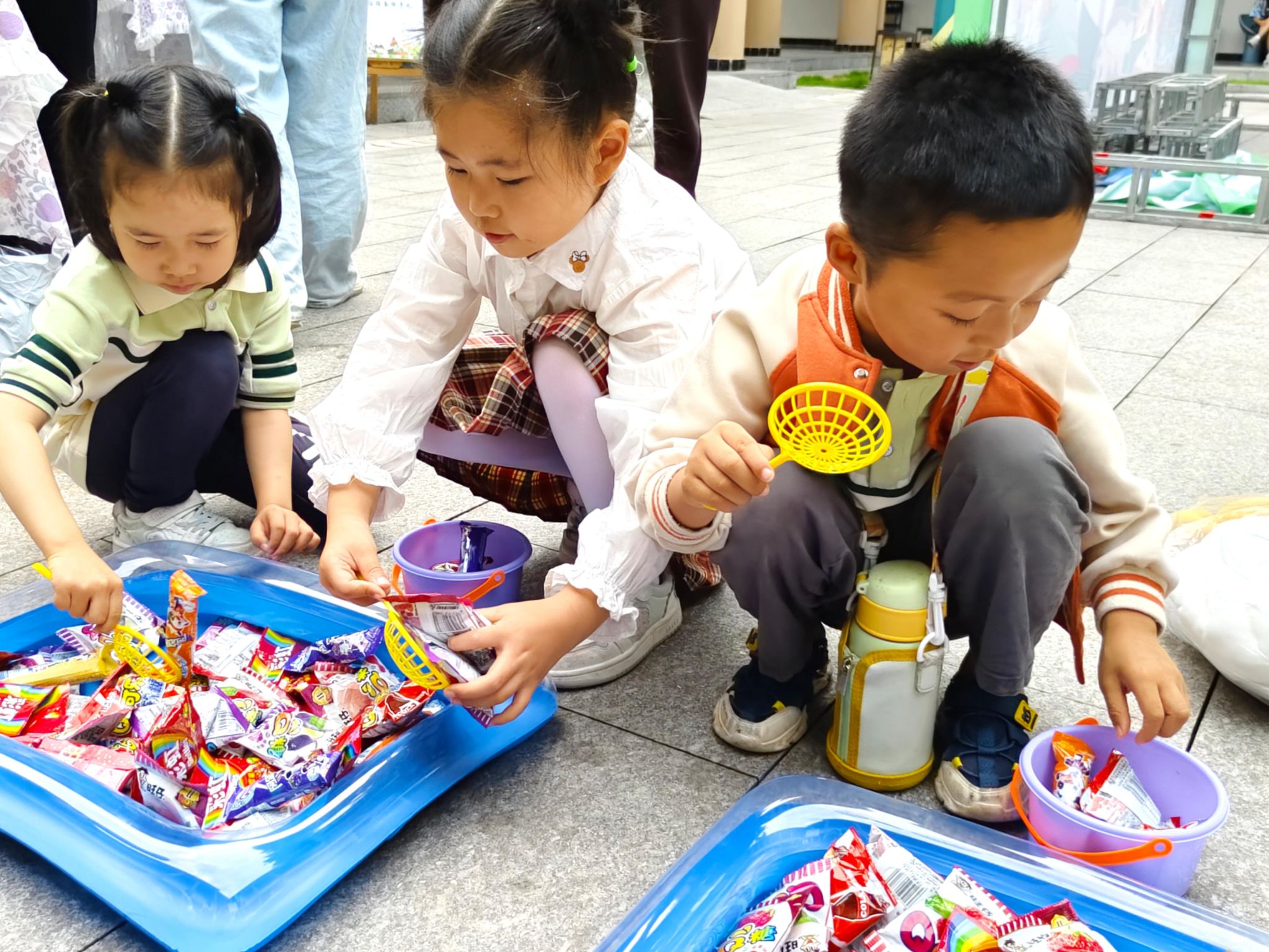 与此同时,不远处的糖果矿工区则是一片“寻宝”景象。家长和孩子大手握着小手,五彩斑斓的糖果如同七彩宝石般纷纷“破土而出”,在阳光下闪闪发光。
