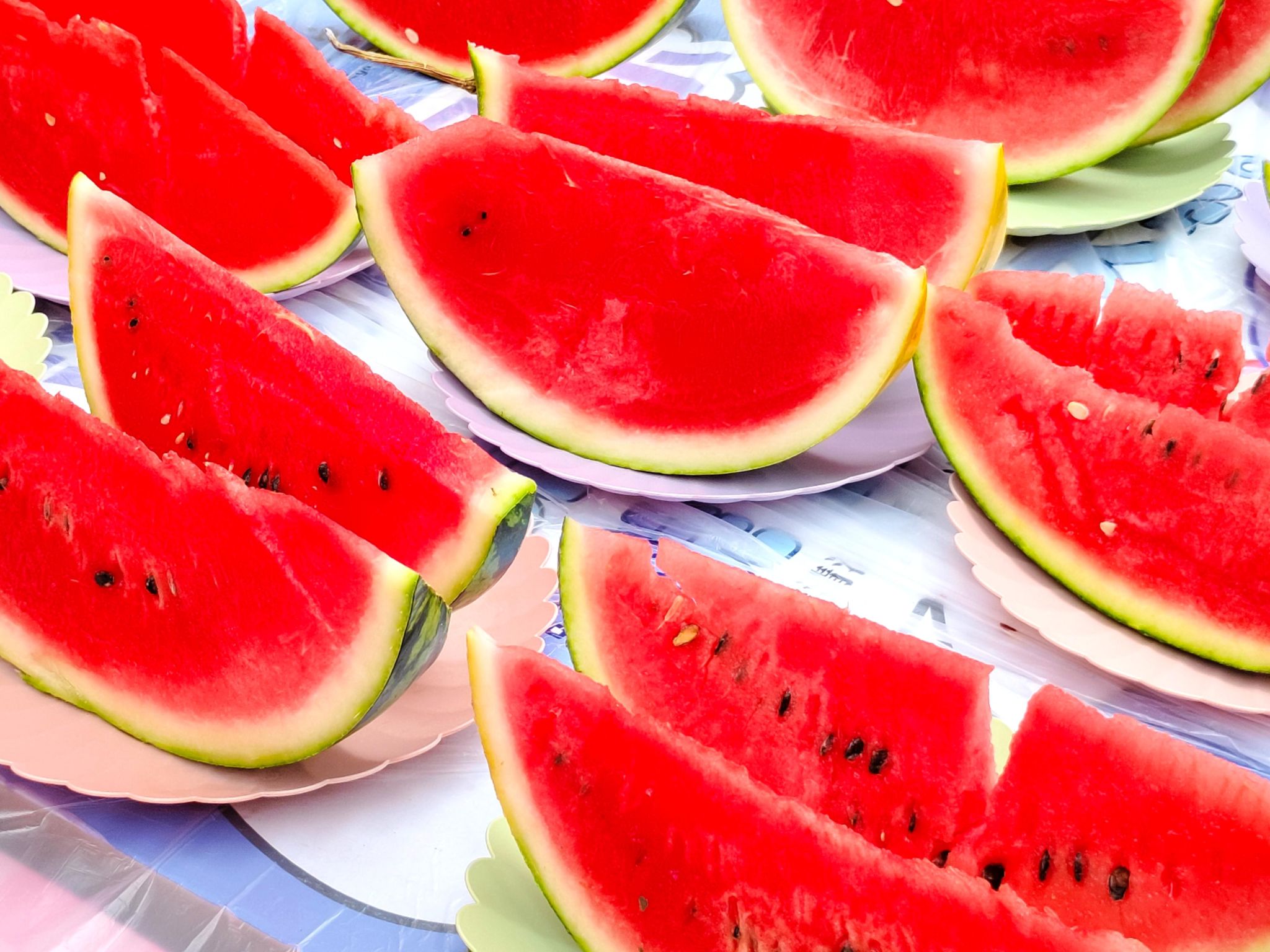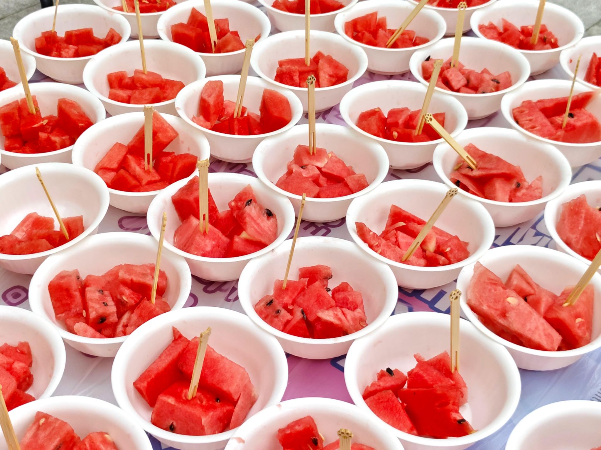 更贴心的是,西瓜的“武装”还因人而异,充满了巧思!为了照顾小朋友们灵巧的小手和食量,主办方特意将部分西瓜切成小巧玲珑的方块或三角块,整整齐齐地码放在一个个色彩鲜艳的小碗里,方便小家伙们稳稳当当地端着吃,完全不用担心滑落。而给老师们准备的,则是豪迈又解渴的大瓣西瓜,红瓤饱满,绿皮清脆,拿在手里沉甸甸的,一口咬下去汁水丰盈,瞬间驱散忙碌带来的燥热。