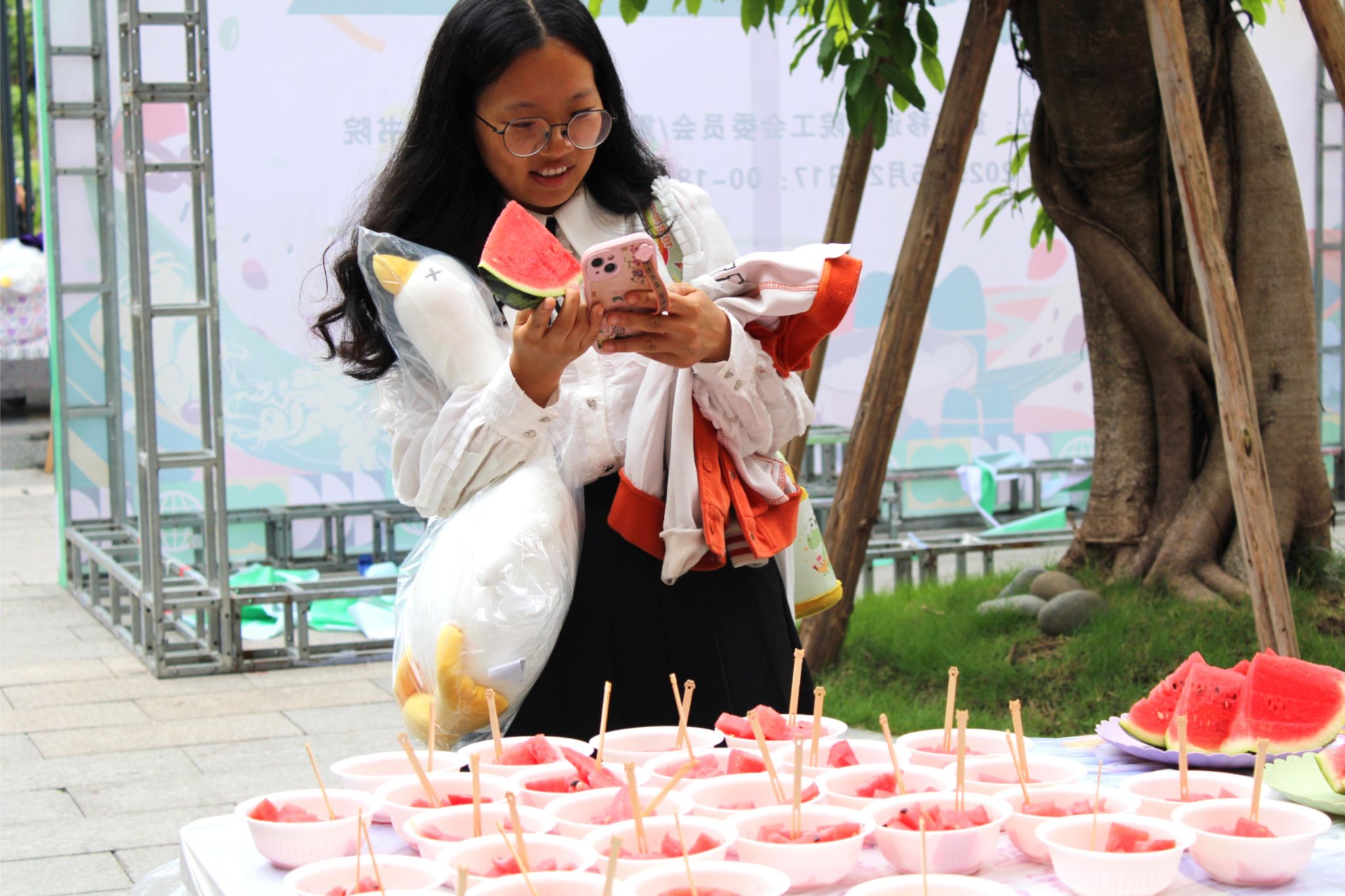 当夏日的阳光变得热烈,“西瓜大作战区”瞬间化身为整个活动现场最受欢迎、最“清凉”的欢乐堡垒!一眼望去,长条桌上早已严阵以待,铺满了工会精心准备的西瓜,光是看着就让人暑意消了大半。