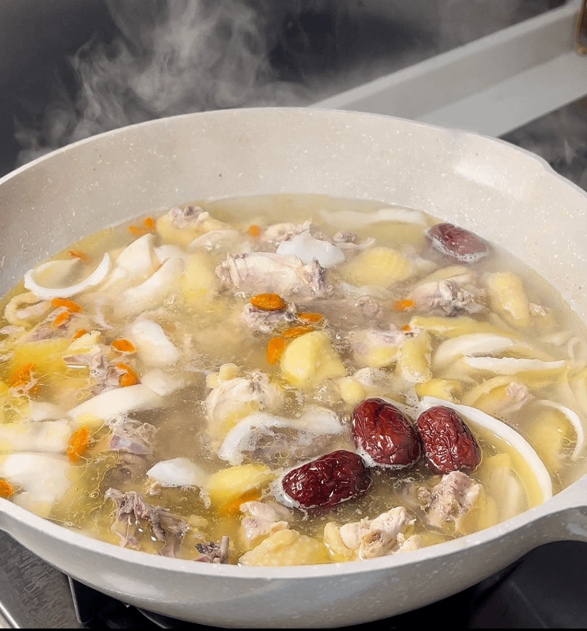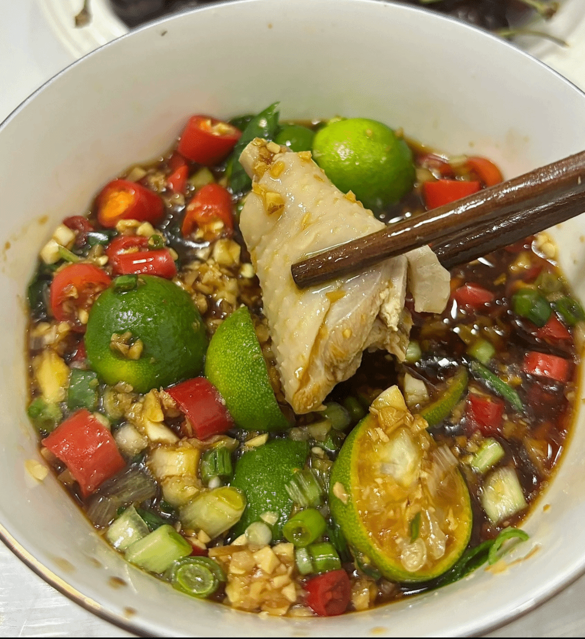 同学们合作,取新鲜椰青之水,削壳取椰肉备料;清甜的果香立刻充盈四周。精选的鸡肉切块经温水轻洗、海盐揉捏提鲜。锅中,椰汁与现打的椰肉浆交融,再添红枣枸杞,同熬一锅清甜底汤。待微沸,同学将腌好的鸡肉块逐一投入轻轻搅匀。煮沸后转小火慢焖15分钟,细心撇去浮沫。关火静待,椰肉与鸡的香在厨房氤氲开来。掀盖时,只见鸡汤澄澈泛着诱人金色油花。 大家围拢品尝,舀一勺汤:清润甘甜,椰韵悠长;夹一块鸡肉:嫩滑易脱骨。蘸一点青柠酱汁入口,酸甜醒味交织着咸鲜,是沁人的海南岛风味。