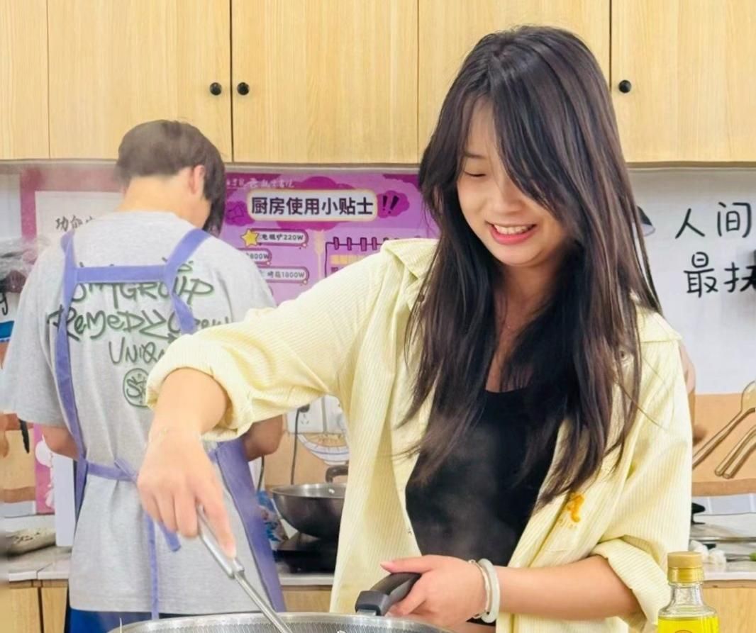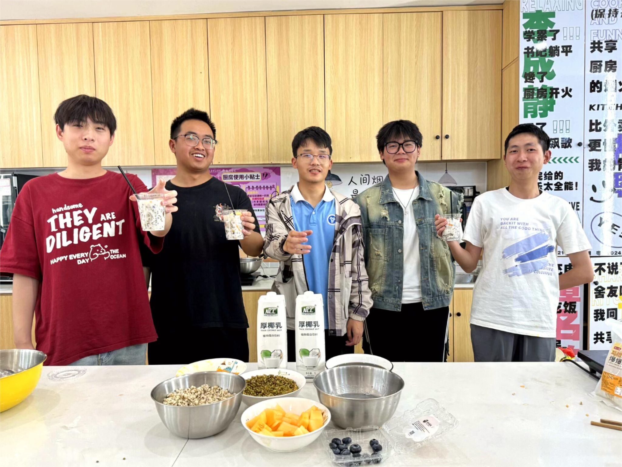 共享厨房里,下午的阳光懒懒地洒进来,落在围在操作台边的同学们身上。备好的椰浆、牛奶、细砂糖、泡软的吉利丁片和细椰蓉整齐摆放在案板上。其中的一位同学开始调制椰浆,将乳白的椰汁和砂糖一起倒进锅里搅拌。“慢点搅,糖要化匀。”身旁的同学自然地递上工具,轻声提醒着。灶台边另一个同学专注地盯着温度计,“快好了!”他向伙伴们示意,待温度刚好便小心地融入软化的吉利丁,细心搅拌至丝滑。“小心烫,我移锅。”男生说着将温暖的椰奶浆安全放置。同学们默契配合,你扶模具我盛浆,共同把那份香甜小心翼翼地注入格子中。随后,把模具一起送进冰箱冷藏。