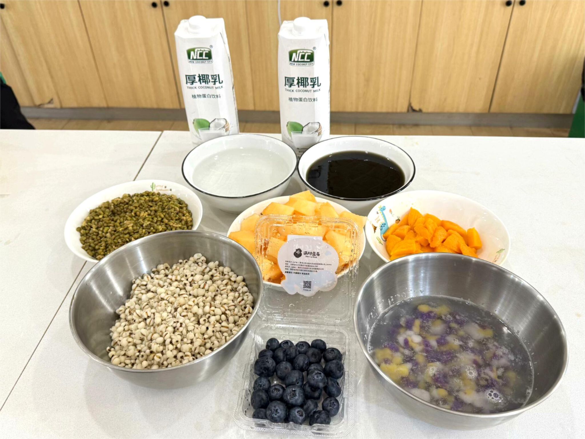 清补凉,这名字便透着凉意,是海南街头广受欢迎的经典甜品。区别于广东的药材汤版本,它是以清凉的椰奶为底,豪爽加入十多种配料的甜蜜盛宴,堪称“甜品界的满汉全席”。制作时,同学们默契配合:细心拣净薏米杂质,提前浸泡好红豆、花生等耐煮食材;随后按耐煮程度分锅处理——先将西米中火慢煮至饱满透亮后捞出过凉,再依次煮好软糯起沙的绿豆、恰到好处弹韧的芋圆等。当各色煮透晾凉的豆类、丸子与新鲜切块的水果在台前摆开,丰沛色彩预示着成品的诱人。