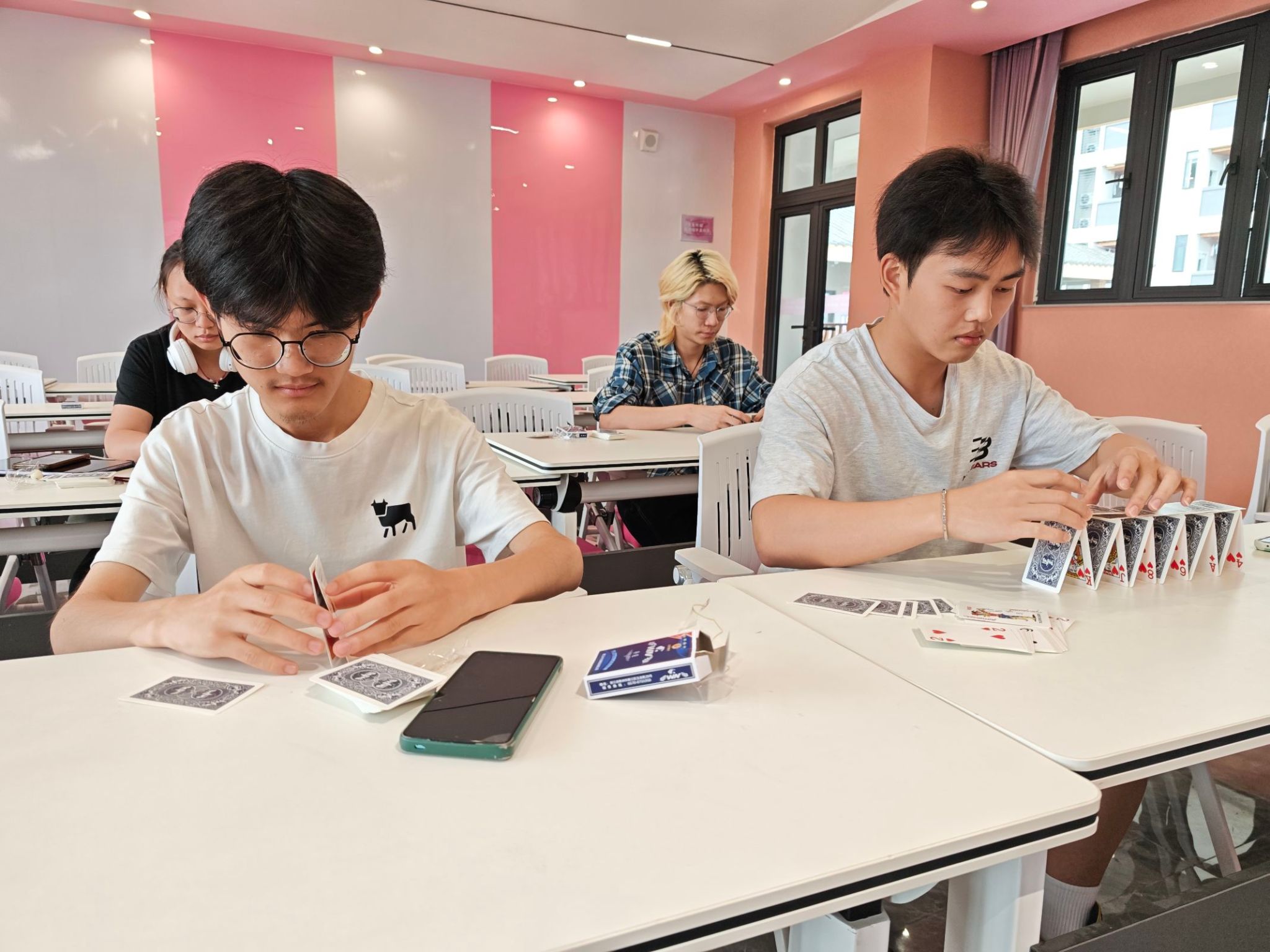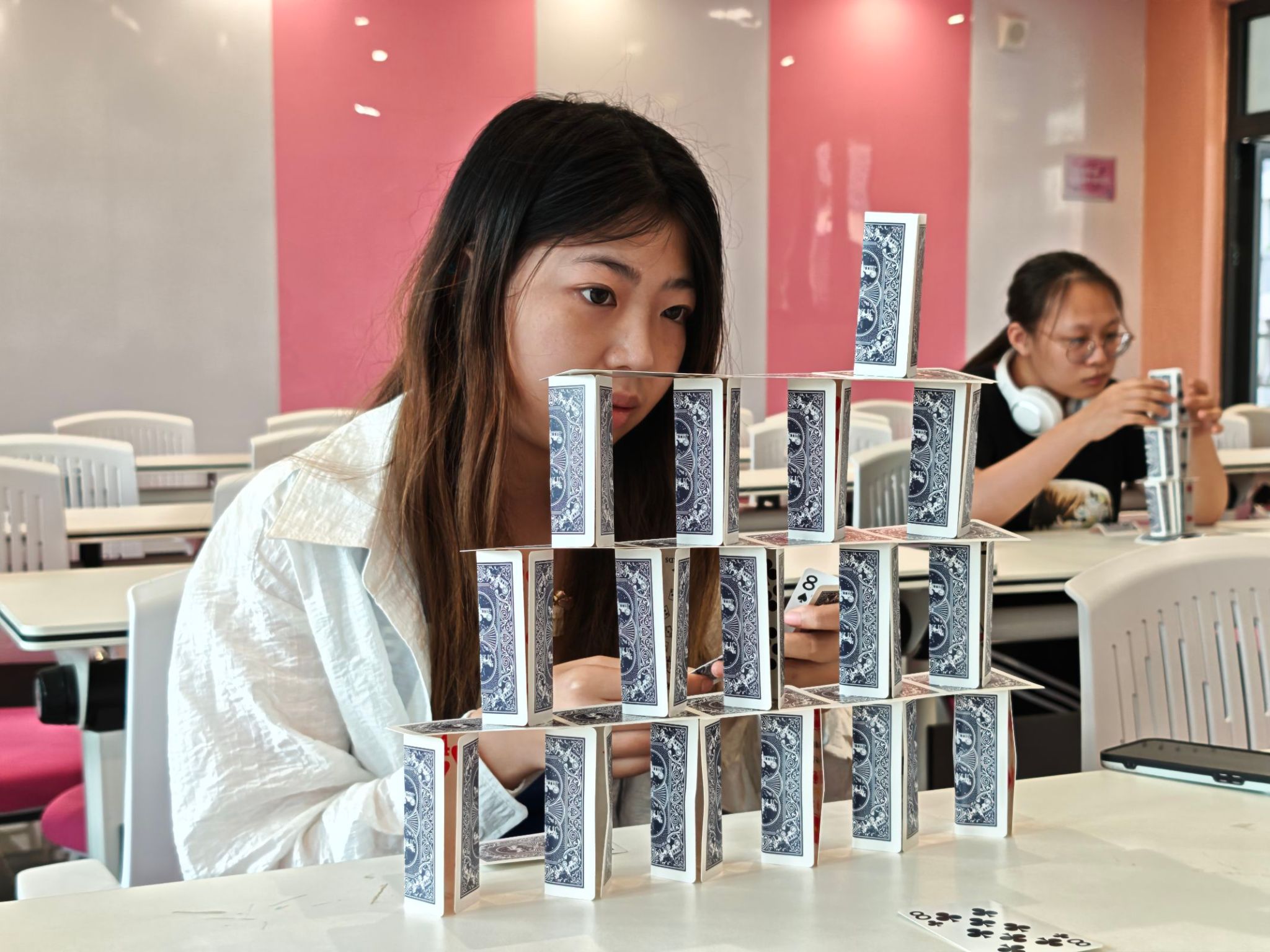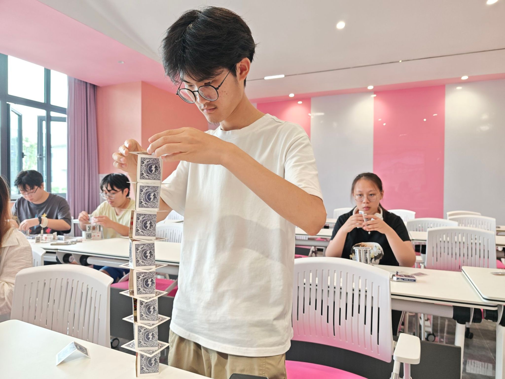 5月的最后一期“书院一小时”回归理性探索。在科学角,“纸牌堆高塔”挑战激发了同学们的奇思妙想与工程思维。仅凭一副普通纸牌,参与者需巧妙运用力学平衡原理,不断尝试结构策略,力求搭建出稳固而高耸的纸塔。每一次成功的堆叠都带来喜悦,每一次倒塌则引发新的思考与优化。这充满趣味与挑战的一小时,将抽象的科学原理具象化,让同学们在动手实践中深刻领悟了结构力学与耐心、策略相结合的重要性。